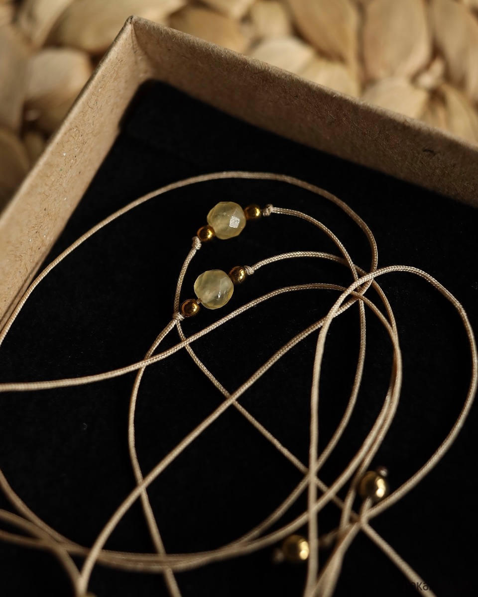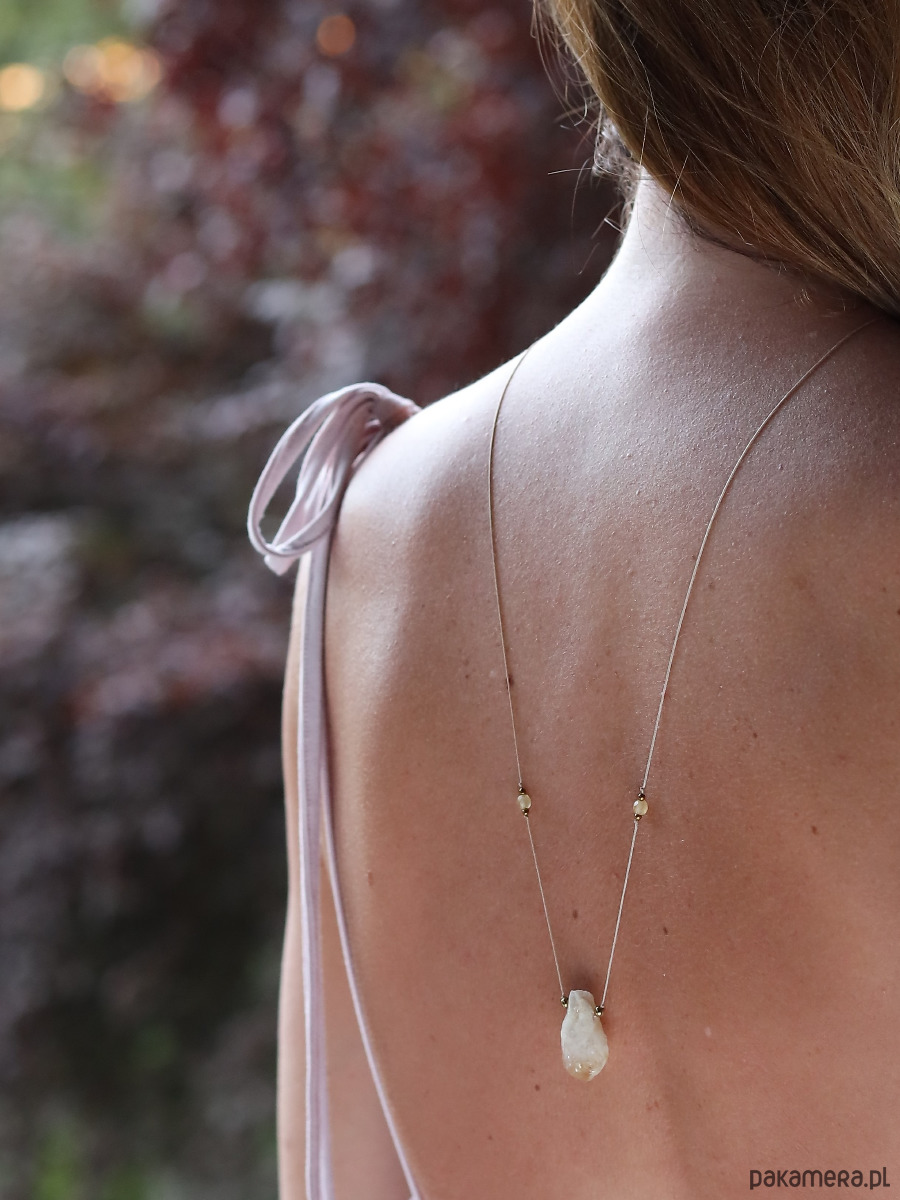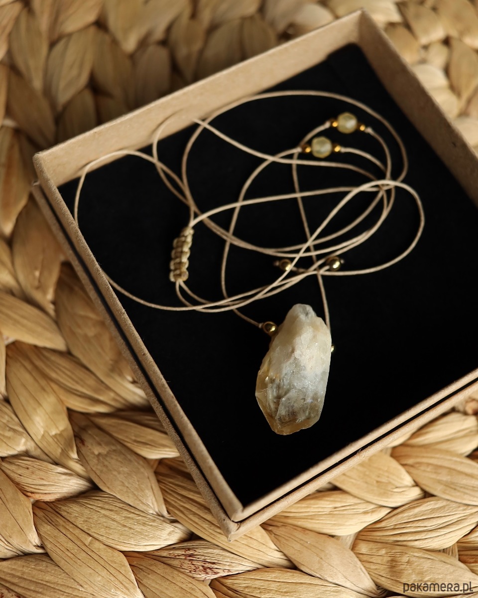 Delikatny naszyjnik z surową bryłką cytrynu zawieszoną na cienkim, beżowym sznureczku. Dodatkowy element ozdobny to koraliki z kalcytu i złotego hematytu. Długość naszyjnika można dowolnie regulować, dzięki przesuwanemu "zapięciu" typu makrama.