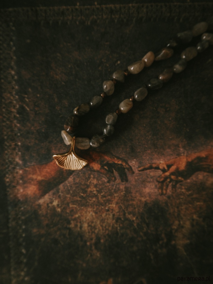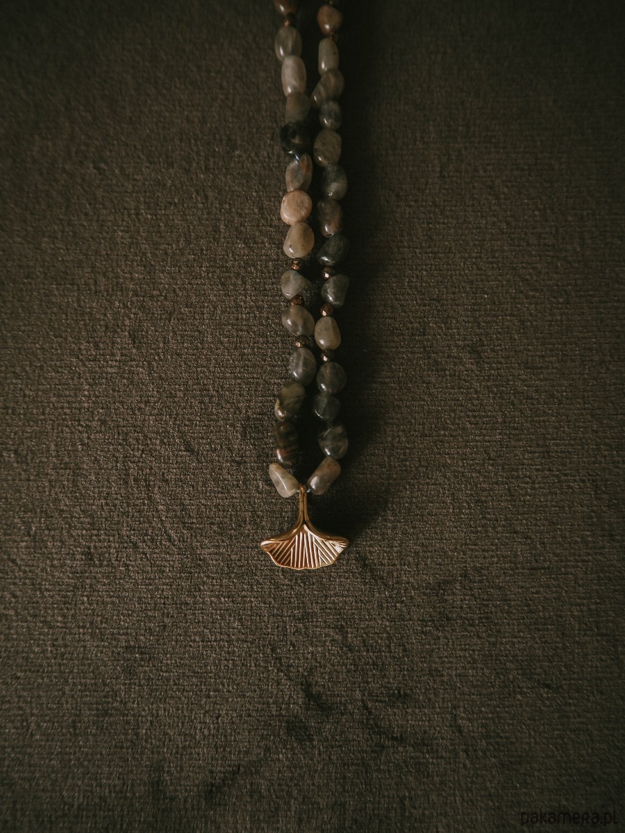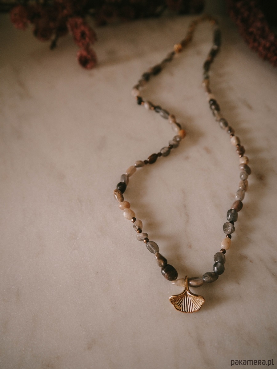 Centralnym akcentem jest zawieszka w kształcie liścia miłorzębu – symbolu siły, równowagi i długowieczności. Jego organiczna forma pięknie komponuje się z naturalnymi kamieniami, tworząc harmonijną całość inspirowaną naturą.