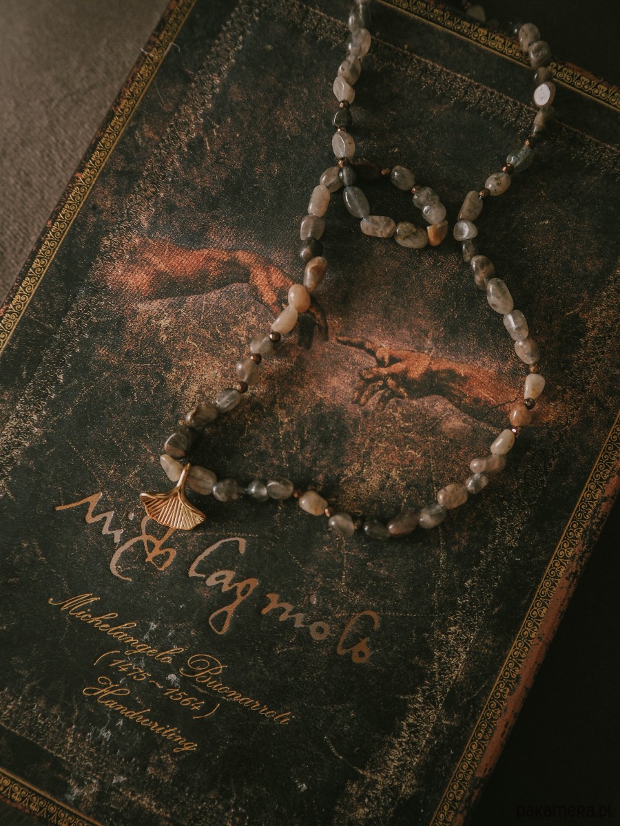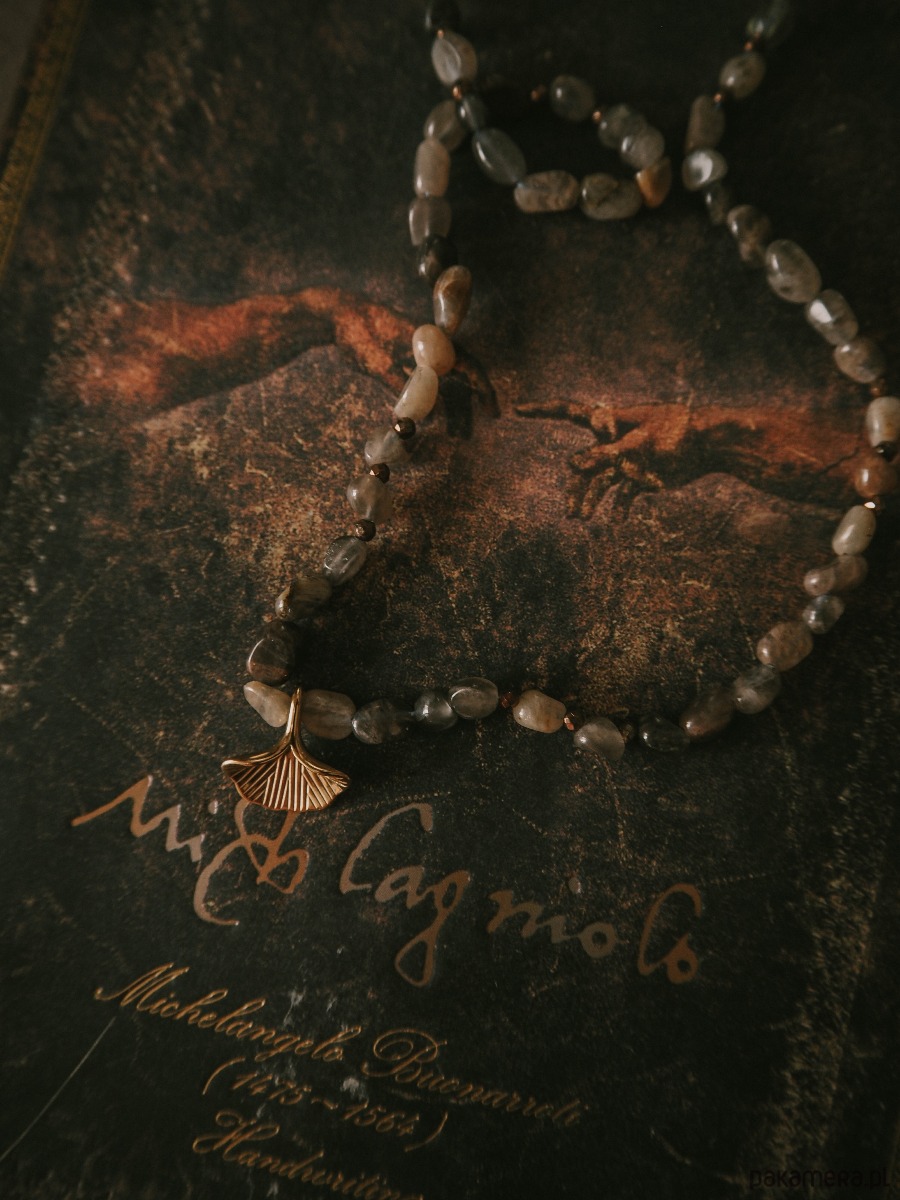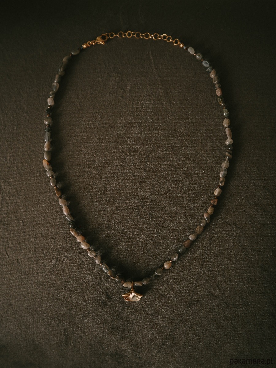 Centralnym akcentem jest zawieszka w kształcie liścia miłorzębu – symbolu siły, równowagi i długowieczności. Jego organiczna forma pięknie komponuje się z naturalnymi kamieniami, tworząc harmonijną całość inspirowaną naturą.