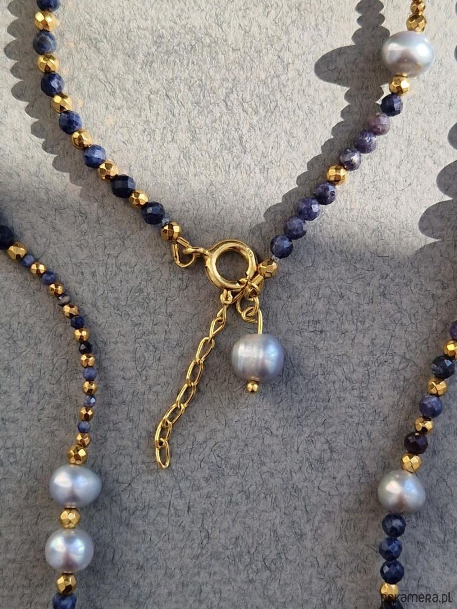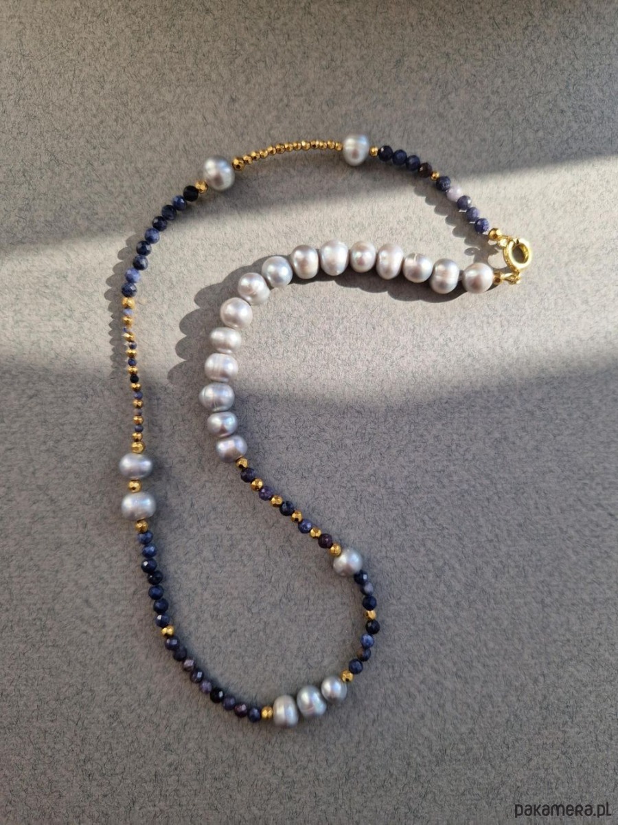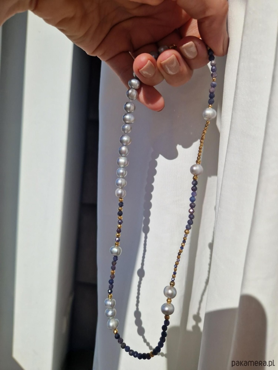 Naszyjnik wykonany ręcznie z niebieskich szafirów i szarych, naturalnych pereł. Jego abstrakcyjny wzór podkreślają złote kulki hematytów, które kontrastują z chłodem szafirów i szarych pereł. Niezwykła kompozycja, która uszlachetni niejeden outfit. Świetnie pasuje do ciemnych jeansów, bieli, jak i różu. Z bliska wygląda jeszcze piękniej. W innej mojej ofercie możesz znaleźć bransoletkę do kompletu (widoczna na pierwszym i ostatnim zdjęciu).