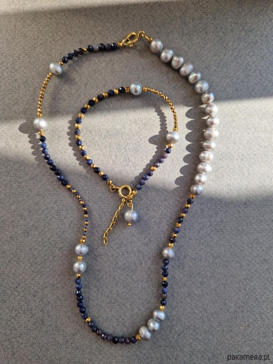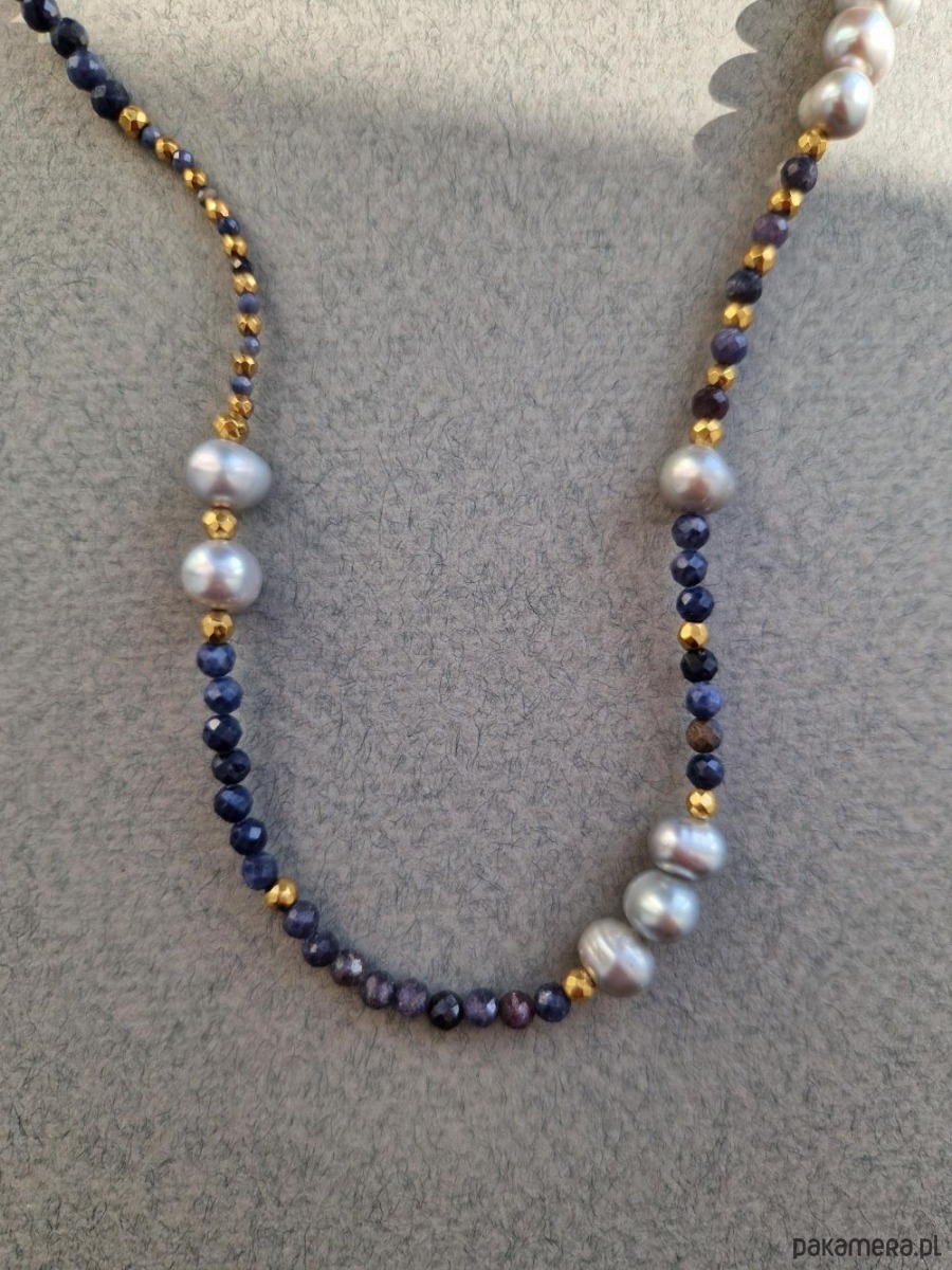 Naszyjnik z szarych pereł i niebieskich szafirów 50 cm