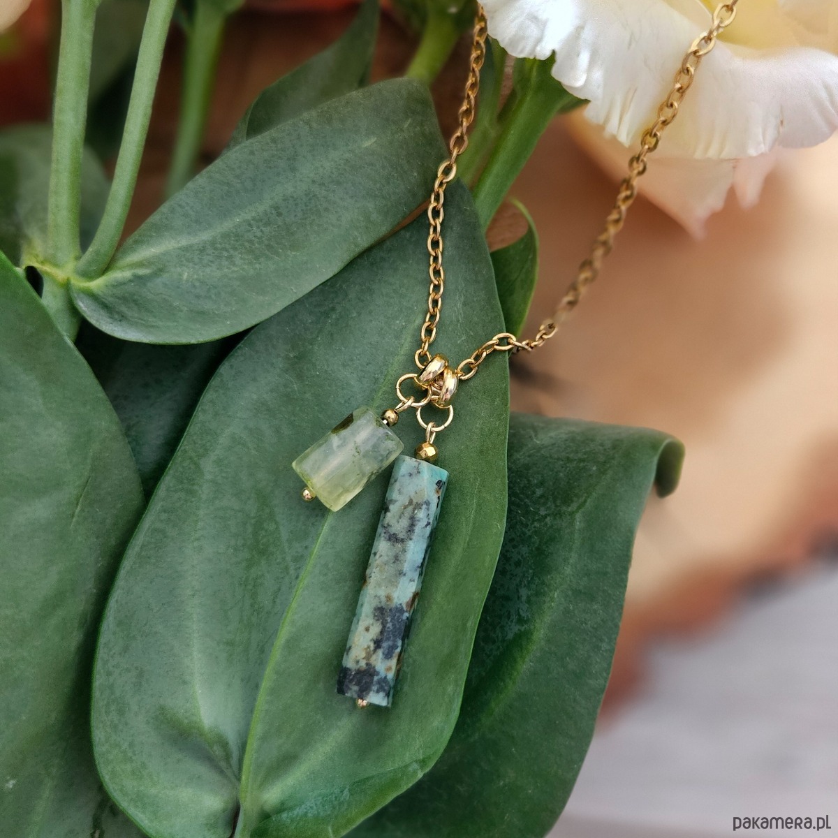 Wyrazisty naszyjnik z turkusem afrykańskim i frenitem. Mocny akcent stylizacji – naszyjnik łączący surowość minerałów w formie bryłek oraz delikatną elegancję dodatków ze stali szlachetnej. Frenit i turkus afrykański to dwa odcienie zieleni, od których trudno oderwać wzrok. Będą energetycznym dodatkiem Twoich wiosennych stylizacji, a długi łańcuszek regulacyjny pozwoli na noszenie biżuterii w wielu konfiguracjach.