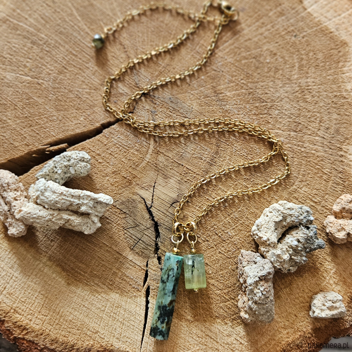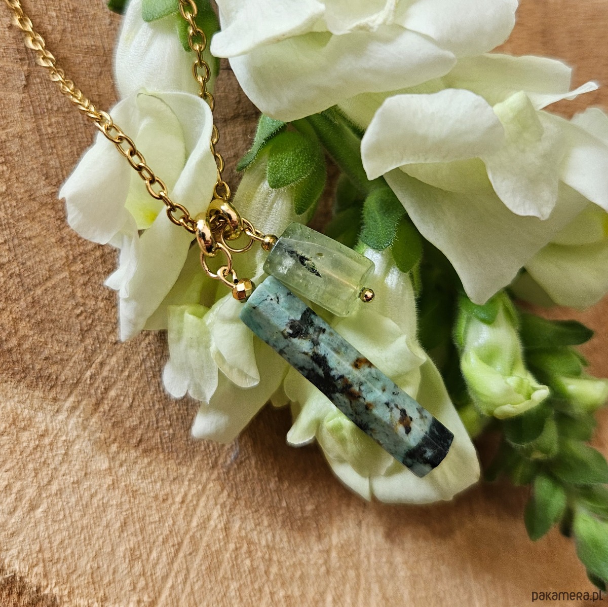Wyrazisty naszyjnik z turkusem afrykańskim i frenitem. Mocny akcent stylizacji – naszyjnik łączący surowość minerałów w formie bryłek oraz delikatną elegancję dodatków ze stali szlachetnej. Frenit i turkus afrykański to dwa odcienie zieleni, od których trudno oderwać wzrok. Będą energetycznym dodatkiem Twoich wiosennych stylizacji, a długi łańcuszek regulacyjny pozwoli na noszenie biżuterii w wielu konfiguracjach.