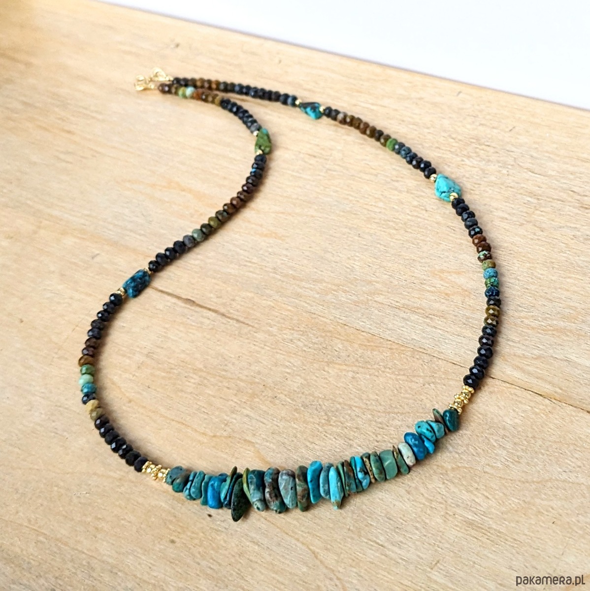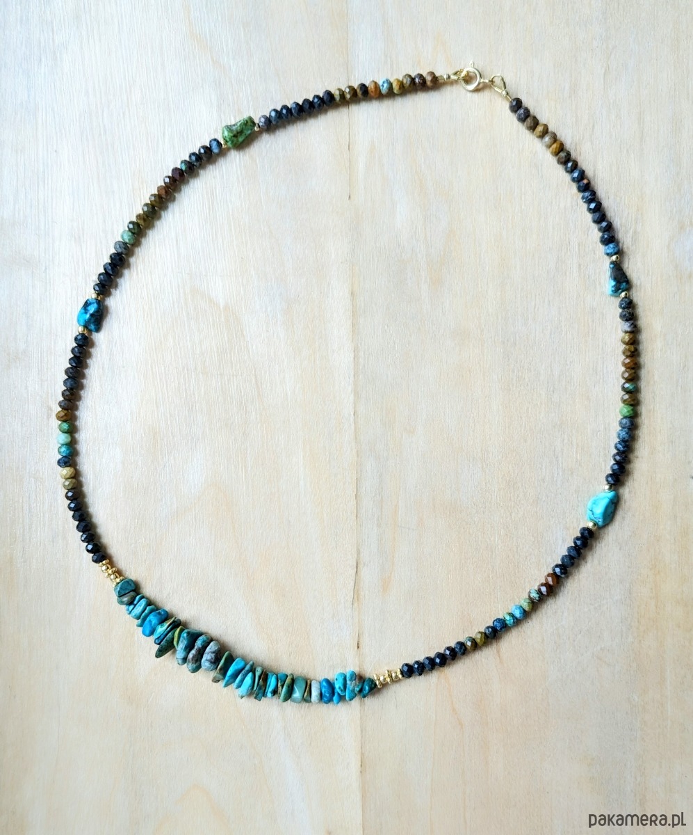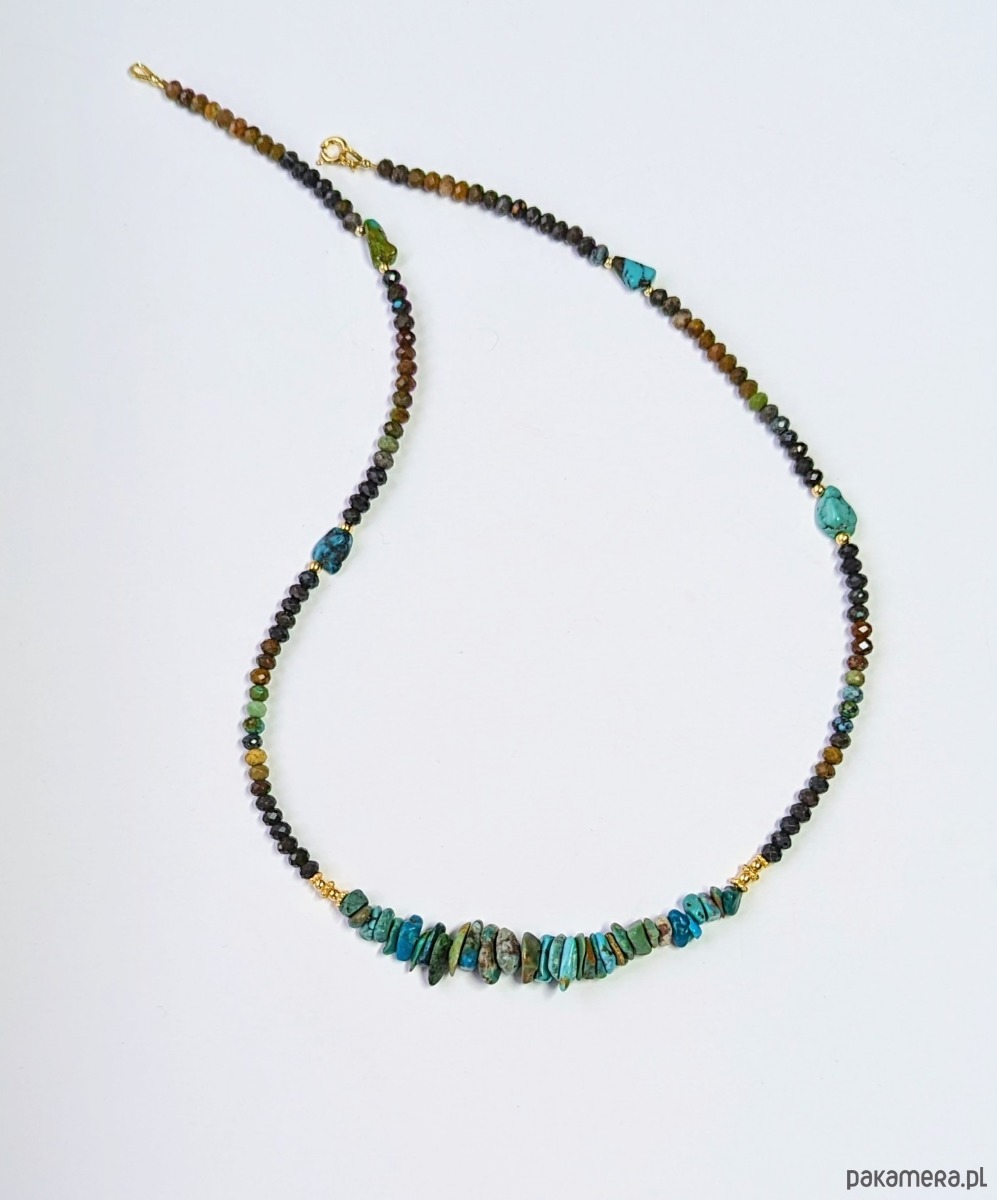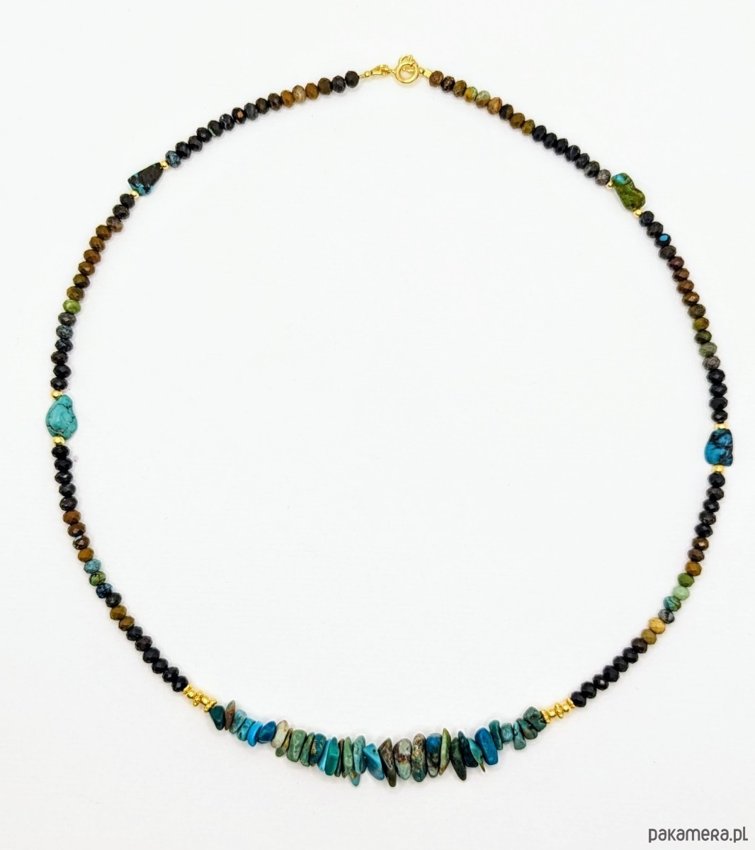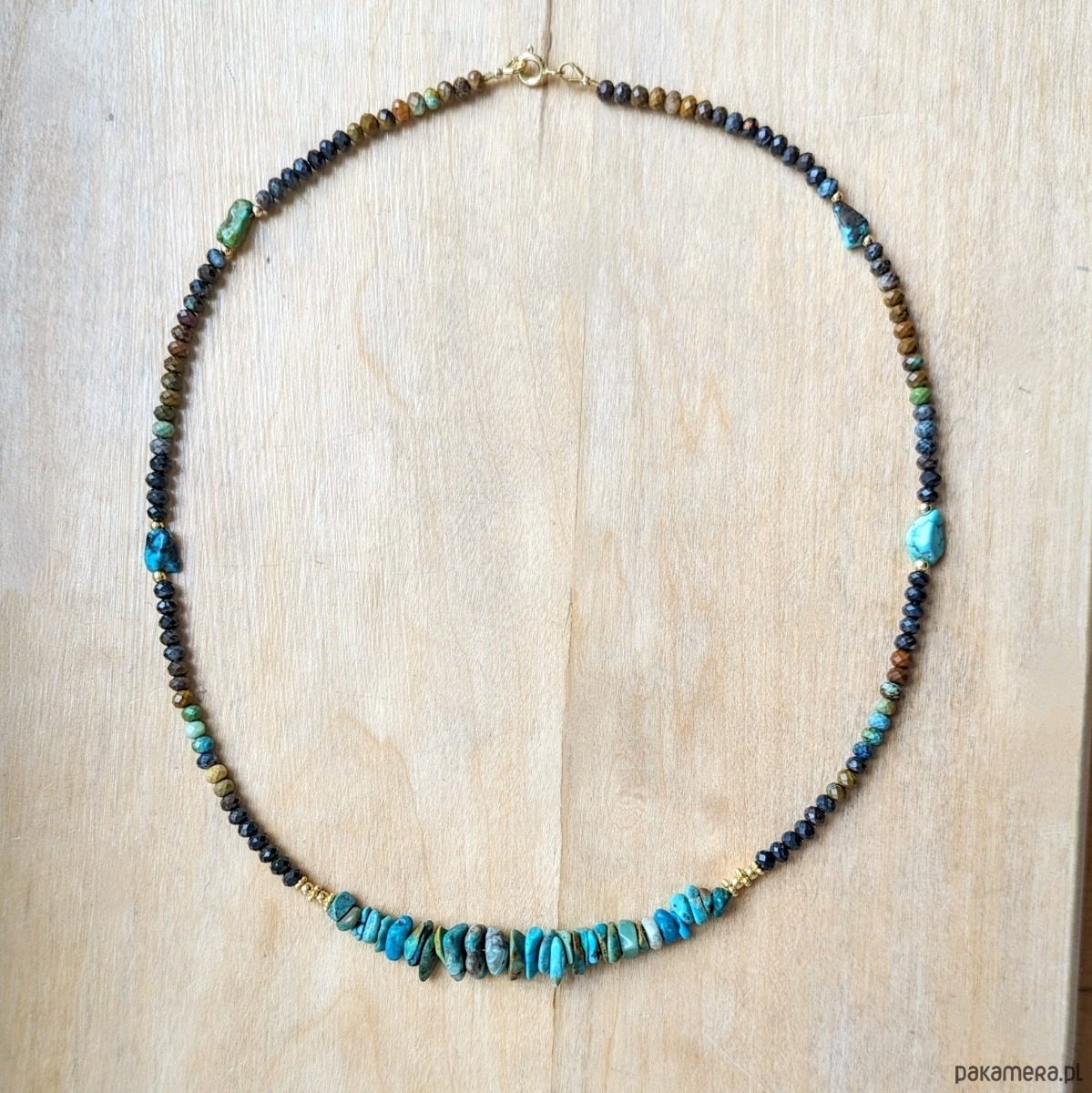 Kolejny naszyjnik z naturalnymi turkusami w intensywnej barwie. Dominują jasne i bardzo ciemne brązy, z delikatnym dodatkiem zieleni i błękitu. Punktowo zostały ułożone bryłki nieregularnego niebieskiego turkusu. Powstało intensywne ombre z pięknym kontrastem przypalonego brązu i morskich odcieni. Wykończenie w pozłacanym srebrze.