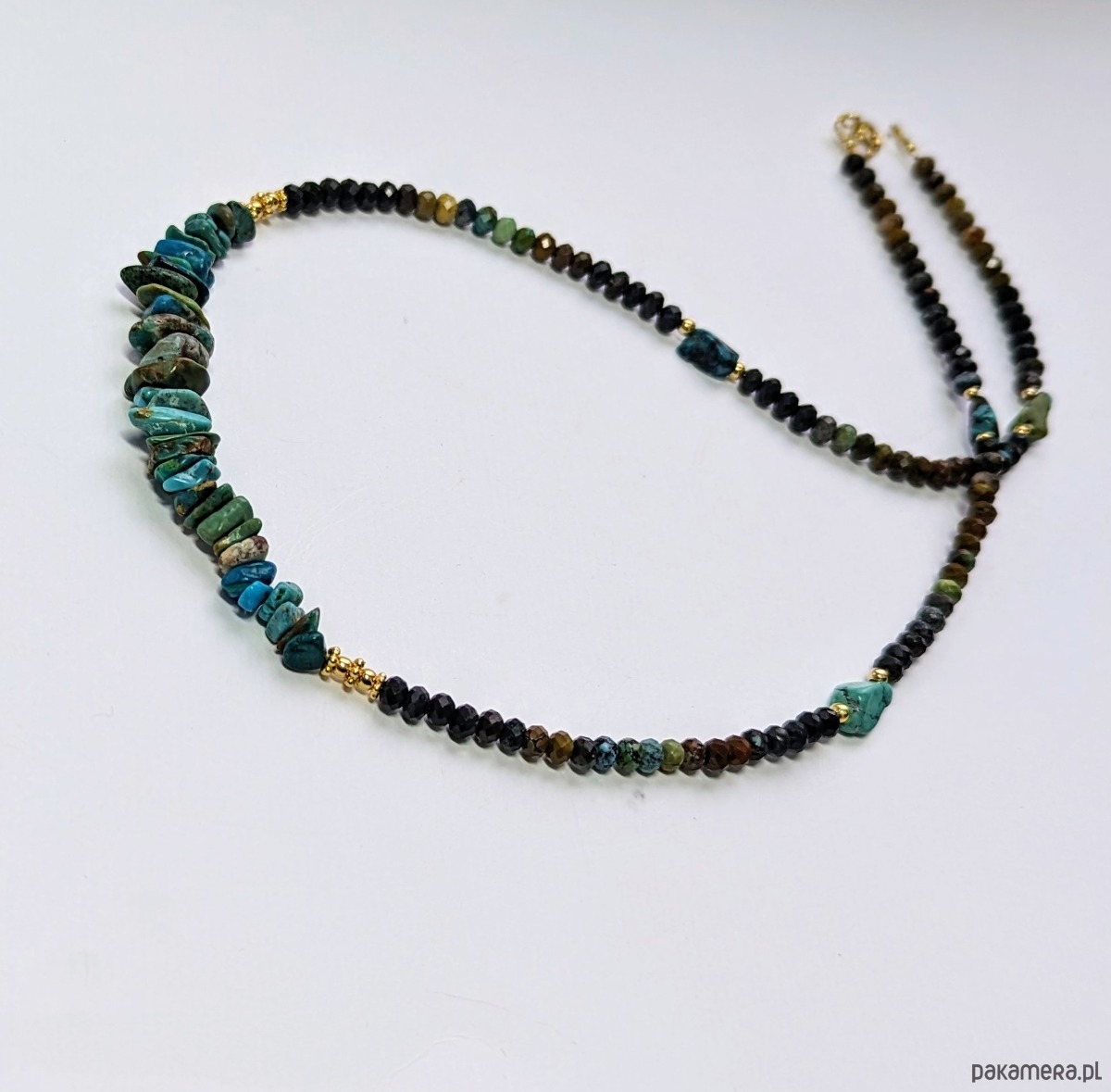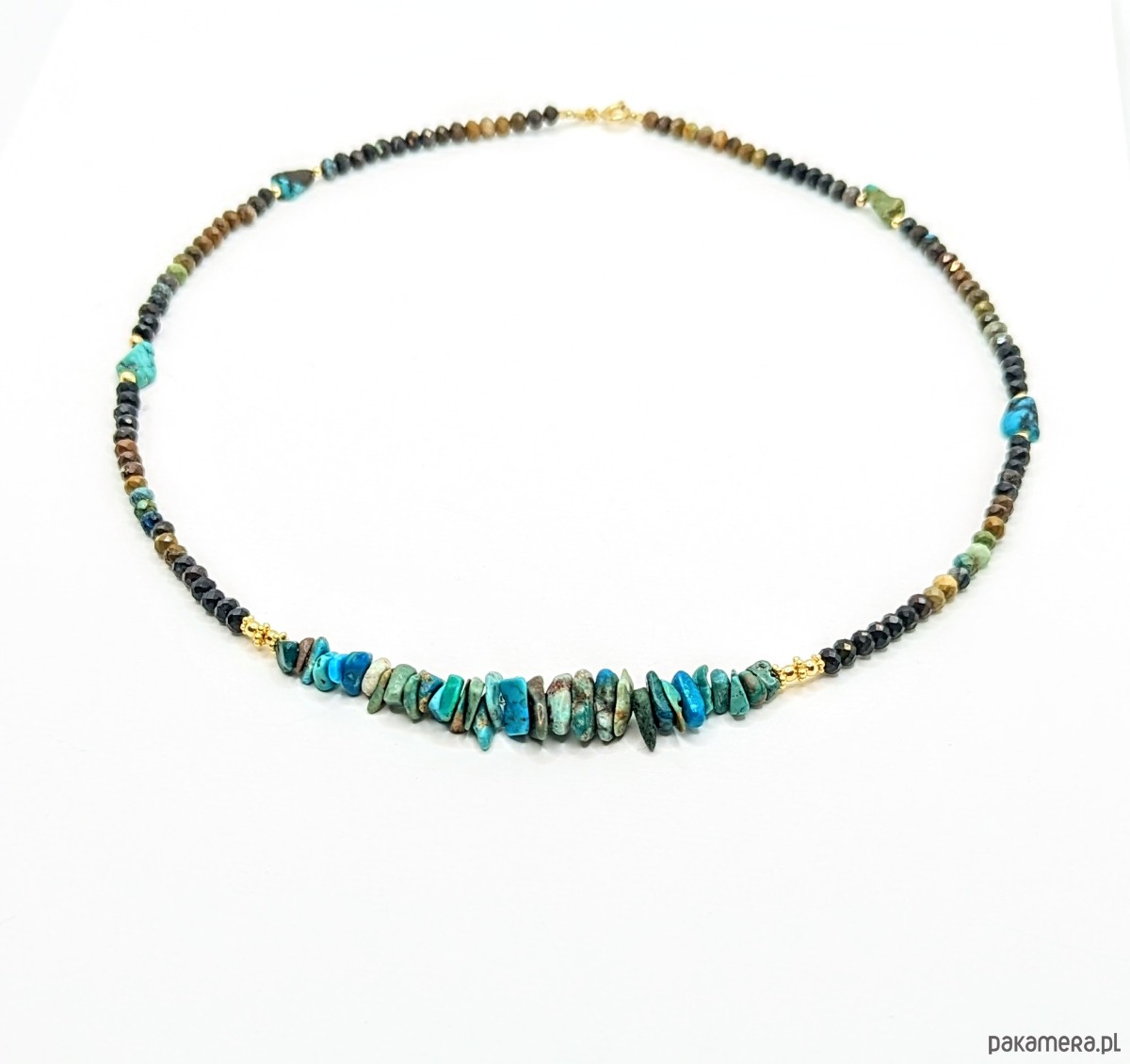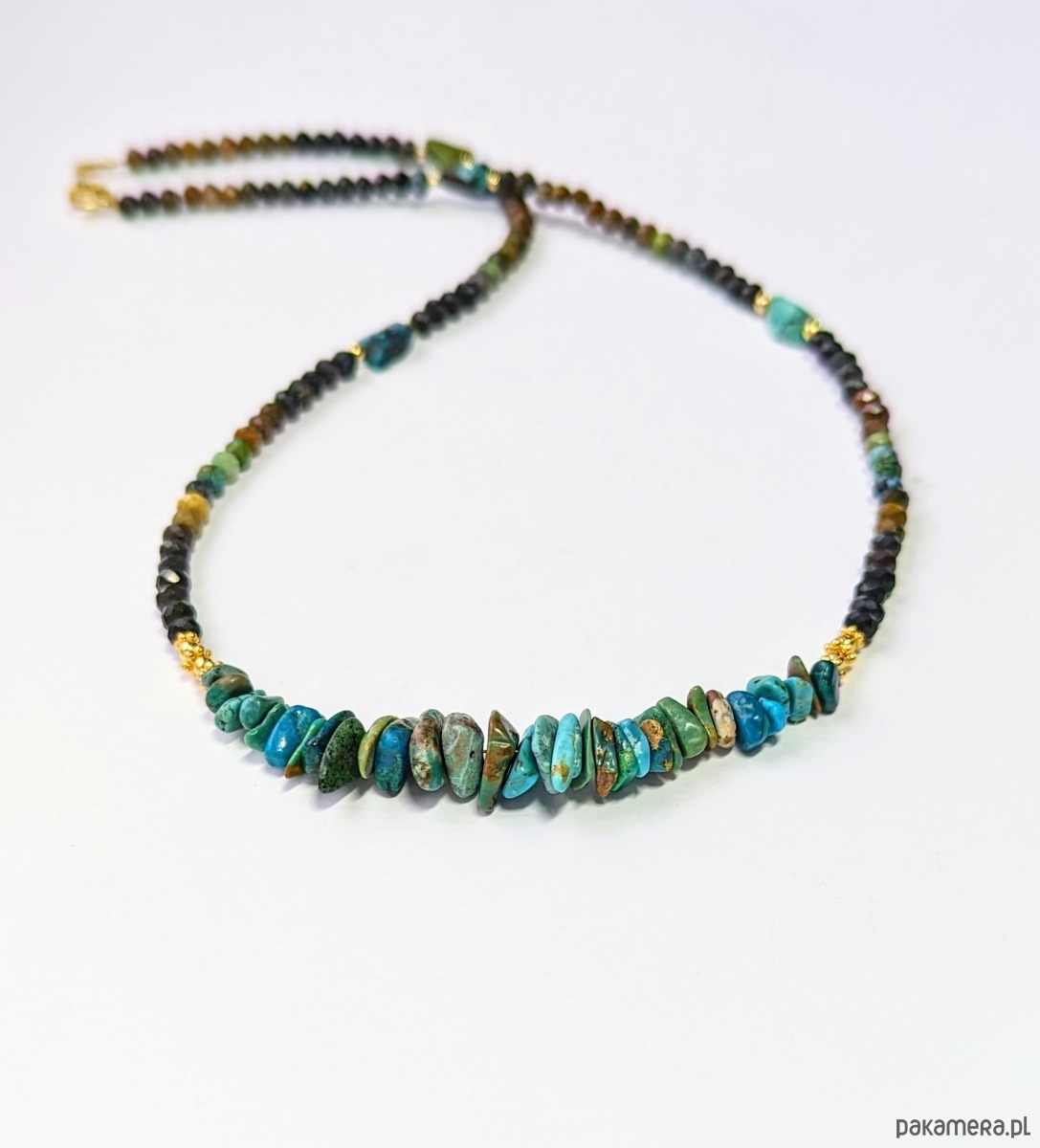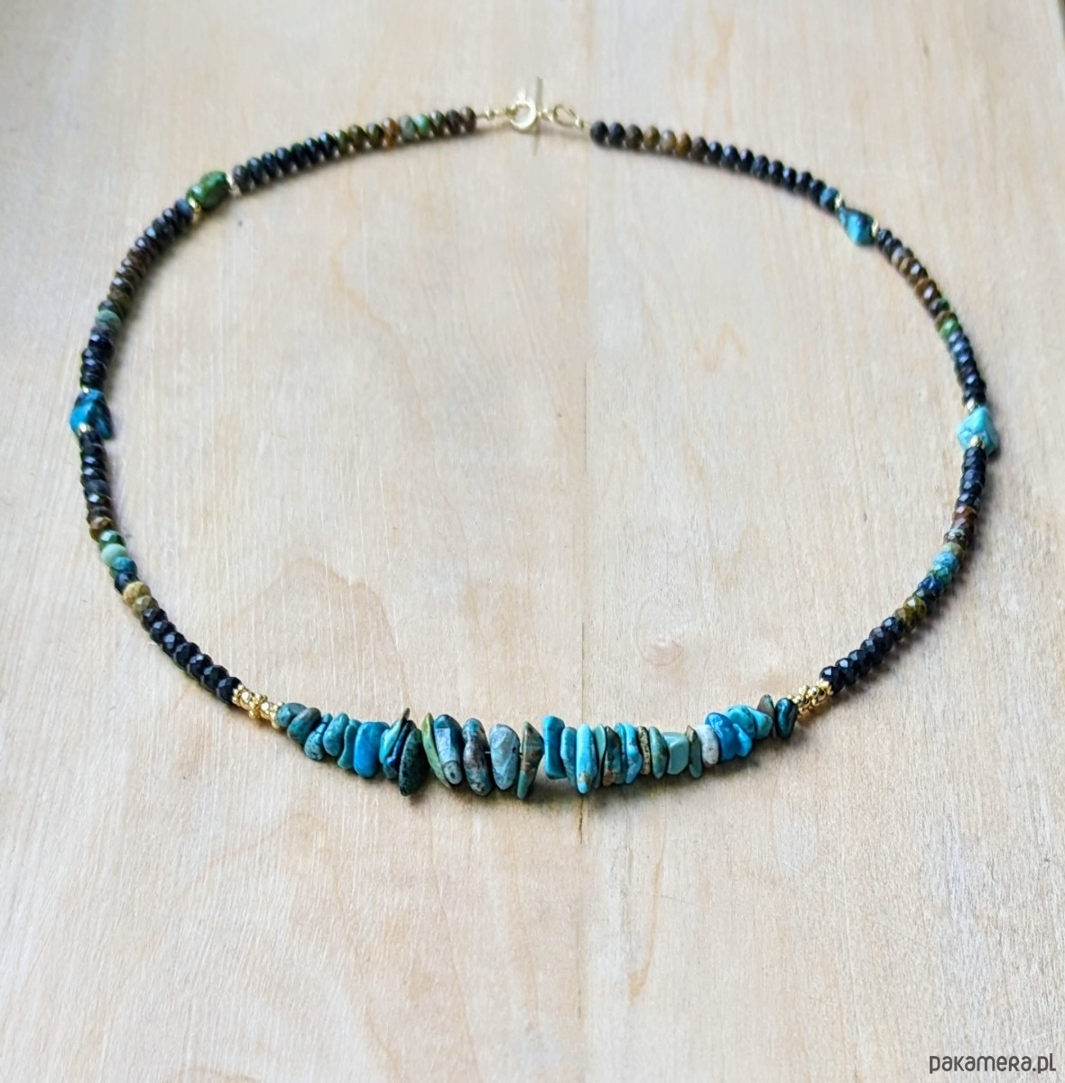 Kolejny naszyjnik z naturalnymi turkusami w intensywnej barwie. Dominują jasne i bardzo ciemne brązy, z delikatnym dodatkiem zieleni i błękitu. Punktowo zostały ułożone bryłki nieregularnego niebieskiego turkusu. Powstało intensywne ombre z pięknym kontrastem przypalonego brązu i morskich odcieni. Wykończenie w pozłacanym srebrze.