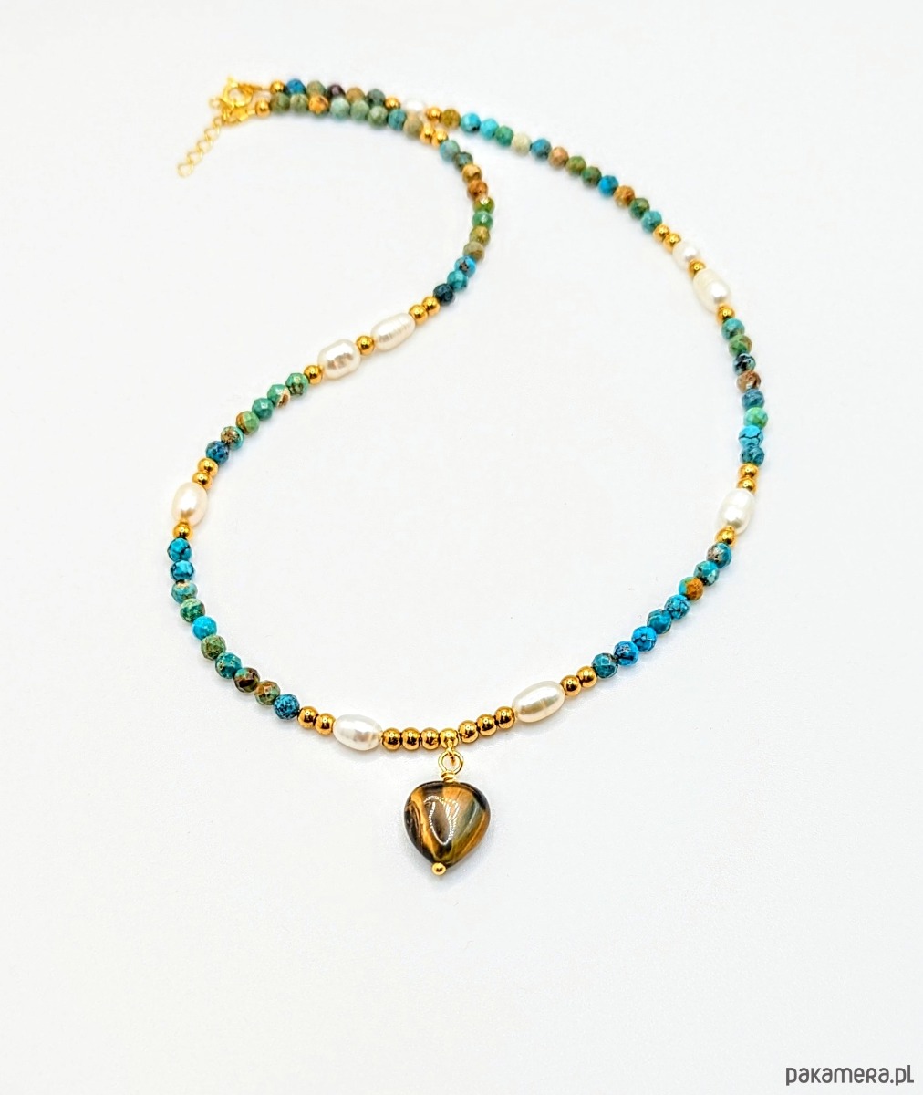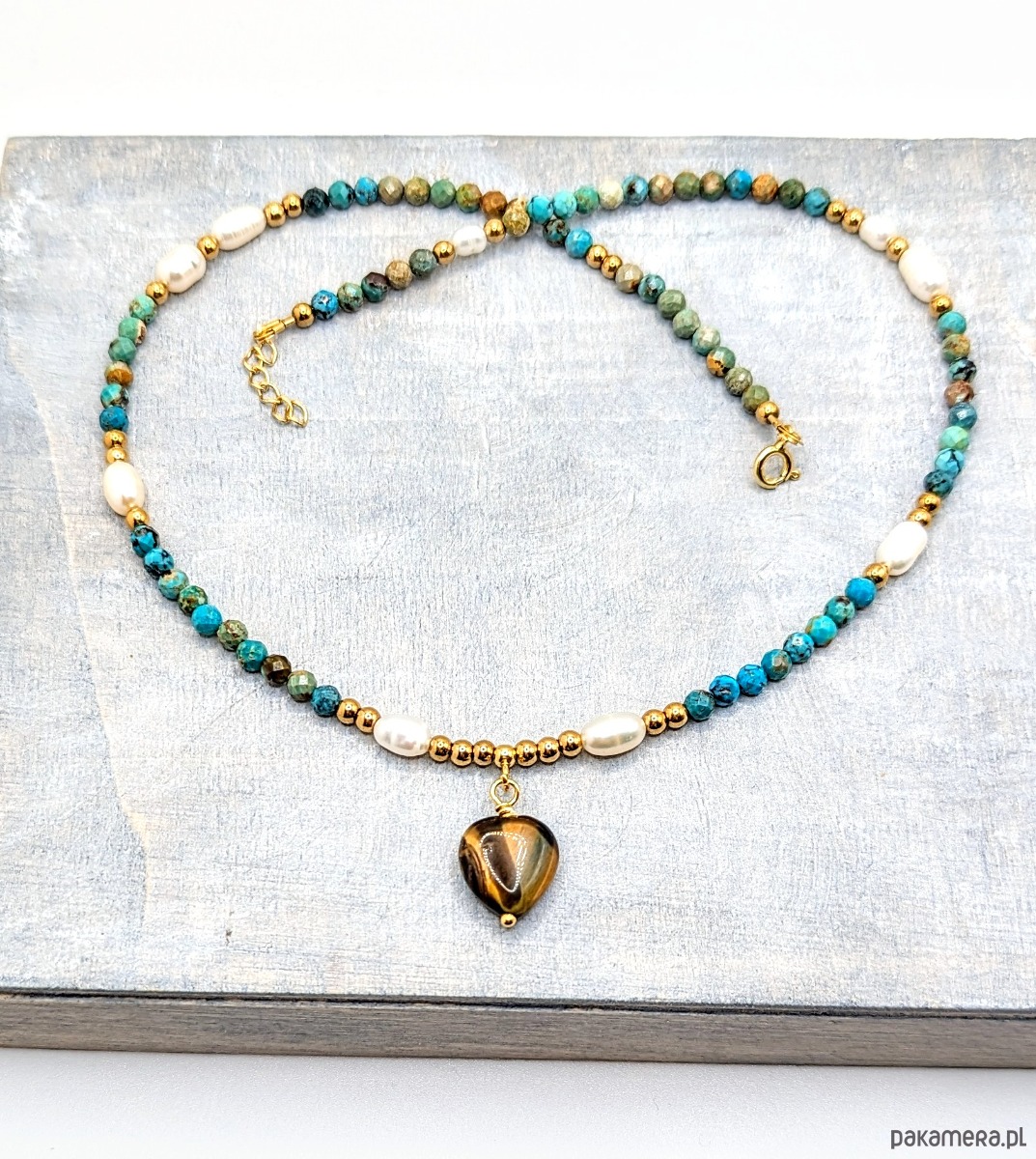 Wyjątkowo ubarwione, naturalne turkusy w naszyjniku ze złoconymi dodatkami. Na sznurze dodatkowo połyskują białe perły. Na środku zamieszczona jest śliczna zawieszka w kształcie serca wykonana z kamienia tygrysiego oka. Całość z bardzo pozytywną energią.