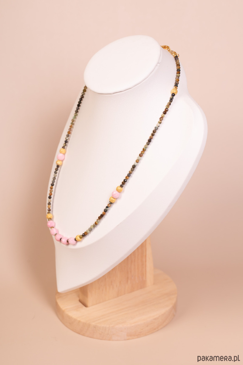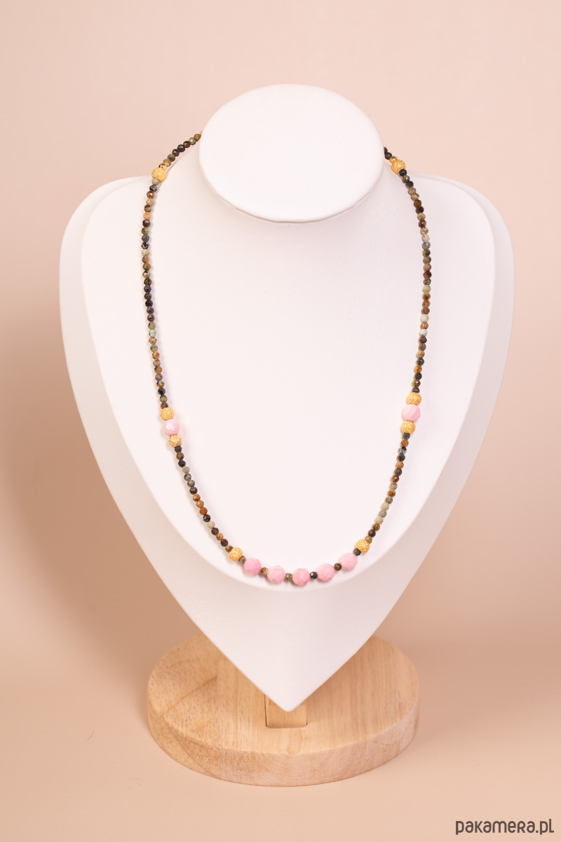 Forma i charakter: Naszyjnik ma lekką, drobno‑kulkową formę, dzięki czemu pięknie układa się na dekolcie i pasuje zarówno solo, jak i do warstwowych zestawień z innymi łańcuszkami. Różowe akcenty w środkowej części łagodnie rozjaśniają ciemniejsze turmaliny, tworząc delikatny, kobiecy efekt.