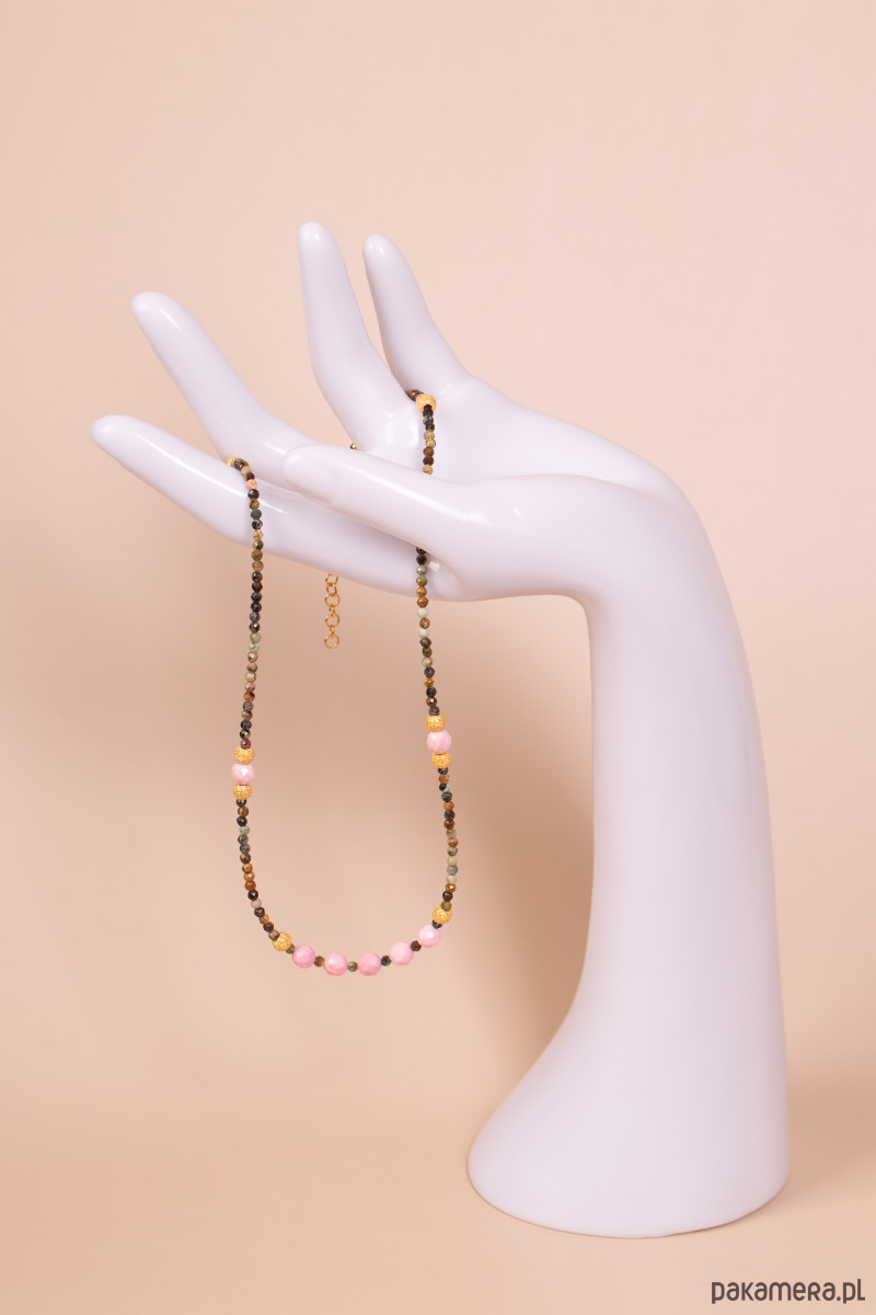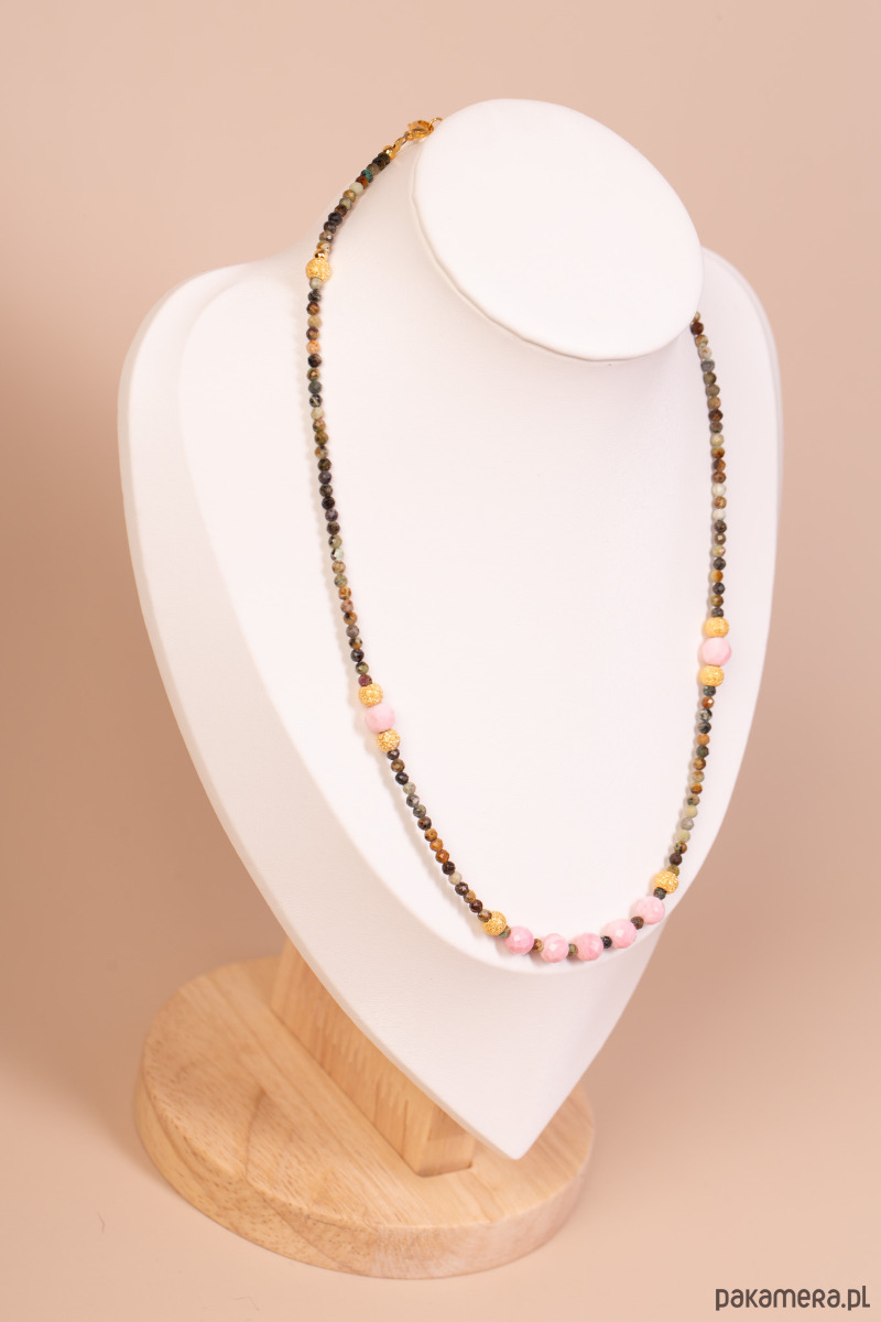 Delikatny naszyjnik wykonany na stalowej lince z drobnych, wielobarwnych turmalinów, uzupełnionych kulkami jasnego, matowego kwarcu różowego. Naturalne odcienie zieleni, brązu i szarości przełamane pudrowym różem tworzą subtelną, codzienną kompozycję. Całość dopełniają srebrne, pozłacane elementy, które dodają biżuterii dyskretnego blasku.