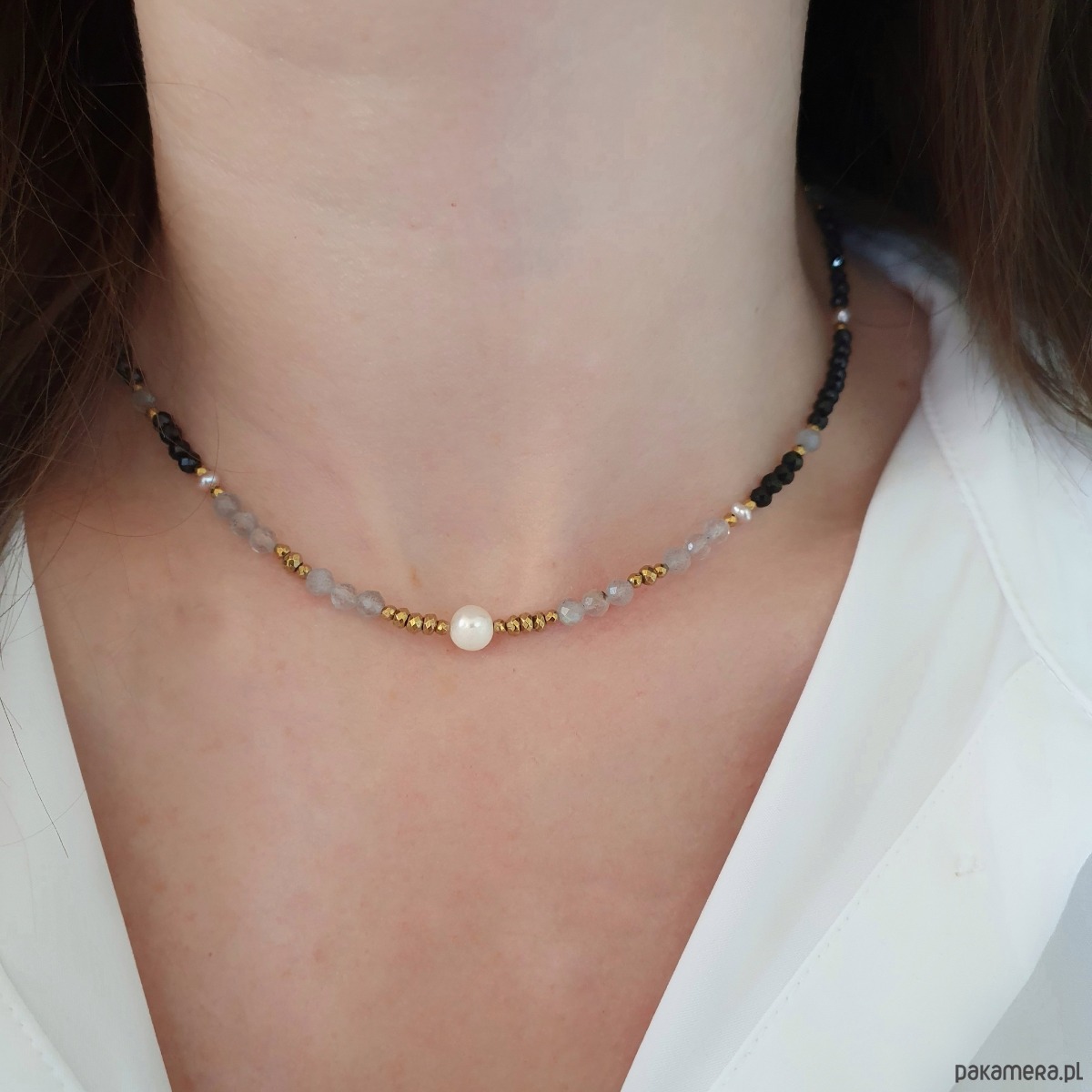 Naszyjnik wykonany z kamieni naturalnych: czarnego turmalinu, labradorytu, hematytu i perły rzecznej na wytrzymałej lince jubilerskiej. Wykończony antyalergiczną stalą szlachetną.