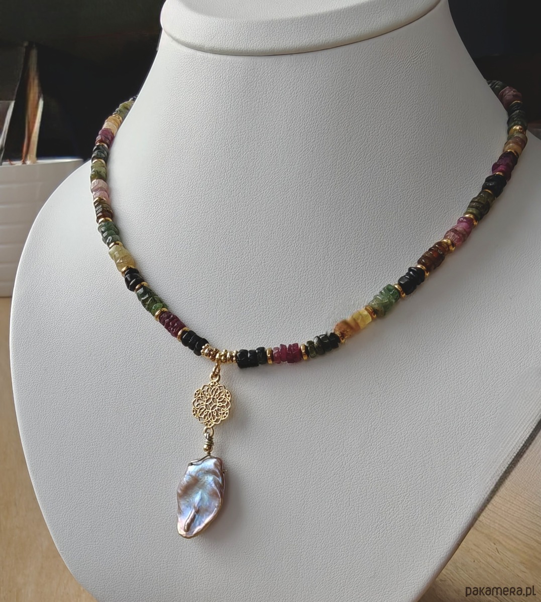 Wyrazisty, w pięknych barwach naszyjnik wykonany z turmalinów. Cieniowane turmaliny zostały z dużą dbałością ułożone w sekwencje rozdzielane złoconym hematytem. W zawieszce zamocowana jest wyjątkowa perła - jej kolory zmieniają się w zależności od pory dnia, oświetlenia i otaczających ją barw. Pięknie dostraja się.