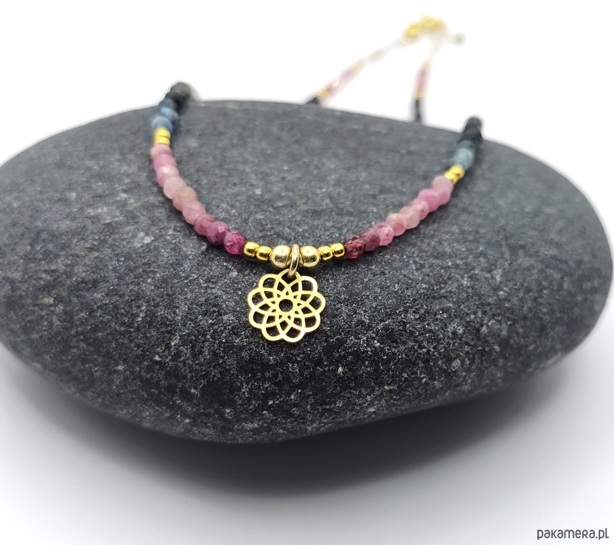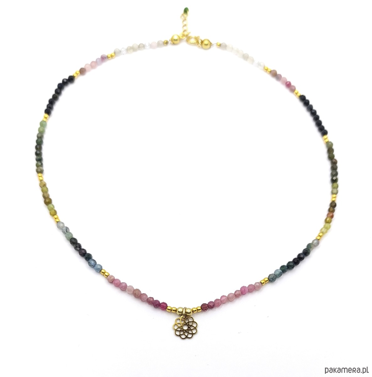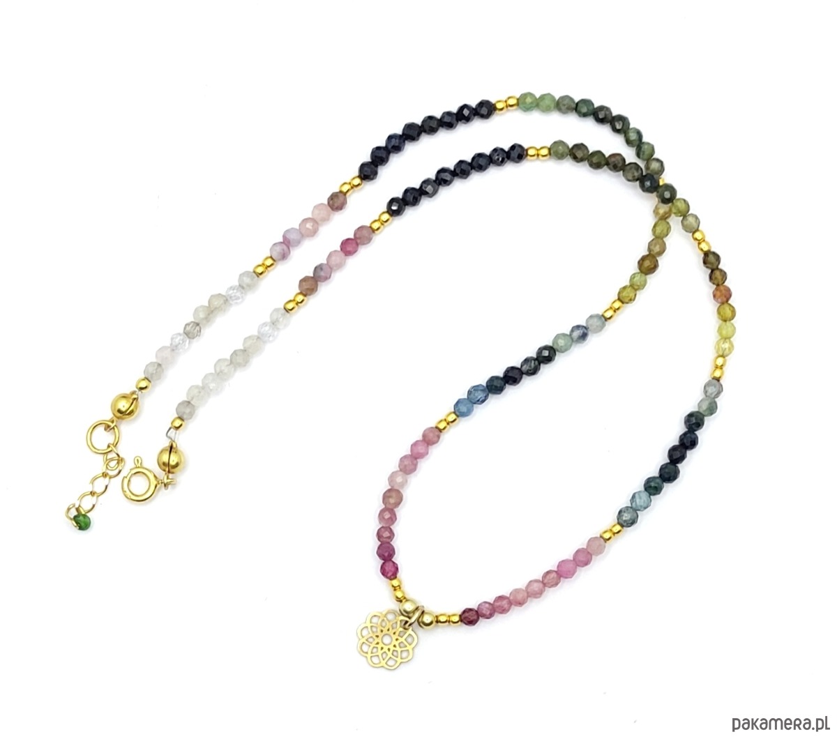 Naszyjnik z drobnych kamieni turmalinu ułożonych wg kolorów. Bardzo pozytywne barwy, delikatna rozetka, blask pozłacanego srebra. Pełen dobrej energii.