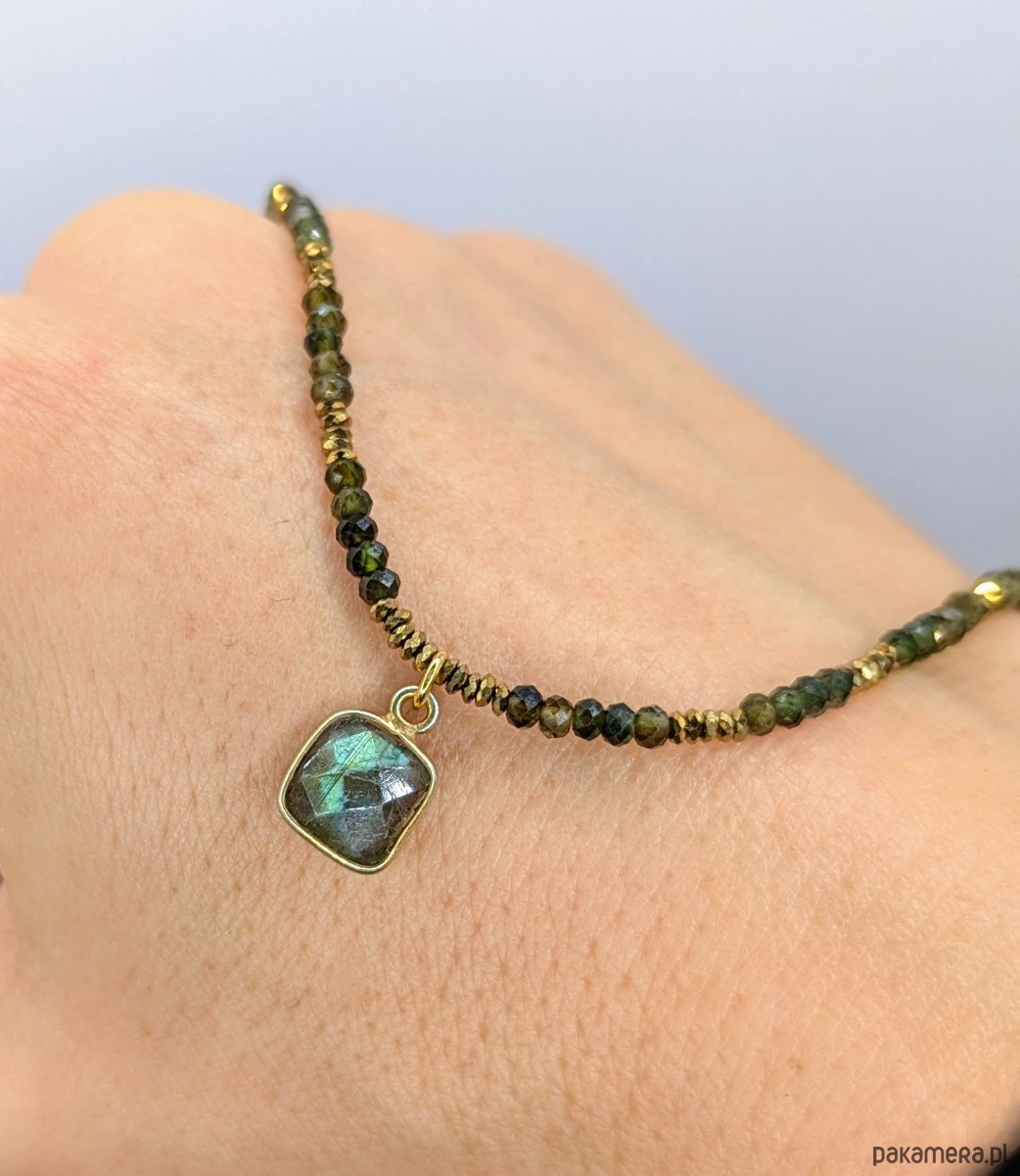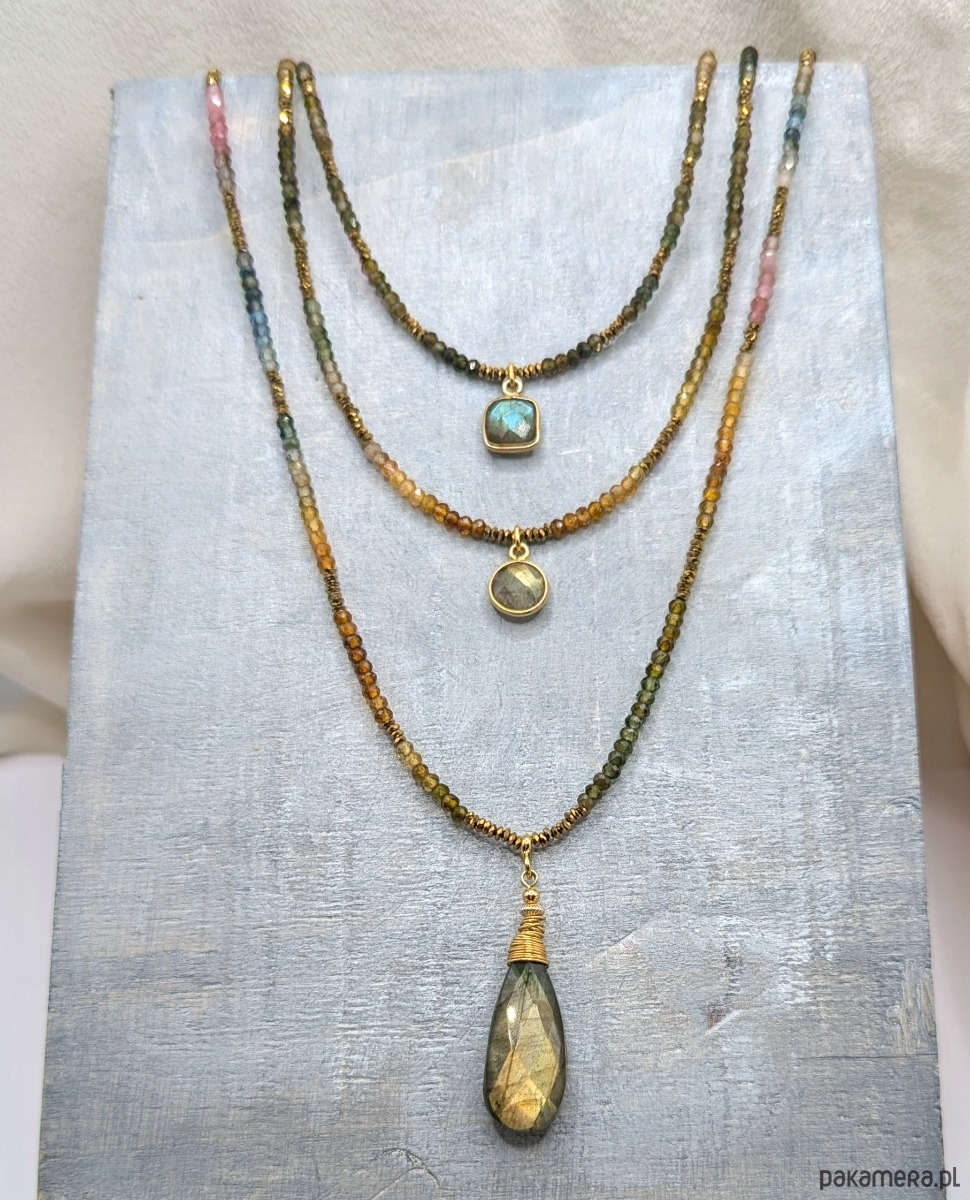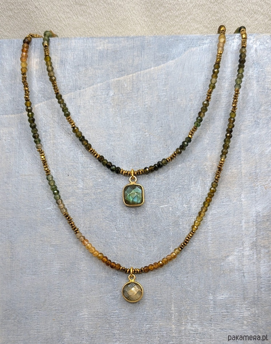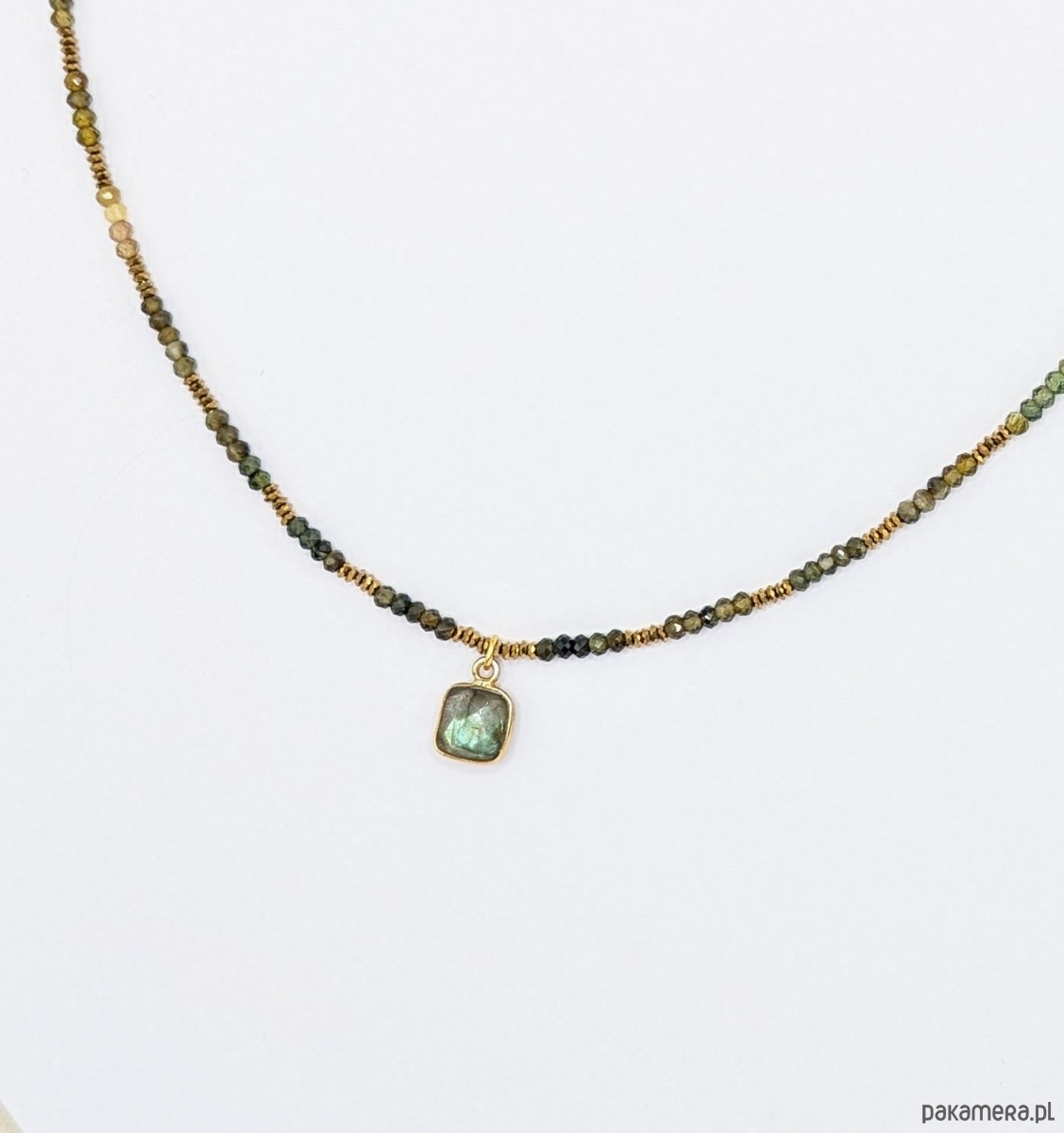 W tym naszyjniku dominują zielone turmaliny - ich odcień zależy od mocy światła. Można zaleźć również niebieskie i żółtawe kamienie. Przekładki to hematyty platerowane na kolor starego złota. Są wyszlifowane w taki sposób, że migoczą przy każdym ruchu i rozświetlają naszyjnik.