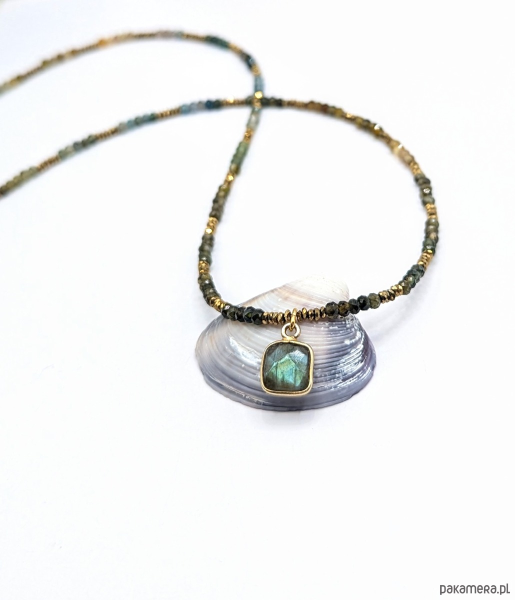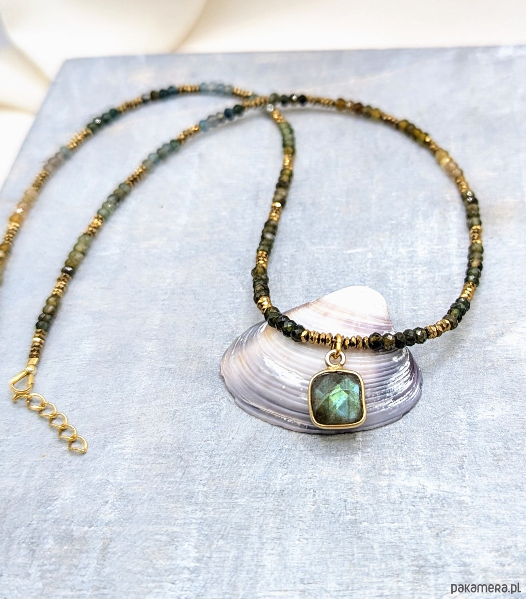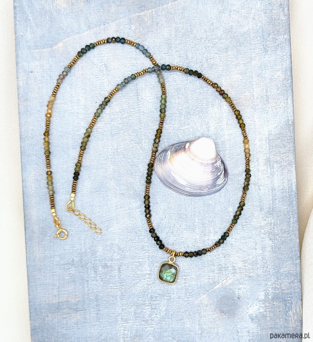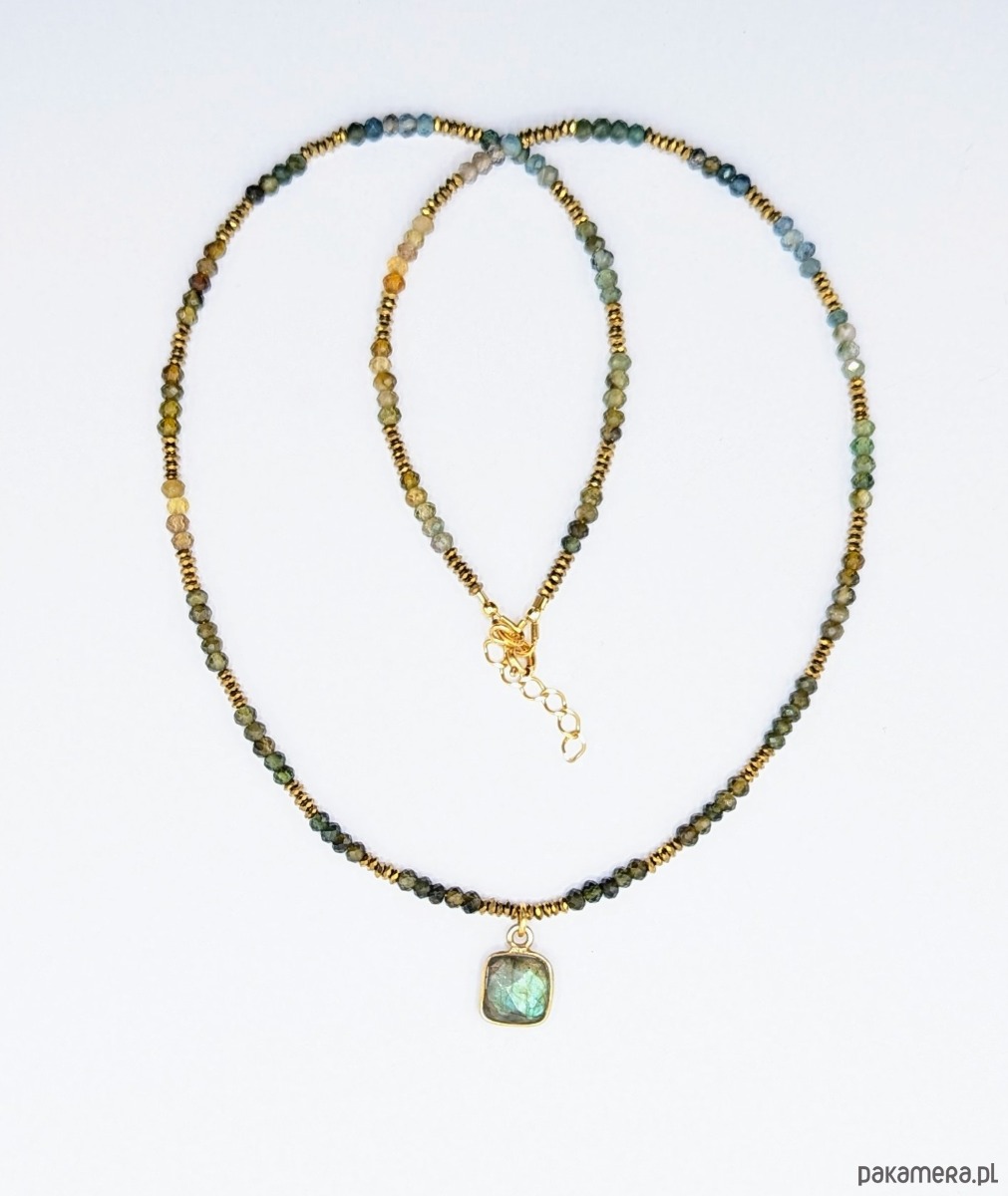 W tym naszyjniku dominują zielone turmaliny - ich odcień zależy od mocy światła. Można zaleźć również niebieskie i żółtawe kamienie. Przekładki to hematyty platerowane na kolor starego złota. Są wyszlifowane w taki sposób, że migoczą przy każdym ruchu i rozświetlają naszyjnik.