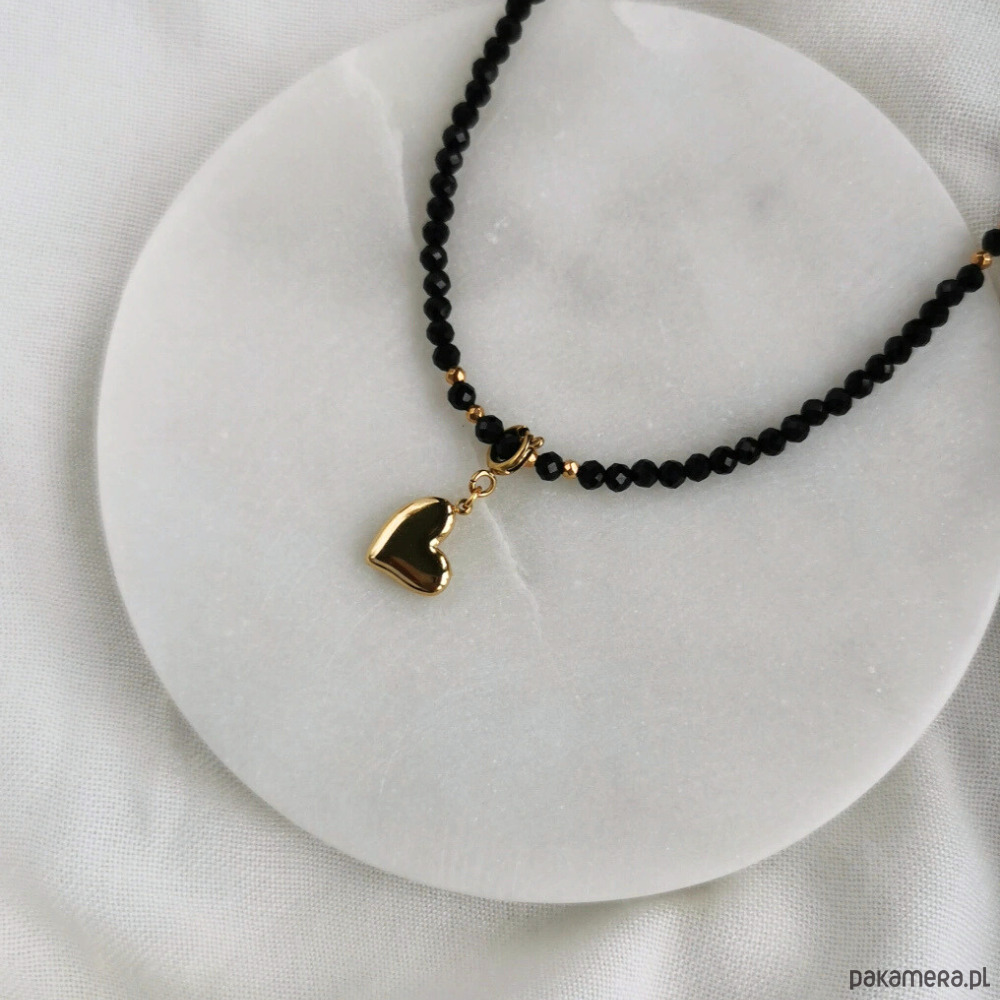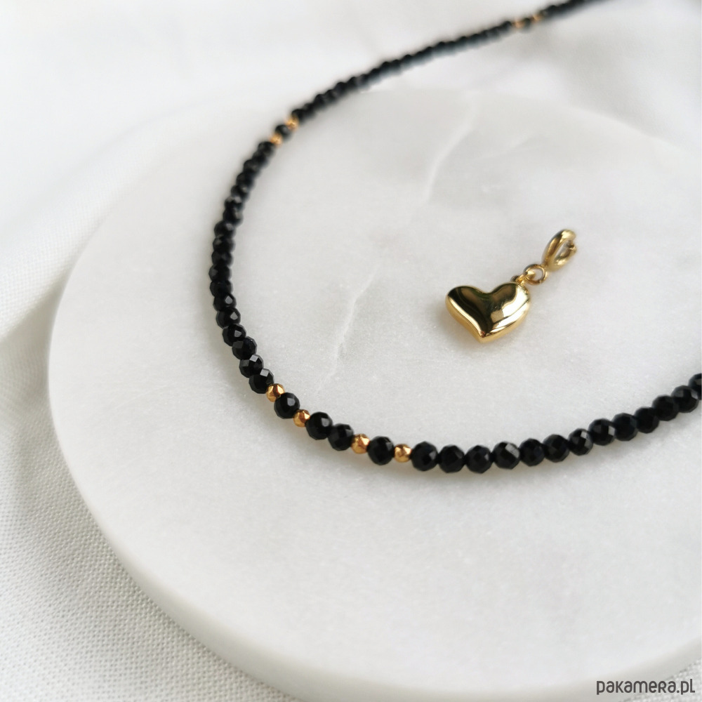 Ręcznie robiony naszyjnik z fasetowanych kuleczek czarnego turmalinu z drobnymi koralikami ze złotego hematytu. Naszyjnik ozdobiony jest zawieszką w kształcie serduszka, którą można odczepić, dzięki czemu naszyjnik można wykorzystać do bardziej eleganckich stylizacji.