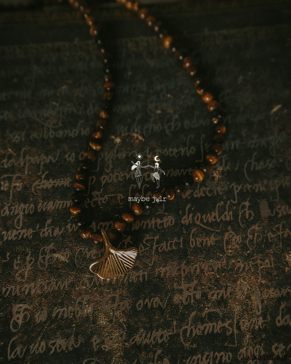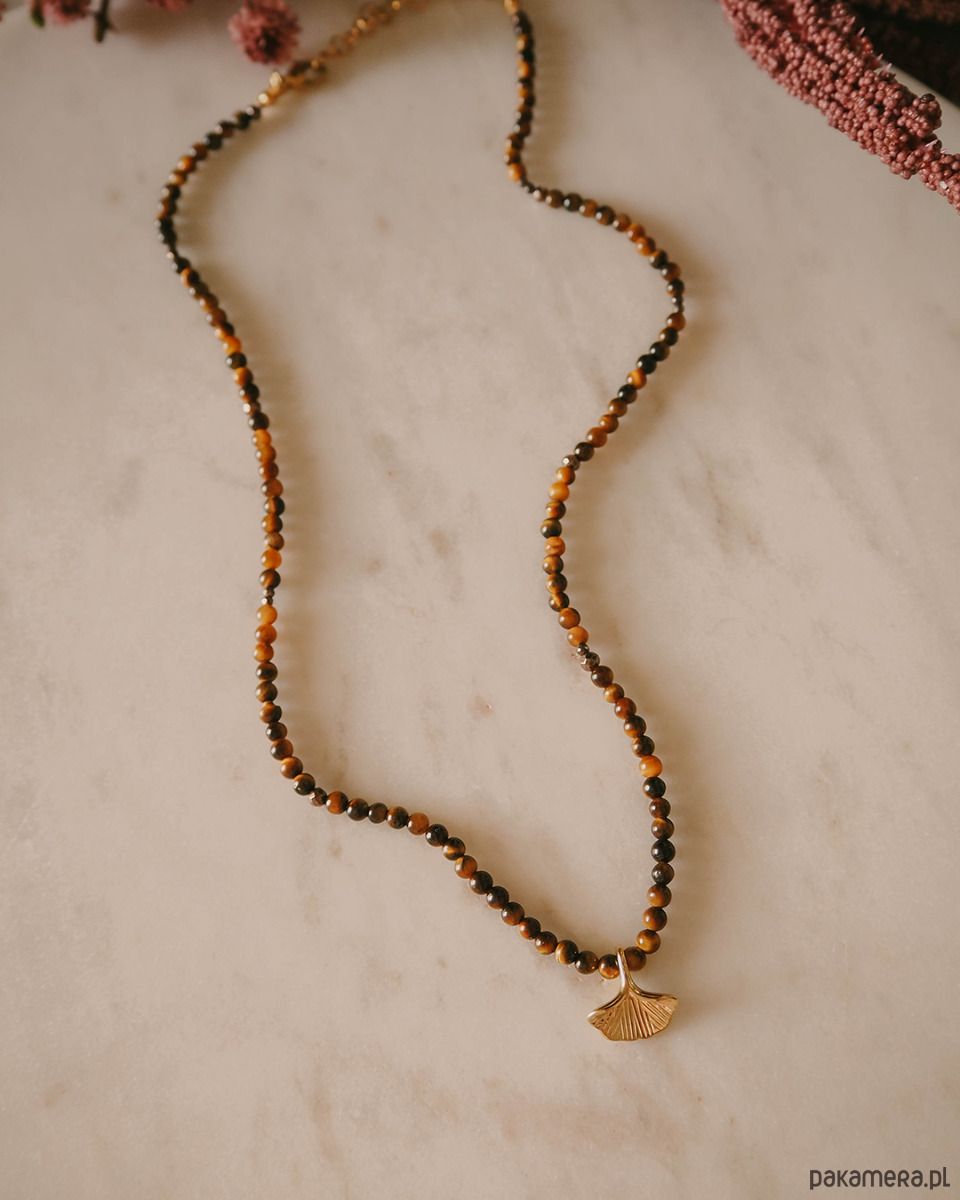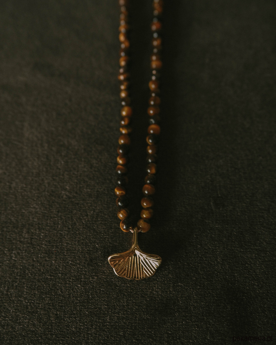 Naszyjnik z Tygrysiego Oka z zawieszką liścia miłorzębu.