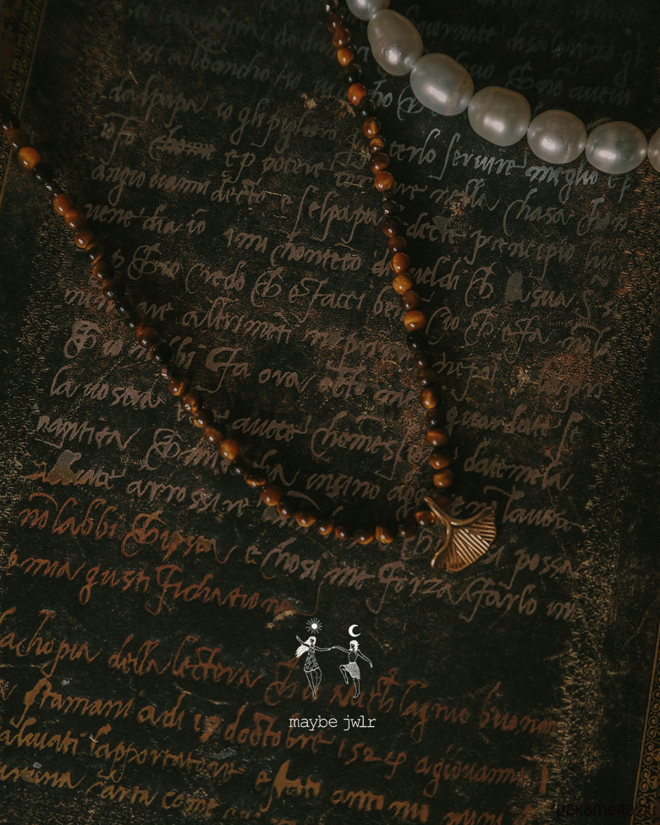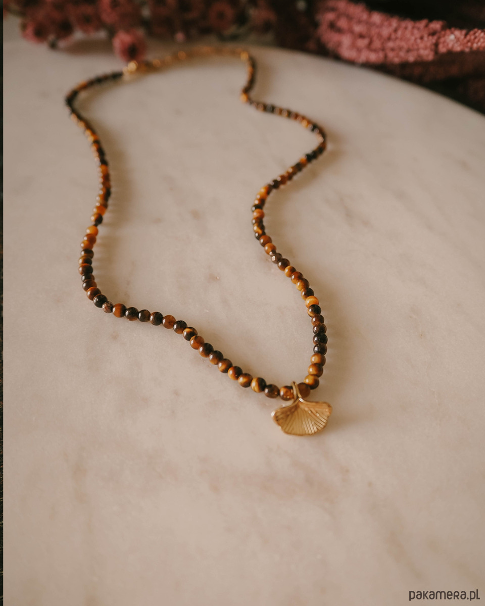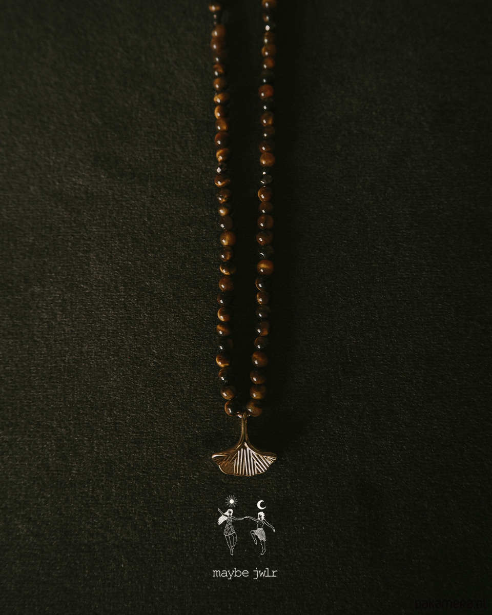 Naszyjnik z Tygrysiego Oka z zawieszką liścia miłorzębu.