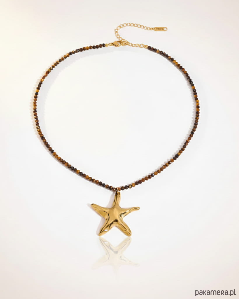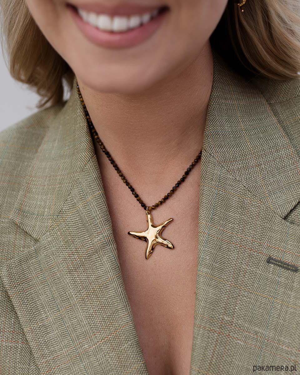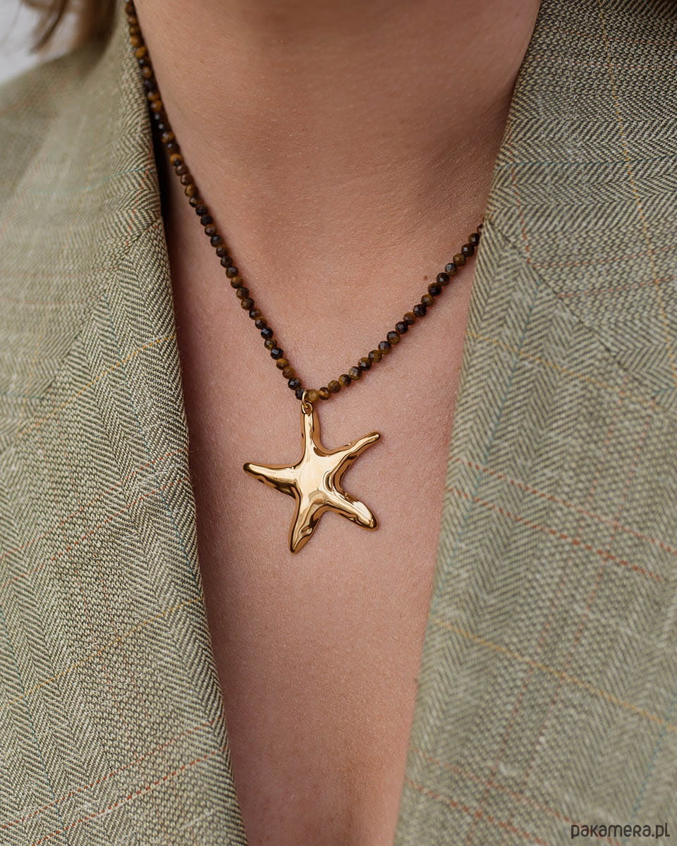 Jeśli lato miałoby formę biżuterii , wyglądałoby właśnie tak.Ten naszyjnik łączy naturalne koraliki z tygrysiego oka w ciepłych, karmelowo-brązowych odcieniach ze złotą zawieszką w kształcie rozgwiazdy. Efekt? Wakacyjny naszyjnik w idealnym wydaniu.To model, który świetnie wygląda solo, ale też pięknie komponuje się w stylizacjach warstwowych. Pasuje do lnianej koszuli, topu na ramiączkach, sukienki maxi czy białej koszuli.Dlaczego warto go mieć?- naturalne kamienie z tygrysiego oka- lekki i wygodny- wykonany ze stali chirurgicznej - wodoodpornej i hipoalergicznejMasz dość biżuterii, która czernieje po kilku wyjściach? Zastanawiasz się, jaka biżuteria nie ciemnieje? Stal chirurgiczna premium to trwałość na lata - nie boi się wody, potu ani słońca. Możesz zabrać go na plażę, wakacje, festiwal i nosić go codziennie.Tygrysie oko dodatkowo przyciąga uwagę swoim naturalnym połyskiem - każda kulka ma unikalny rysunek, więc Twój naszyjnik będzie jedyny w swoim rodzaju.Wymiary:- długość zawieszki: 2,6 cm- długość 40 cm + 7 cm regulacjiMateriał: stal chirurgiczna premiumWodoodporna i hipoalergiczna
