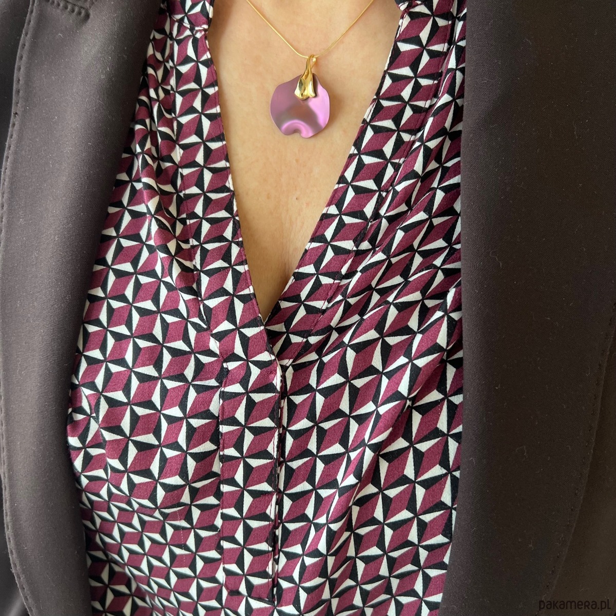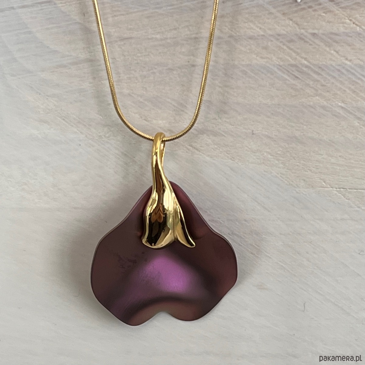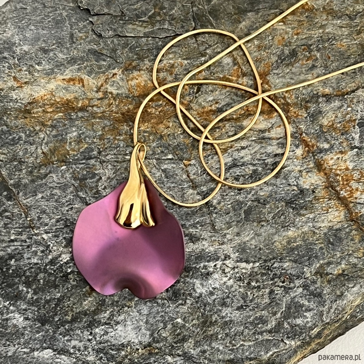 Wyjątkowy naszyjnik wykonany z najwyższej jakości srebra próby 925, pokrytego warstwą złota oraz ozdobiony tytanowym elementem w głębokim odcieniu fioletu w formie przestrzennego liścia- płatka kwiatu . Nowoczesna, opływowa forma inspirowana naturą przyciąga uwagę subtelnym połączeniem matowego tytanu i lśniącego złotego wykończenia.