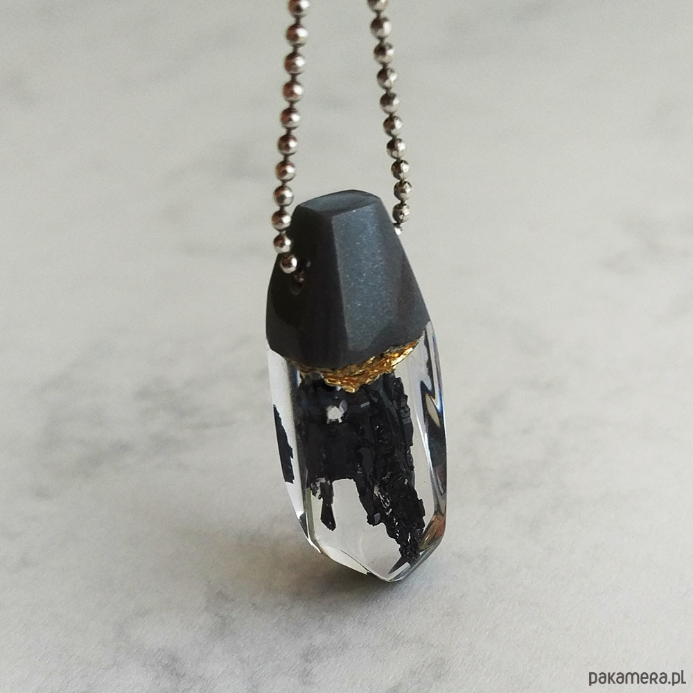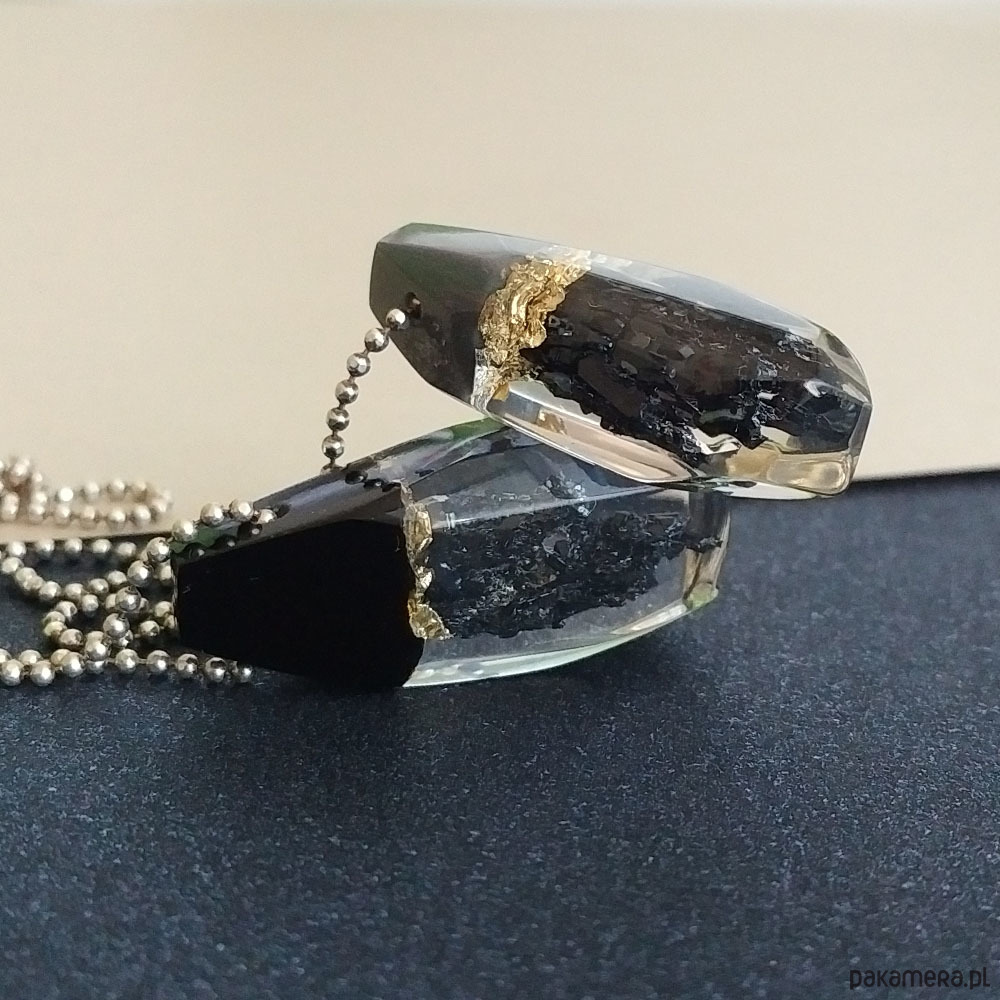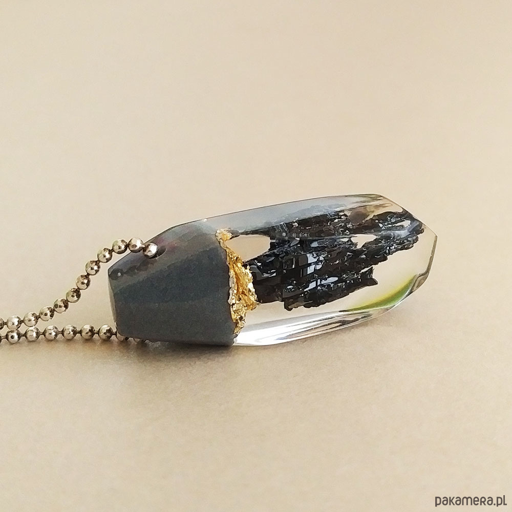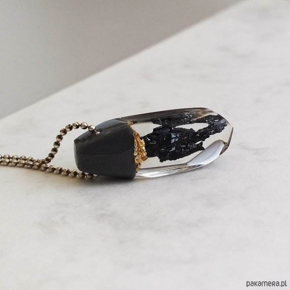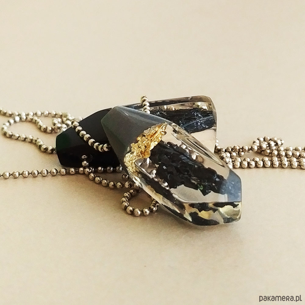 Naszyjnik z żywicy z węglikiem krzemu i płatkami złota tworzącymi łącznik pomiędzy minerałem i zabarwioną częścią żywicy.