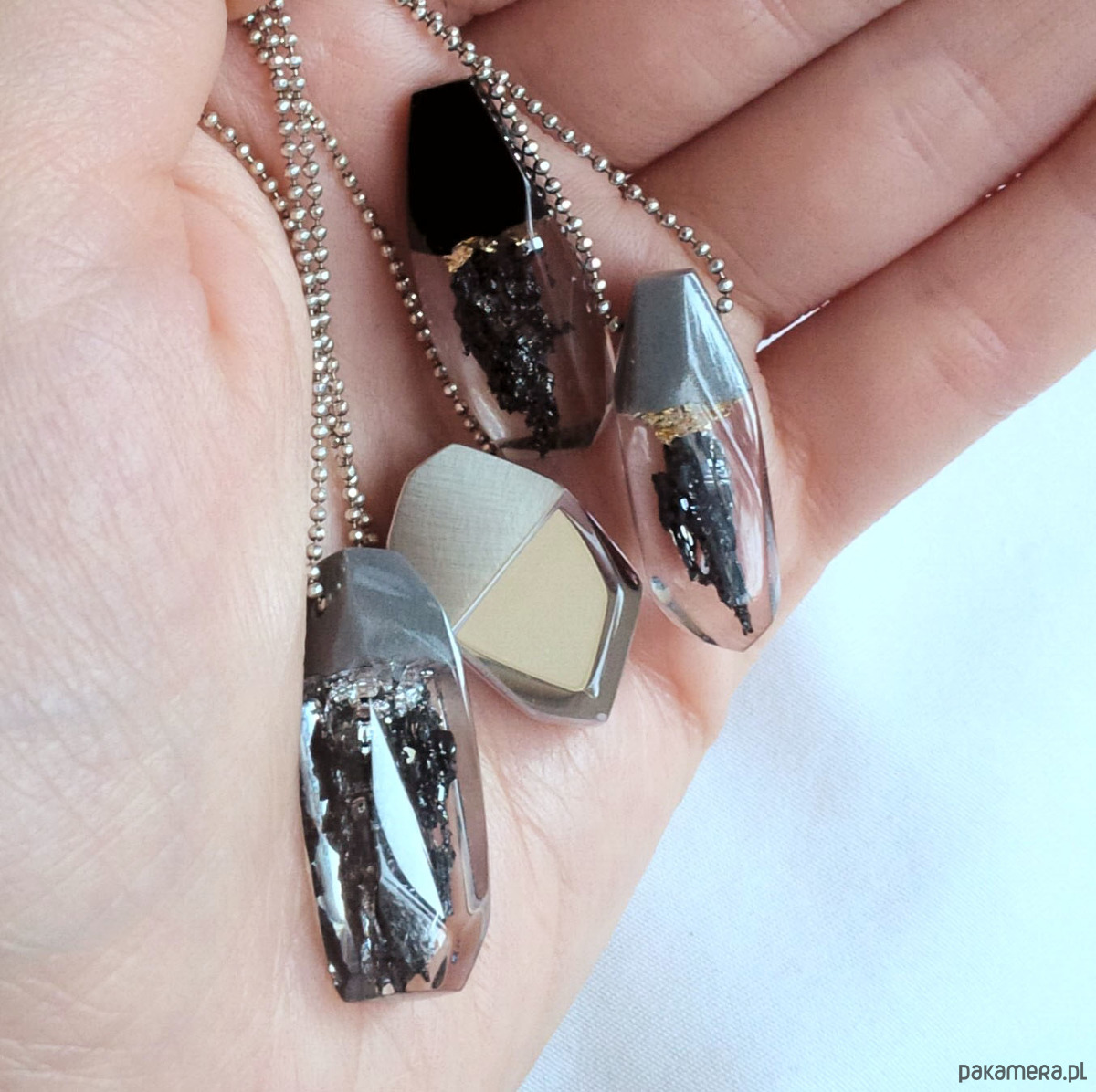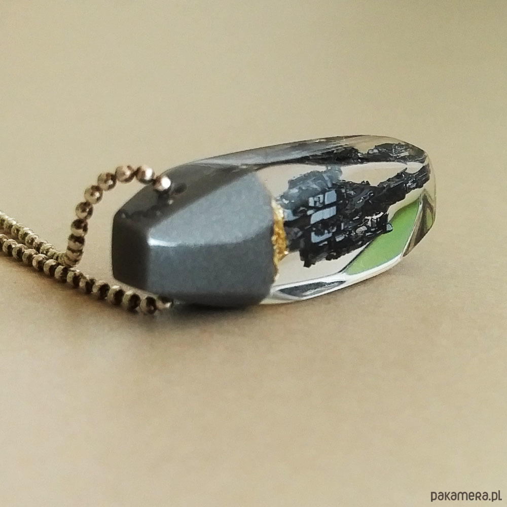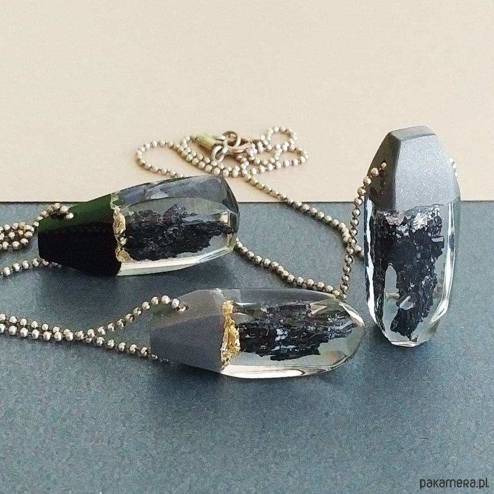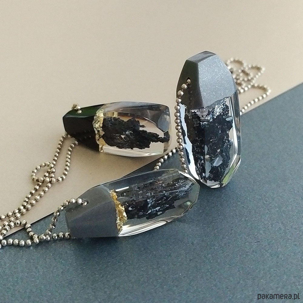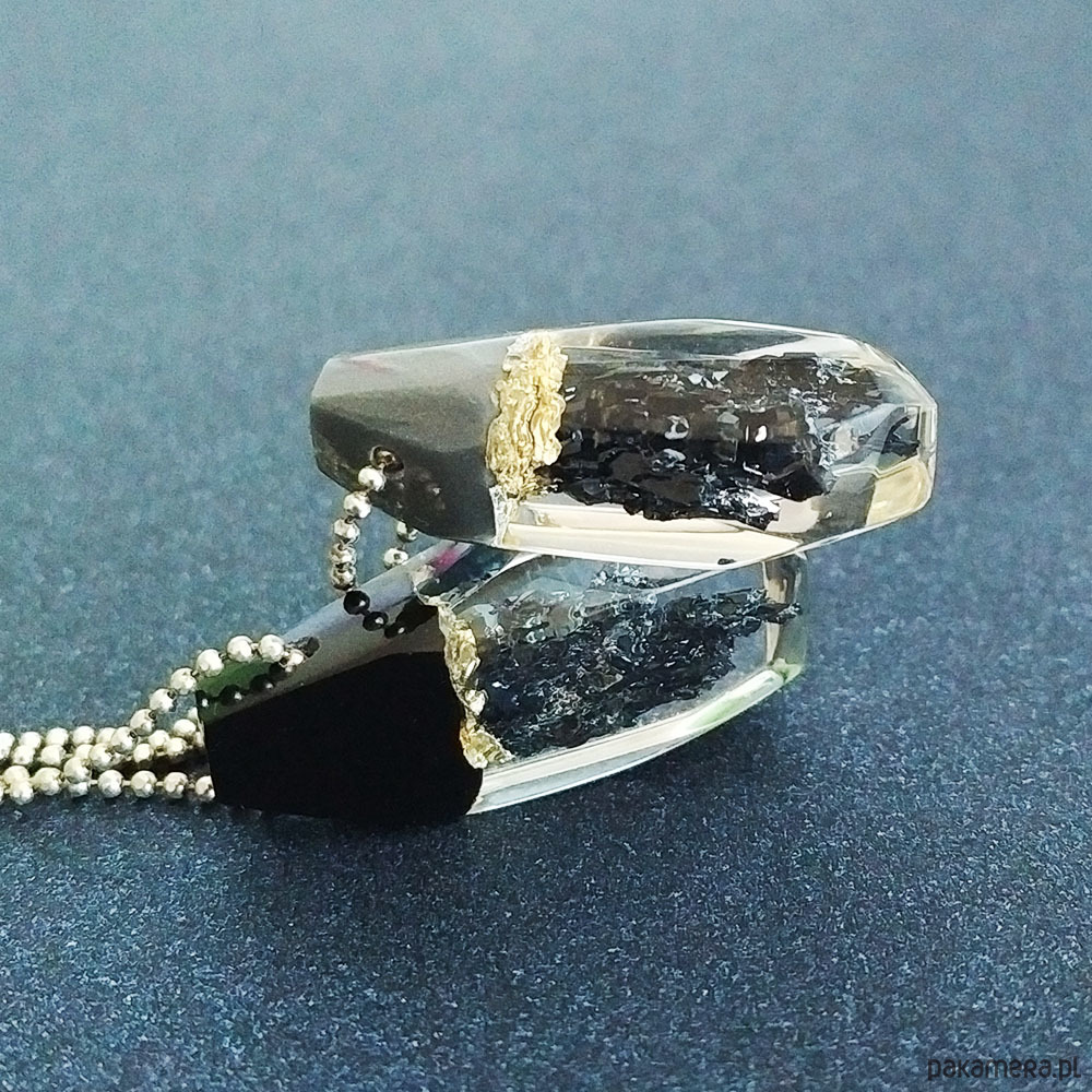 Naszyjnik z żywicy z węglikiem krzemu i płatkami złota tworzącymi łącznik pomiędzy minerałem i zabarwioną częścią żywicy.