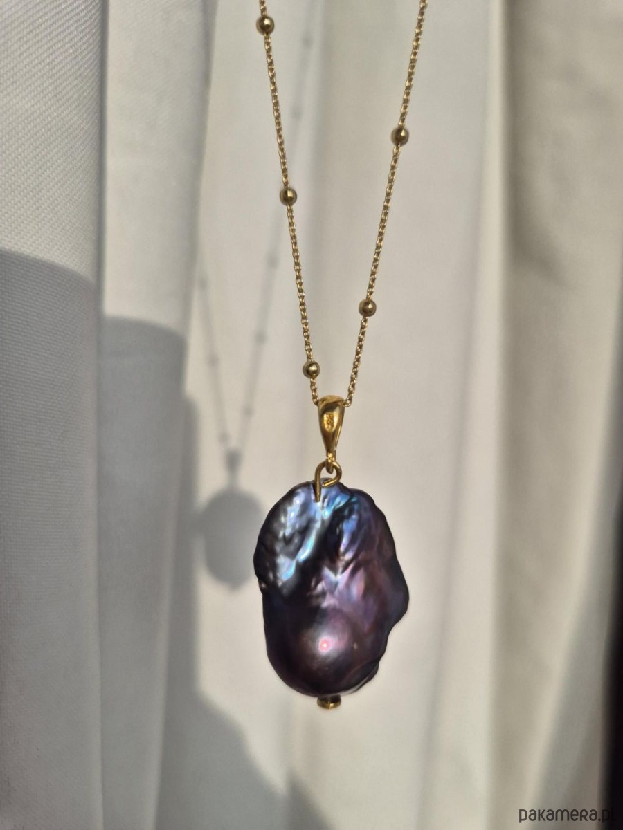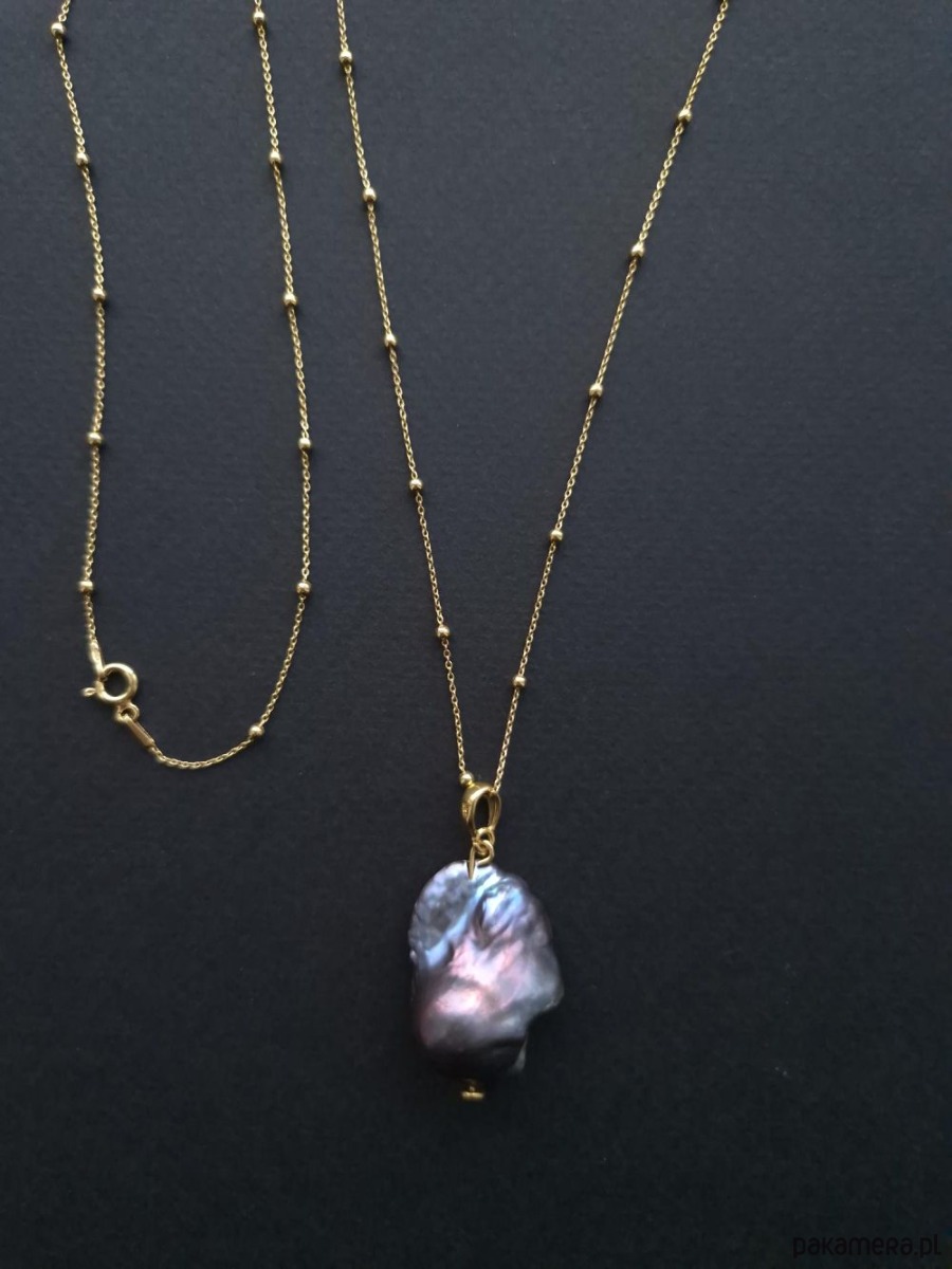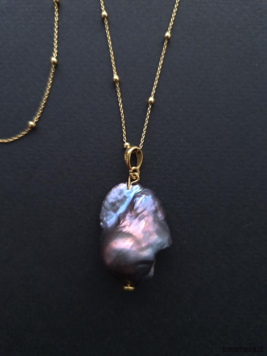 Delikatny, a jednocześnie efektowny naszyjnik z naturalną perłą barokową w niezwykłym granatowo-fioletowym kolorze. Zawieszka została umieszczona na długim łańcuszku z drobnymi kuleczkami, wykonanym z pozłacanego srebra próby 925.