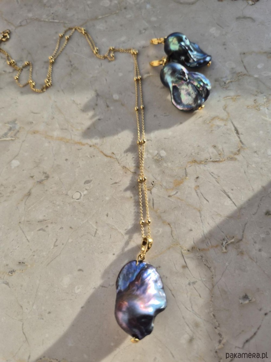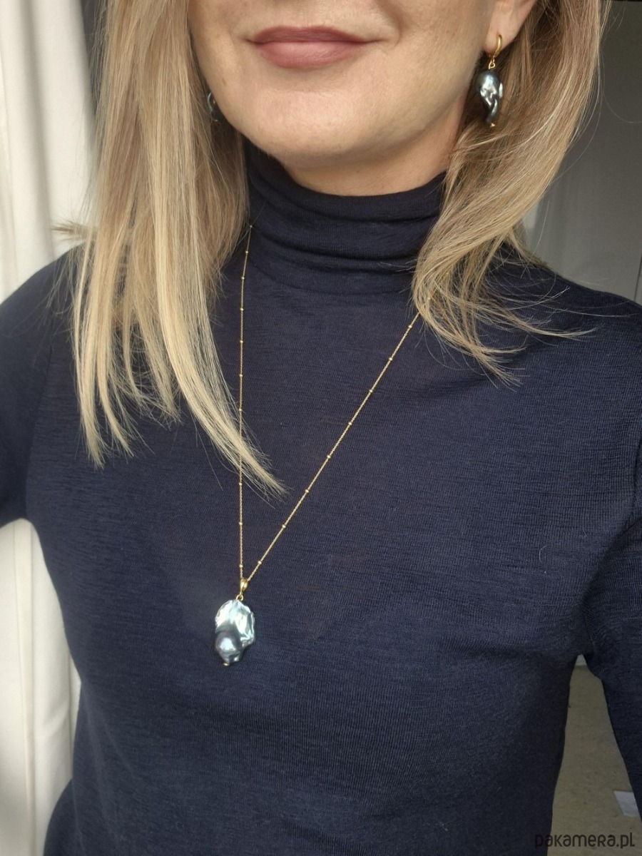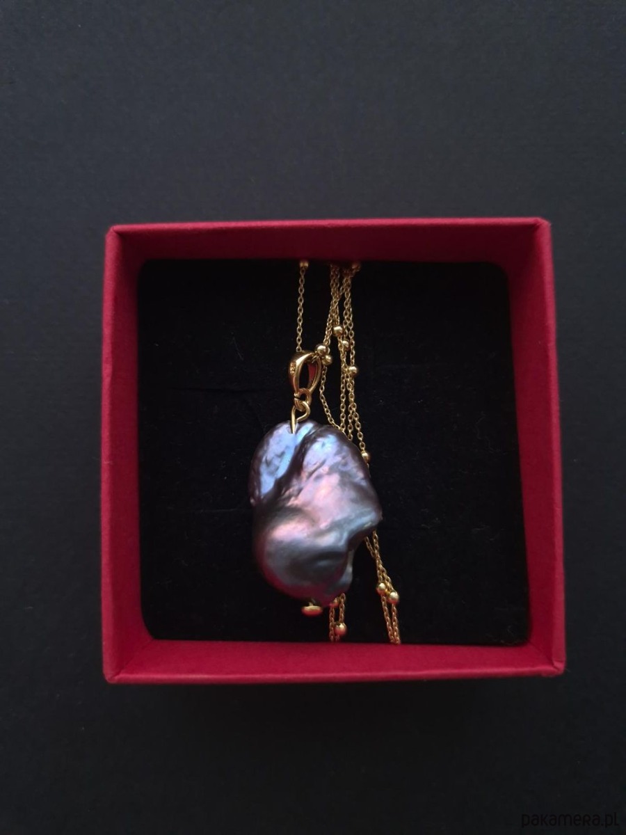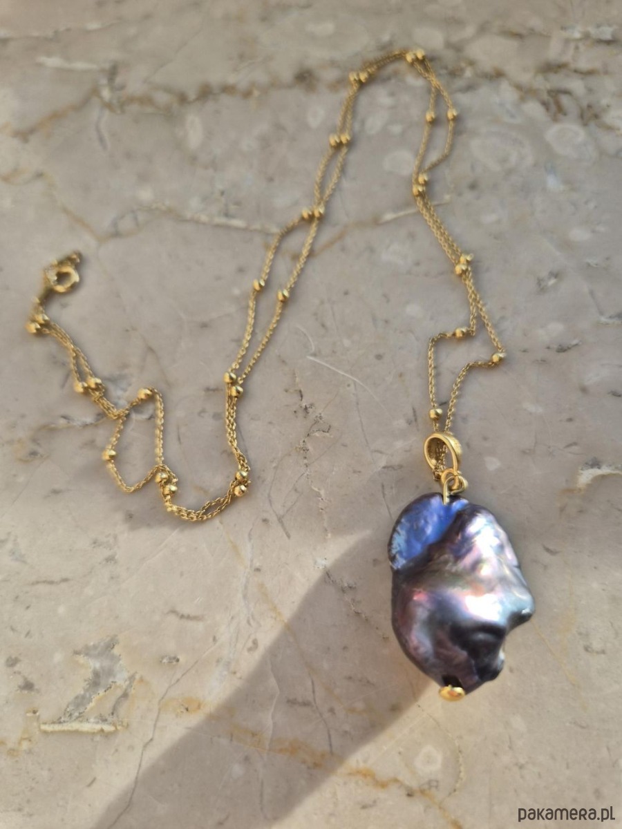 Delikatny, a jednocześnie efektowny naszyjnik z naturalną perłą barokową w niezwykłym granatowo-fioletowym kolorze. Zawieszka została umieszczona na długim łańcuszku z drobnymi kuleczkami, wykonanym z pozłacanego srebra próby 925.