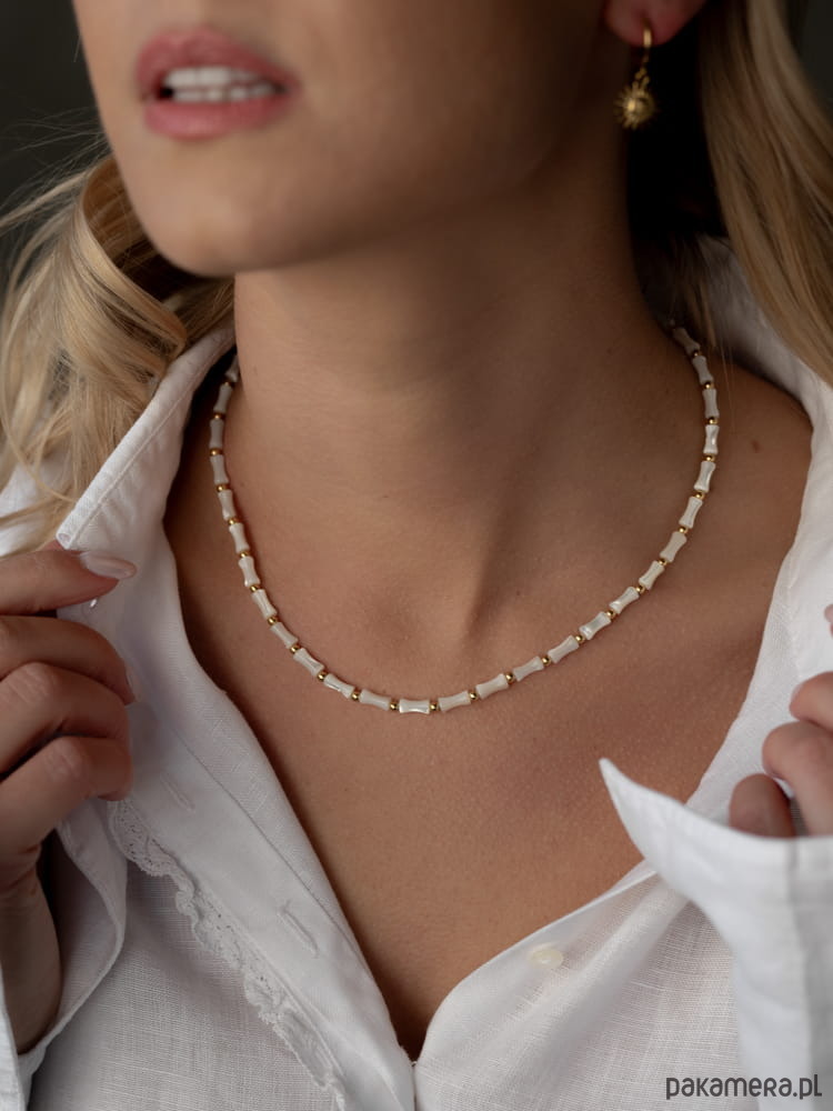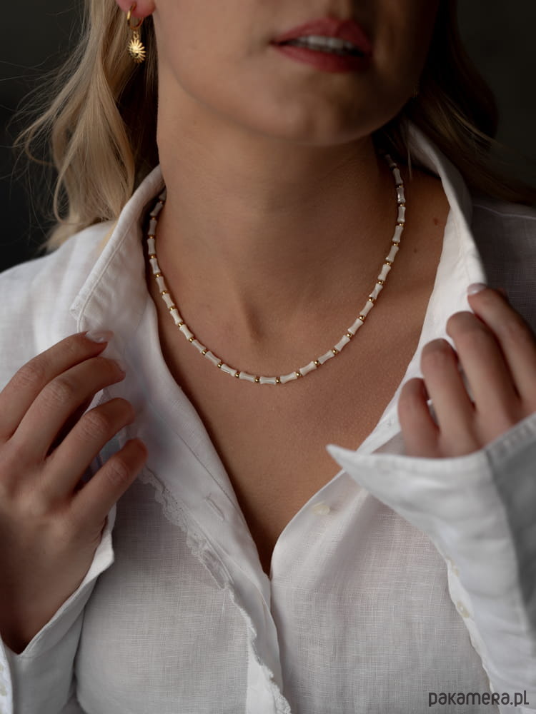 Z jednej strony mamy białe delikatne akcenty, z drugiej, pleciony odcinek dodaje temu naszyjnikowi charakteru i ekspresji.
