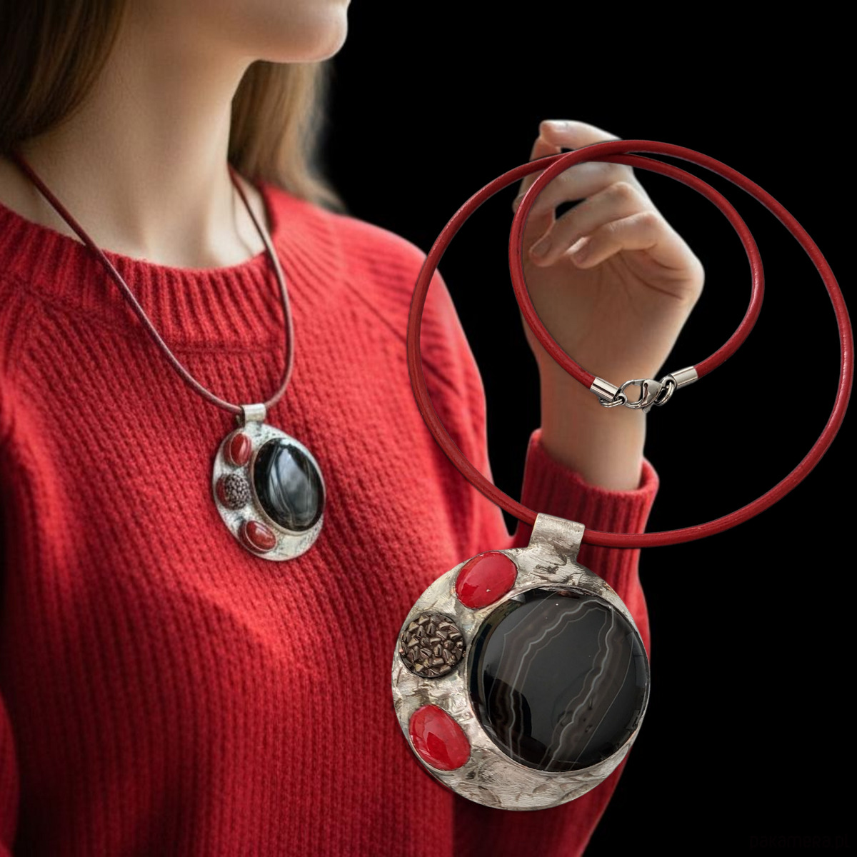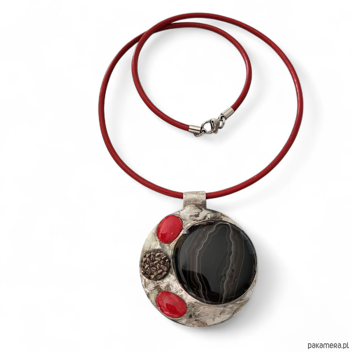 Wisior został zawieszony na skórzanym rzemieniu o długości z zapięciem ok. 52cm (+ 5 cm łańcuszka regulacyjnego).