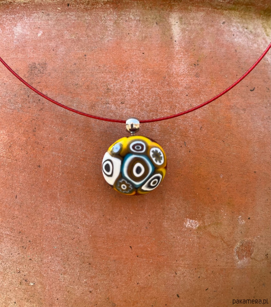 Naszyjnik z ręcznie wykonanym oczkiem z włoskiego szkła. Średnica oczka w najszerszym miejscu 2,6 cm. Oczko wkręcone (wymienne) do zawieszki ze stali szlachetnej. Zawieszone na lince jubilerskiej o kolorze srebrnym. Oczko można użyć też do pierścionka. Obrączkę do pierścionka można dokupić, w takim przypadku proszę o kontakt, wystawię jako zamówienie specjalne