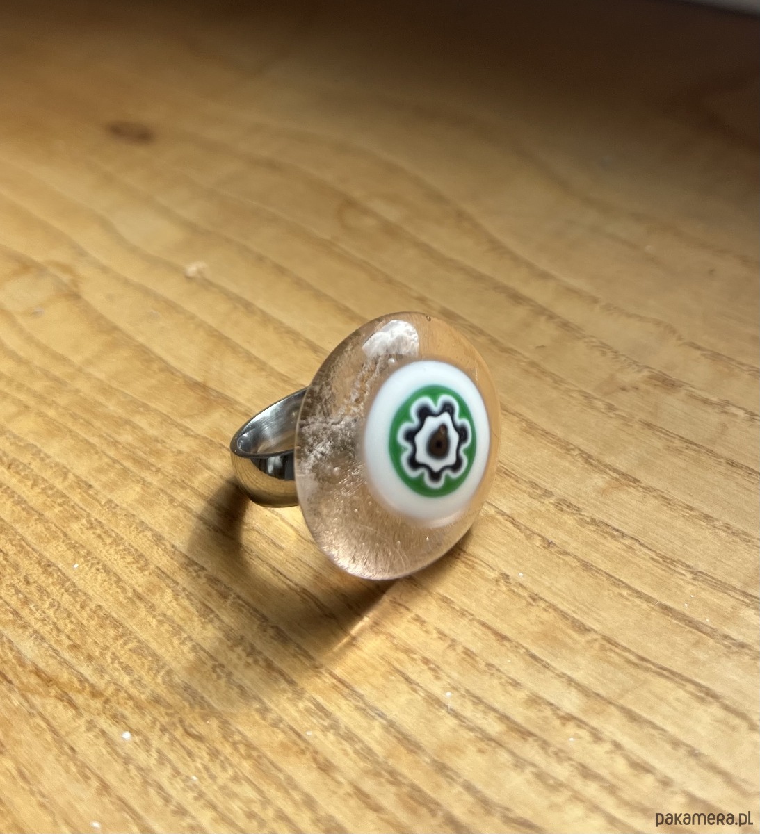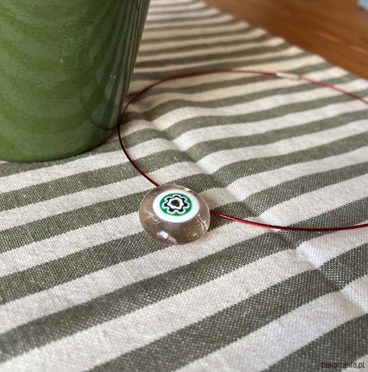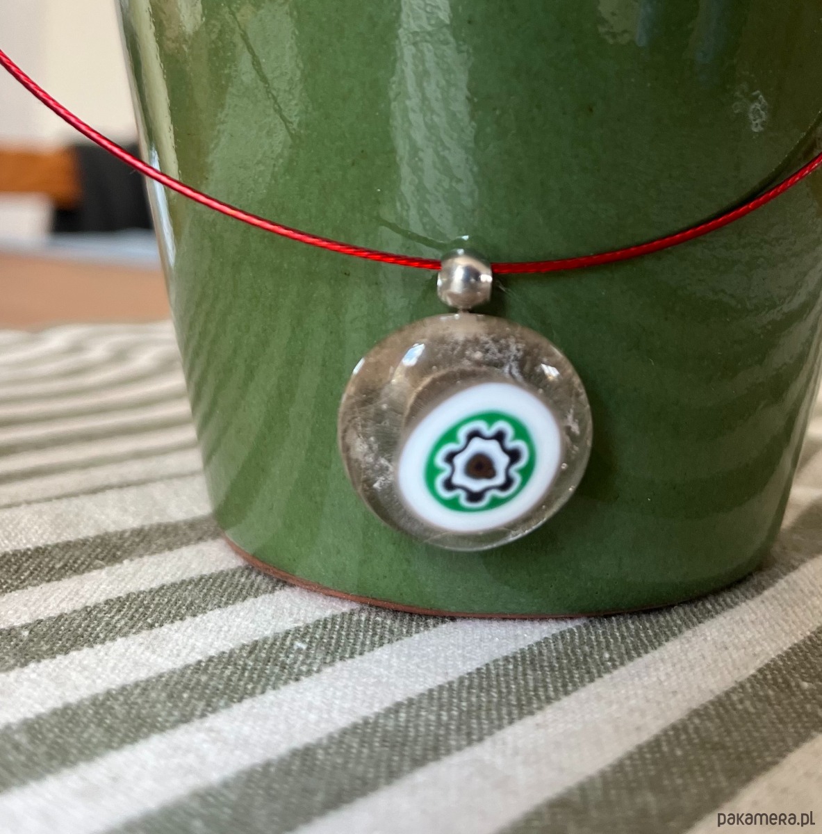 Naszyjnik z ręcznie wykonanym unikalnym oczkiem z włoskiego szkła. Średnica wymiennego oczka w najszerszym miejscu 2,9 cm. Oczko wkręcone (wymienne) do zawieszki ze stali szlachetnej. Zawieszone na lince jubilerskiej o kolorze czerwonym. Oczka można użyć też do pierścionka. Na trzecim zdjęciu widać jak wygląda oczko w pierścionku. Obrączkę do pierścionka można dokupić, w takim przypadku proszę o kontakt, wystawię jako zamówienie specjalne :) Zamówienie wysyłam w firmowym pudełeczku.