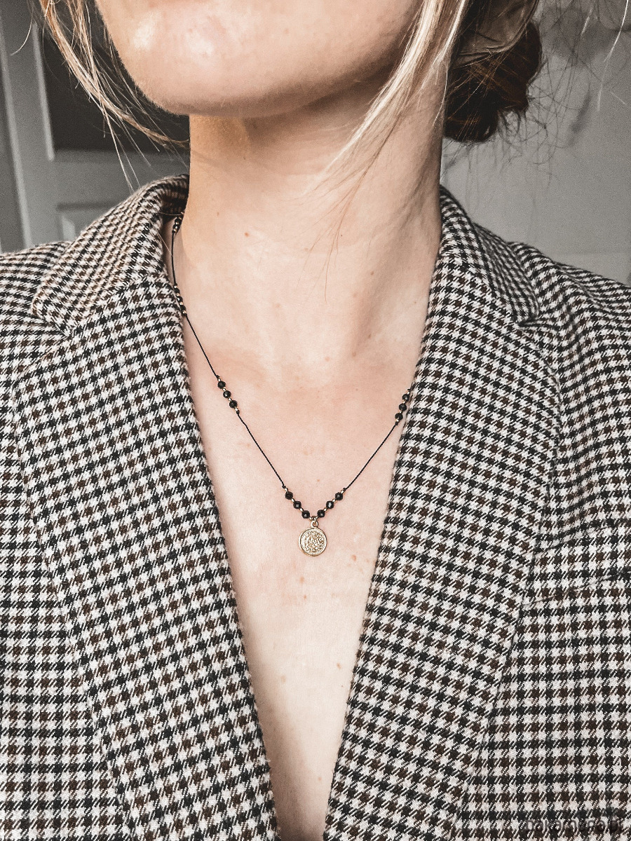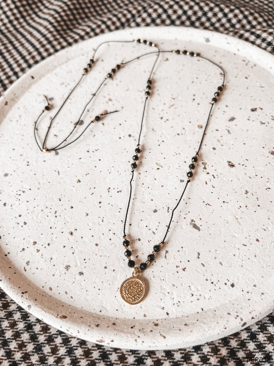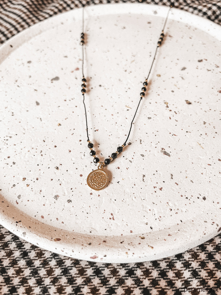 Naszyjnik wykonany z kamieni czarnego turmalinu oraz zawieszki i koralików próby 925 pozłacanych 24K złotem. Eleganckie i ponadczasowe połączenie czerni i złota zachwyca swym blaskiem a zarazem prostotą.
