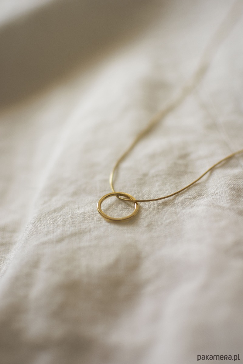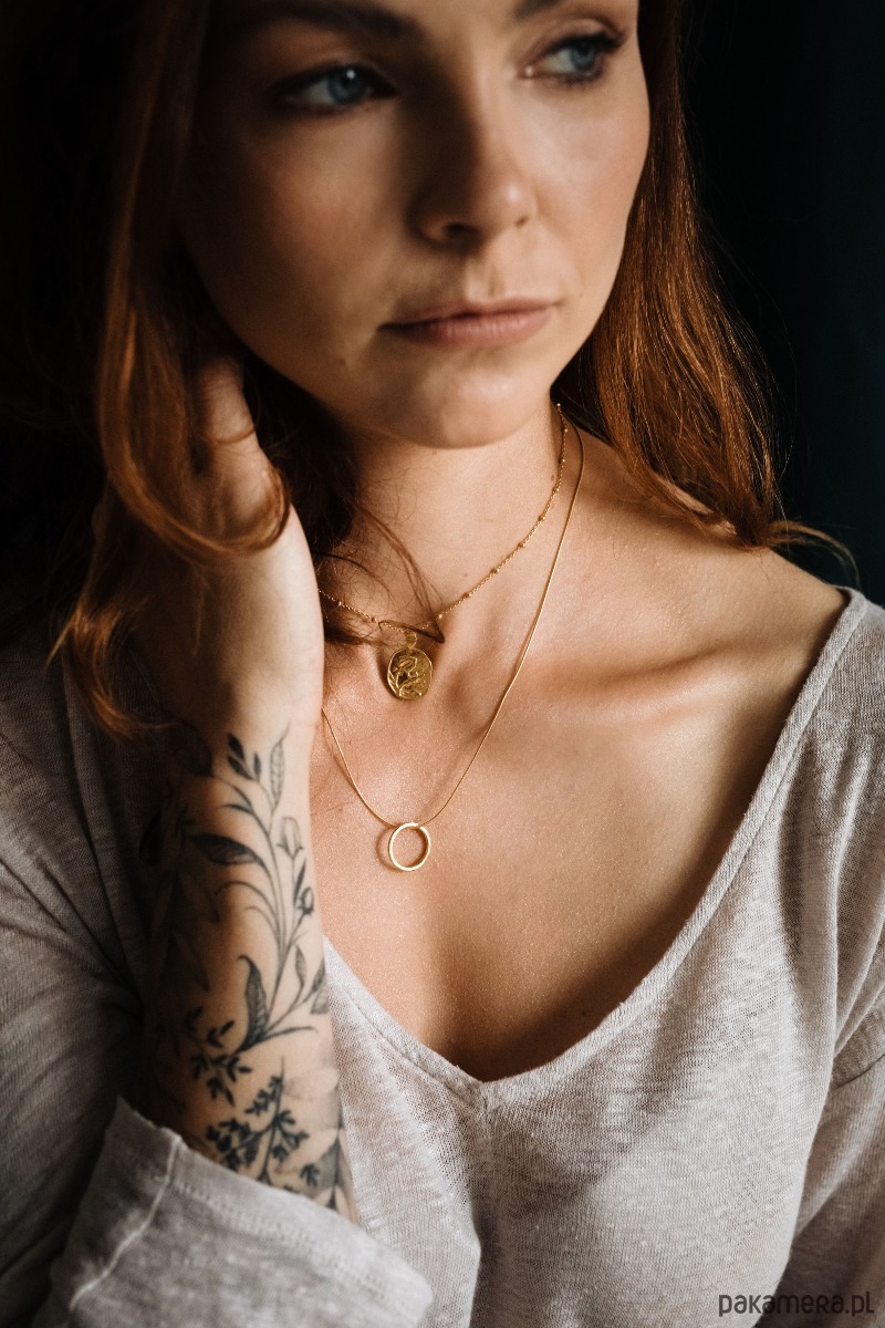 Kółko i łańcuszek wykonane są ze srebra próby 925 pokrytego 24-karatowym złotem. Kółko ma średnicę 16 mm. Łańcuszek ma długość 42 cm a przedłużka, to dodatkowe 3,5 cm. Naszyjnik nie zawiera uczulającego niklu.