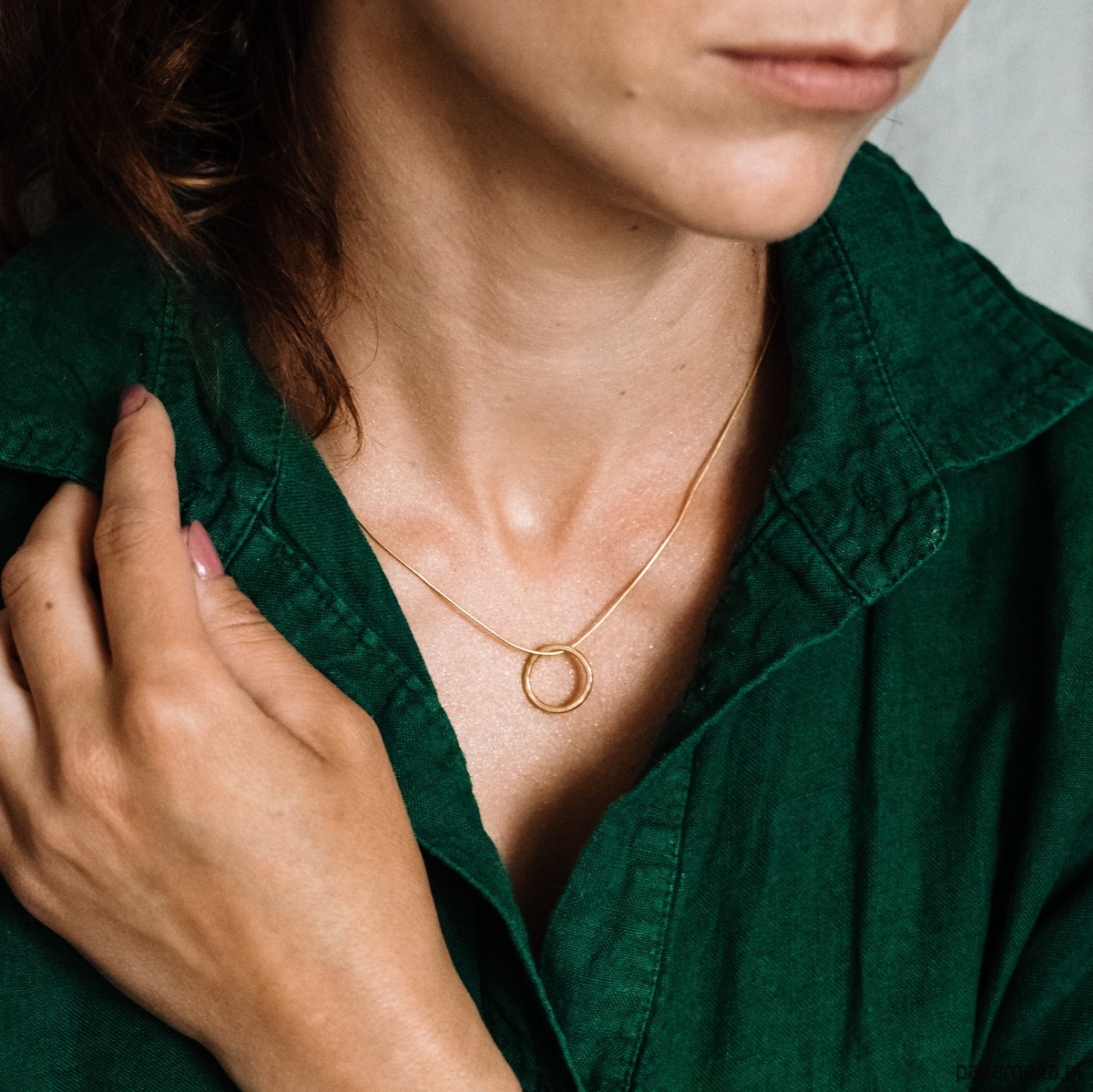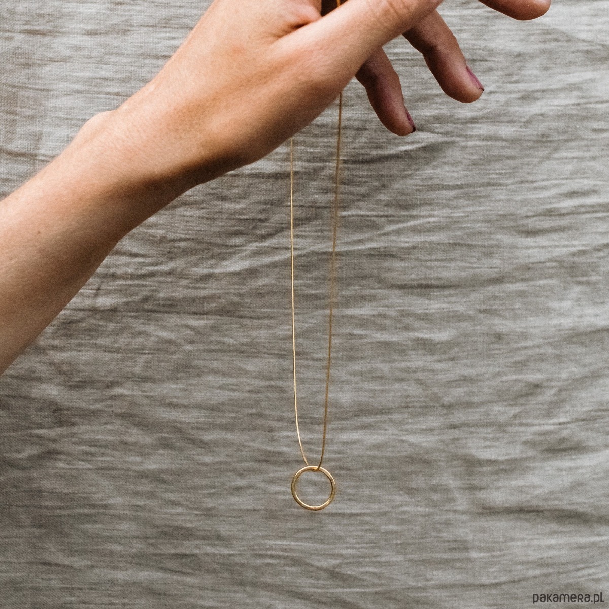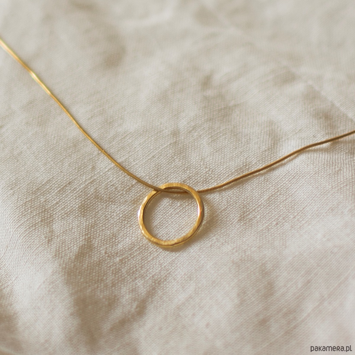 Subtelny naszyjnik KOŁO jest wyrazem miłości do letnich wędrówek. Od chorwackich wybrzeży po szczyty Tatr będzie symbolem eskapad, w których najlepszym przystankiem są ciepłe od słońca skały pachnące ziemią, ziołami i pierwotną energią. Kółko jest ręcznie młotkowane, co nadaje mu surowej, nieregularnej faktury. Zawieszone jest na aksamitnym łańcuszku typu “wężyk”. Pięknie prezentuje się zarówno z solo jak i w zestawie z naszyjnikiem “Lipa” i regulowanym kamiennym naszyjnikiem na sznurku. Do kompletu można dobrać kolczyki, również z motywem koła.