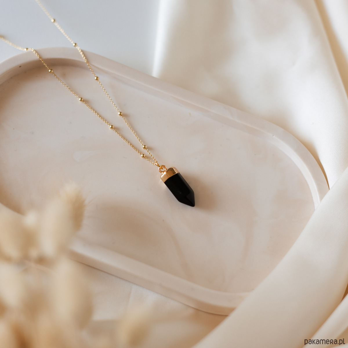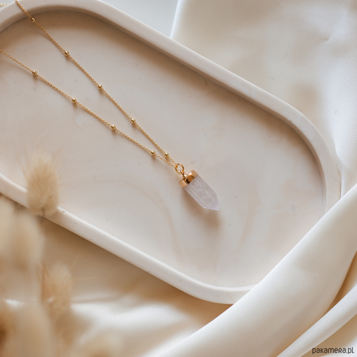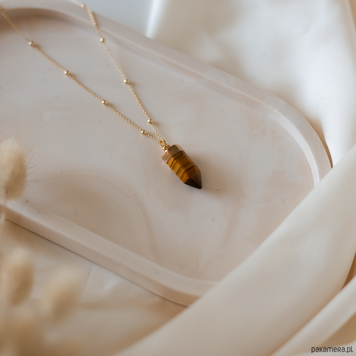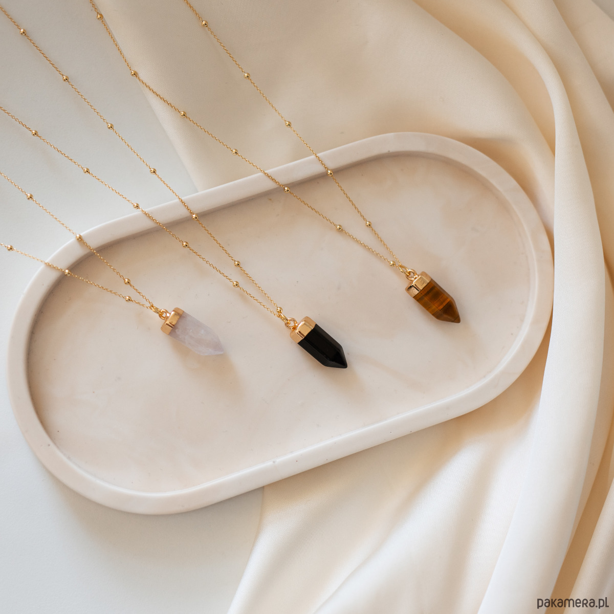 Wyjątkowy naszyjnik z zawieszką z kamienia naturalnego. Srebrny, pozłacany łańcuszek z przedłużką to ponadczasowa klasyka, która będzie pasować na wiele okazji. Zawieszka wykonana z naturalnego kamienia, w kształcie słupka w grocie ze stopu metali w kolorze złotym. Dostępne są trzy rodzaje kamieni :