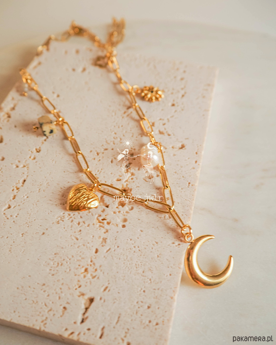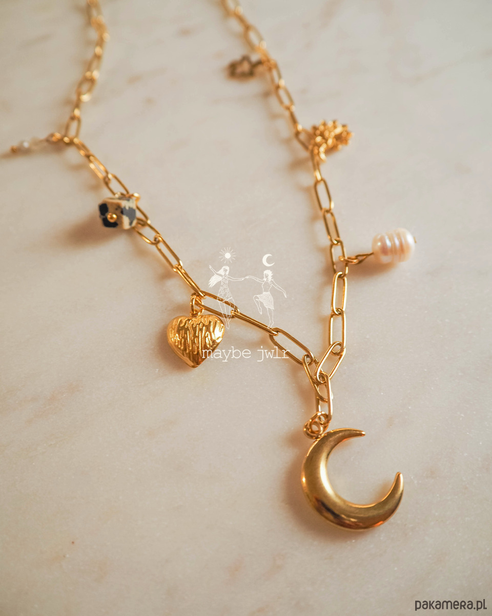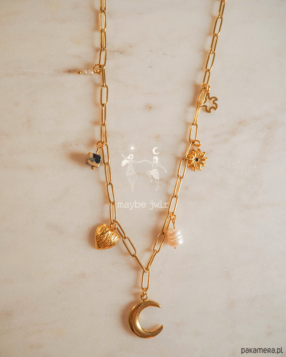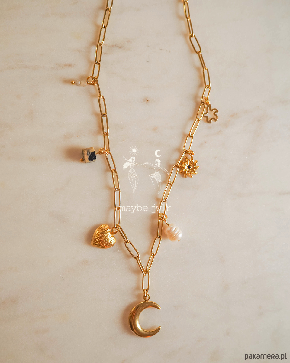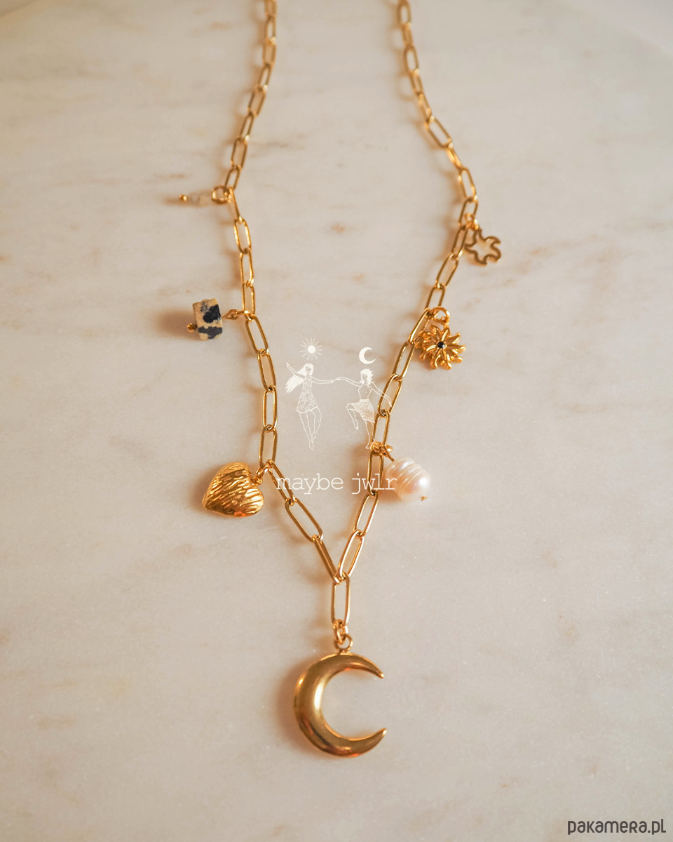 Delikatnie połyskujący łańcuszek o ogniwach typu spinacz to nowoczesna forma klasyki – lekka, modna i niezwykle kobieca. Z jego ogniw zwisają zawieszki, które dodają naszyjnikowi wyjątkowego charakteru i odrobiny artystycznej duszy.