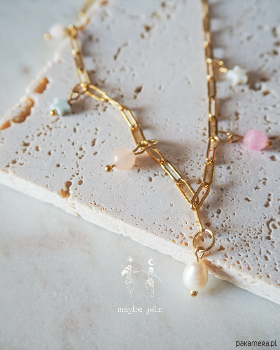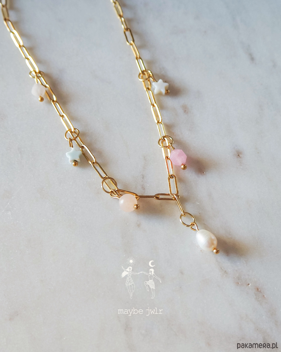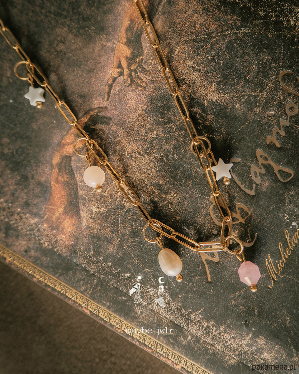 Delikatnie połyskujący łańcuszek o ogniwach typu spinacz to nowoczesna forma klasyki – lekka, modna i niezwykle kobieca. Z jego ogniw zwisają ręcznie wykonane zawieszki z naturalnych kamieni, które dodają naszyjnikowi wyjątkowego charakteru i odrobiny artystycznej duszy.