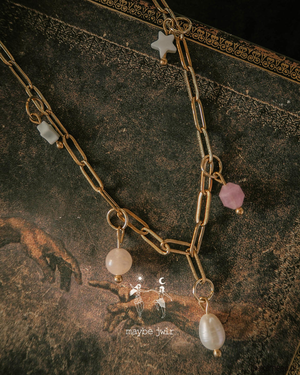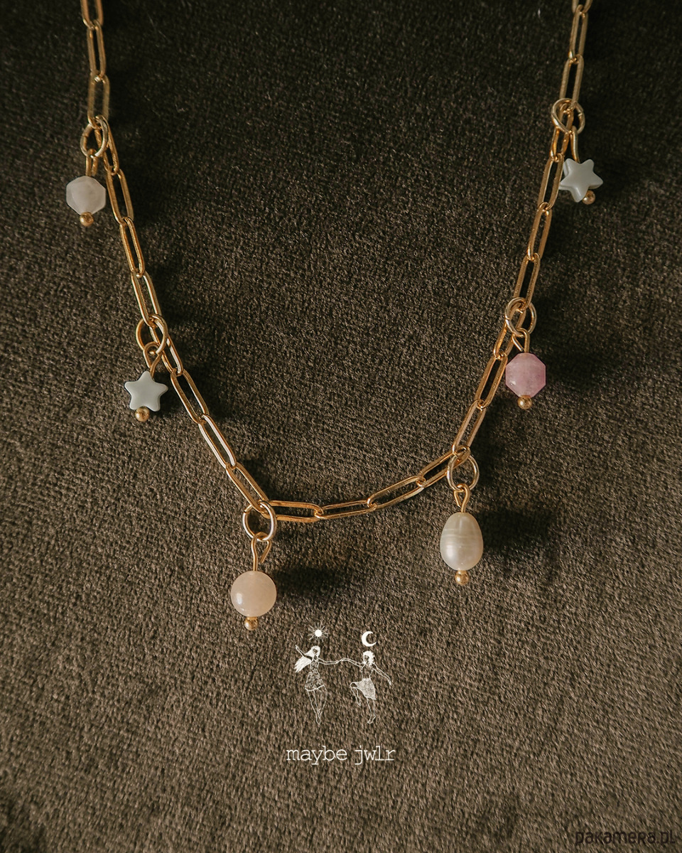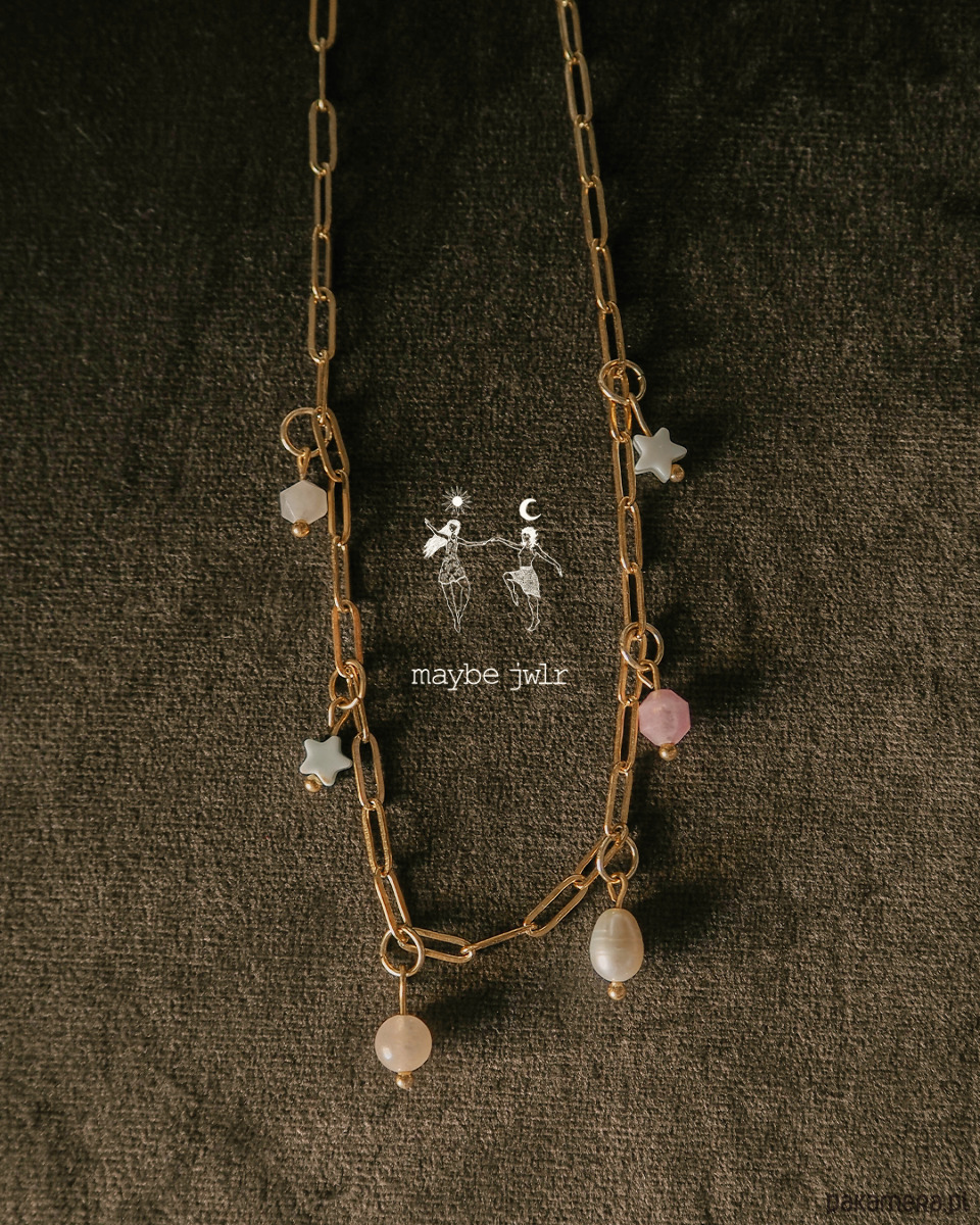 Delikatnie połyskujący łańcuszek o ogniwach typu spinacz to nowoczesna forma klasyki – lekka, modna i niezwykle kobieca. Z jego ogniw zwisają ręcznie wykonane zawieszki z naturalnych kamieni, które dodają naszyjnikowi wyjątkowego charakteru i odrobiny artystycznej duszy.