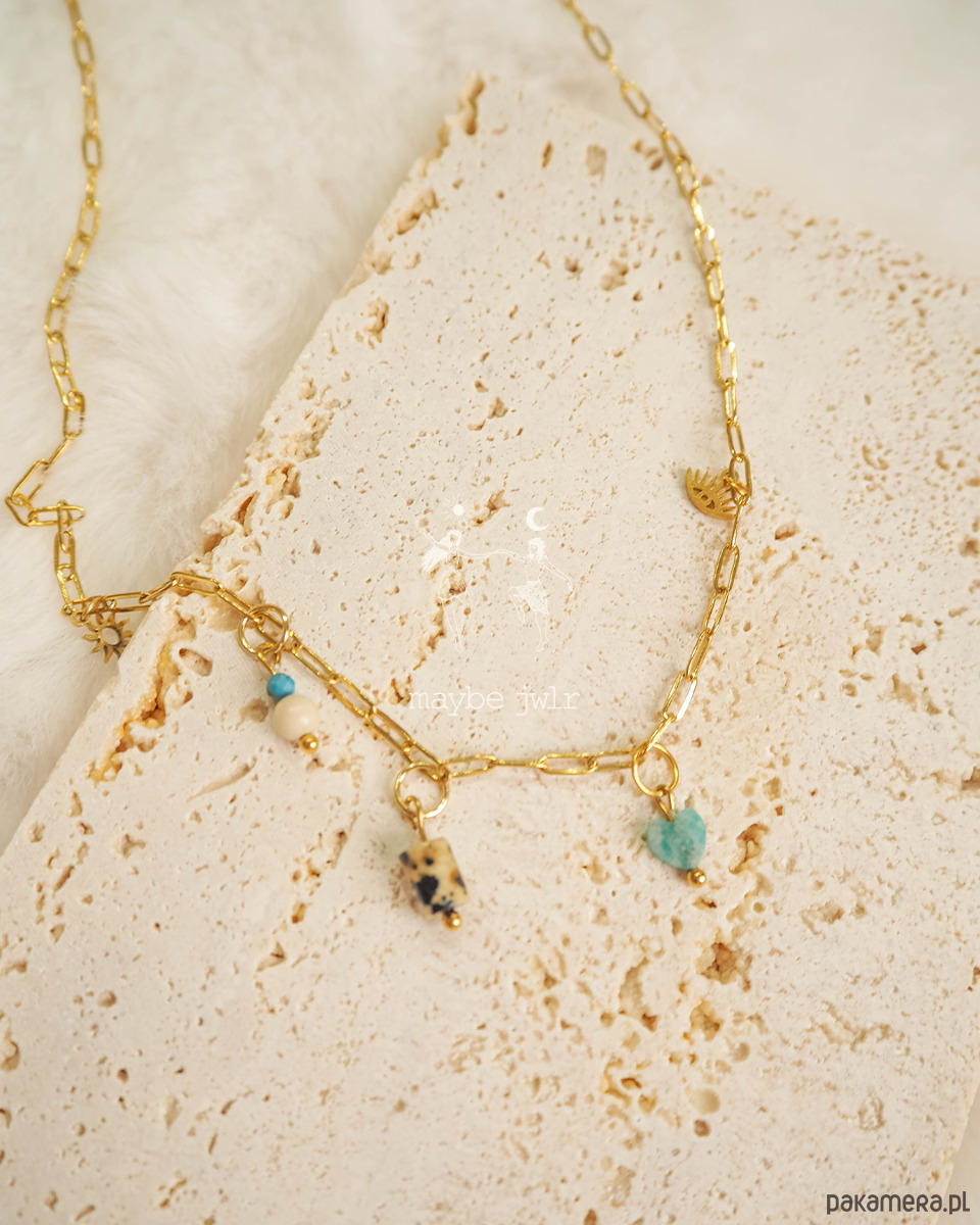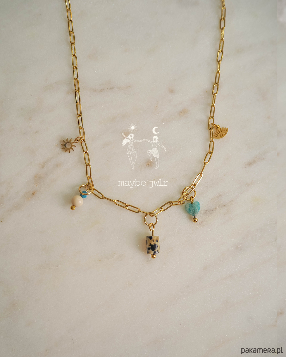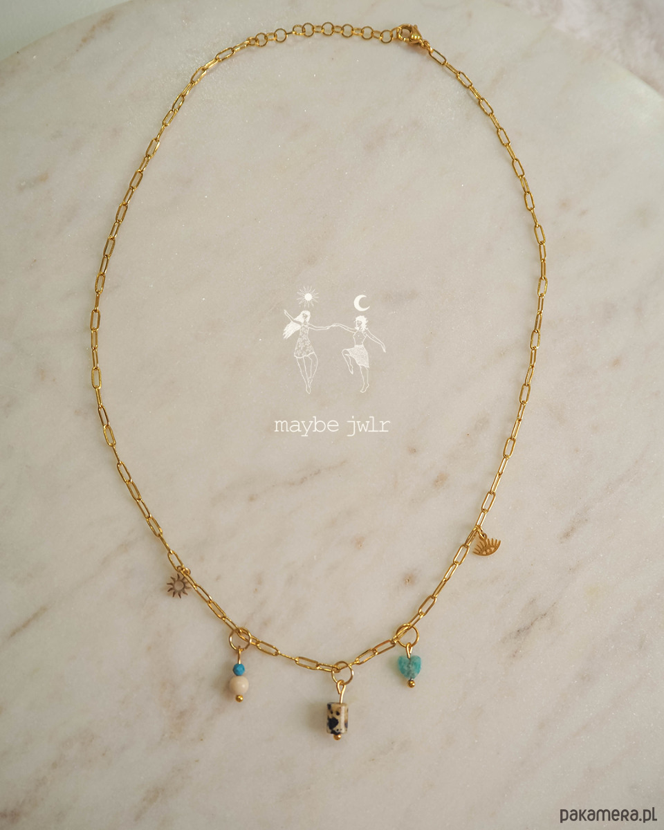Delikatnie połyskujący łańcuszek o ogniwach typu mini spinacz to nowoczesna forma klasyki – lekka, modna i niezwykle kobieca. Z jego ogniw zwisają ręcznie wykonane zawieszki z naturalnych kamieni, które dodają naszyjnikowi wyjątkowego charakteru i odrobiny artystycznej duszy.
