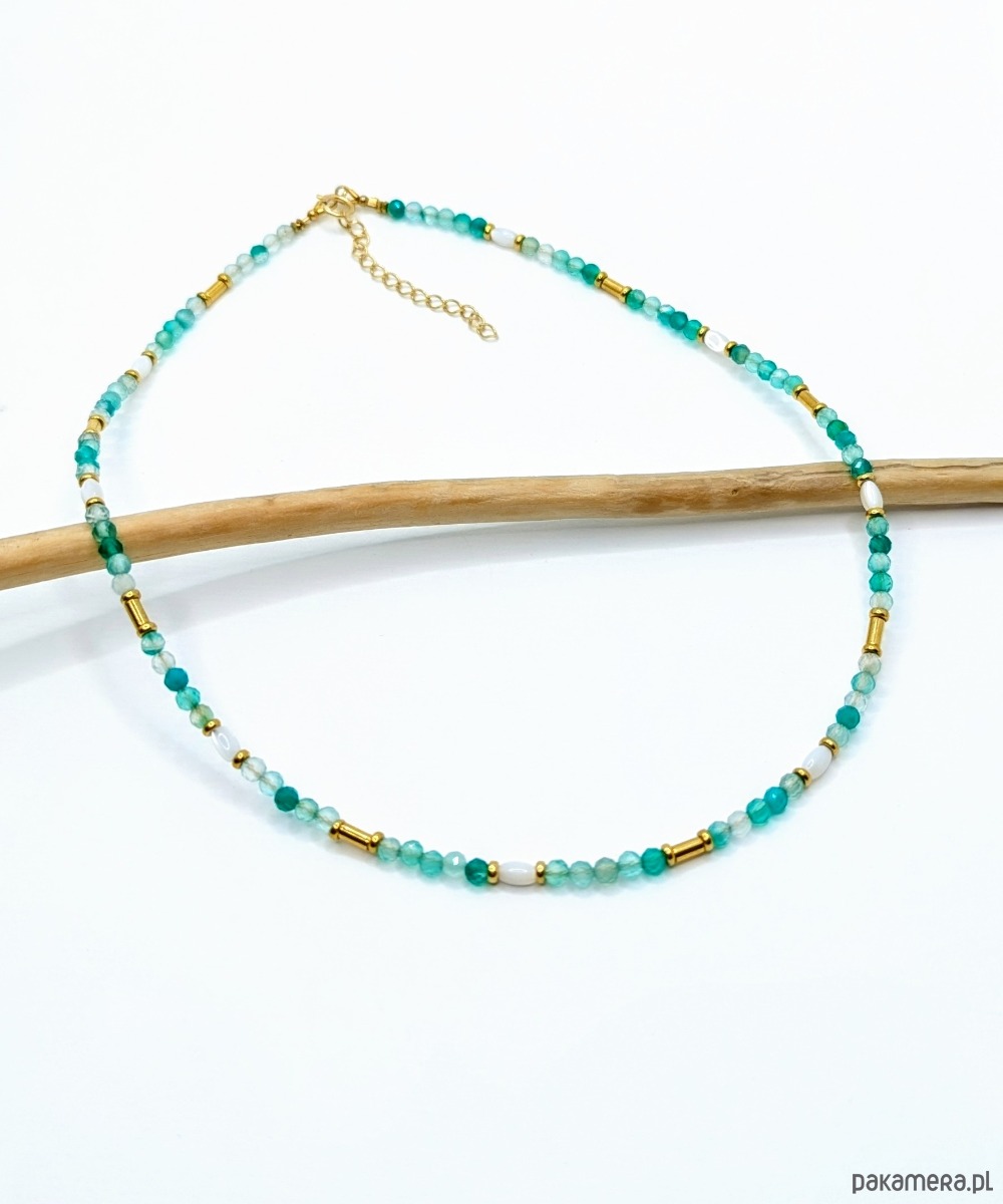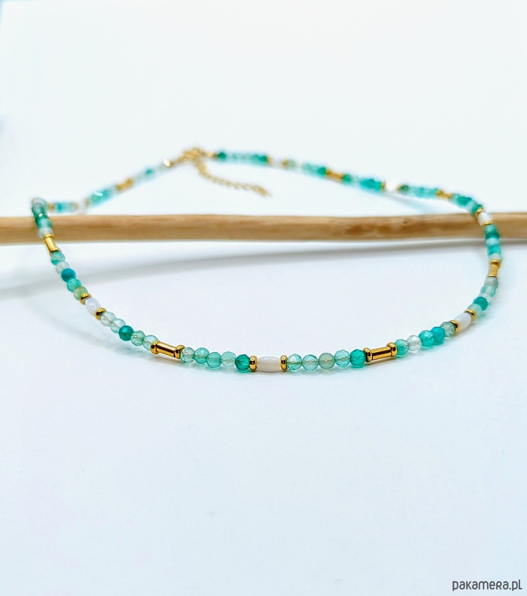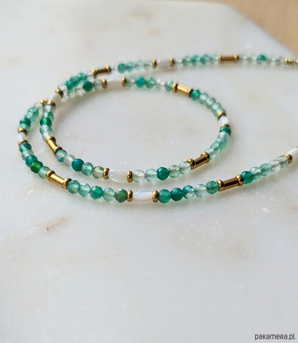 Świetlisty, wiosenny naszyjnik z klarownych kamieni zielonego onyksu. Kamyki są drobne, fasetowane, przepuszczają światło. Przekładany drobnymi oliwkami lśniącej muszli oraz galwanizowanego na złoto hematytu. Naszyjnik jest w formie delikatnej obróżki pod szyję.