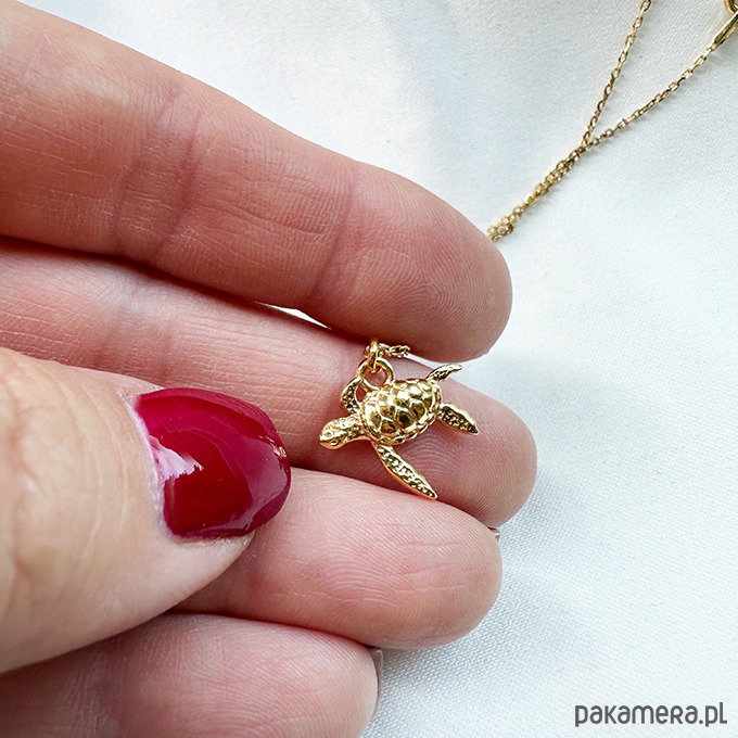 Naszyjnik z pięknym elementem w kształcie małego pływającego żółwia. Wykonany ze srebra próby 925 złocona 24 k złotem.