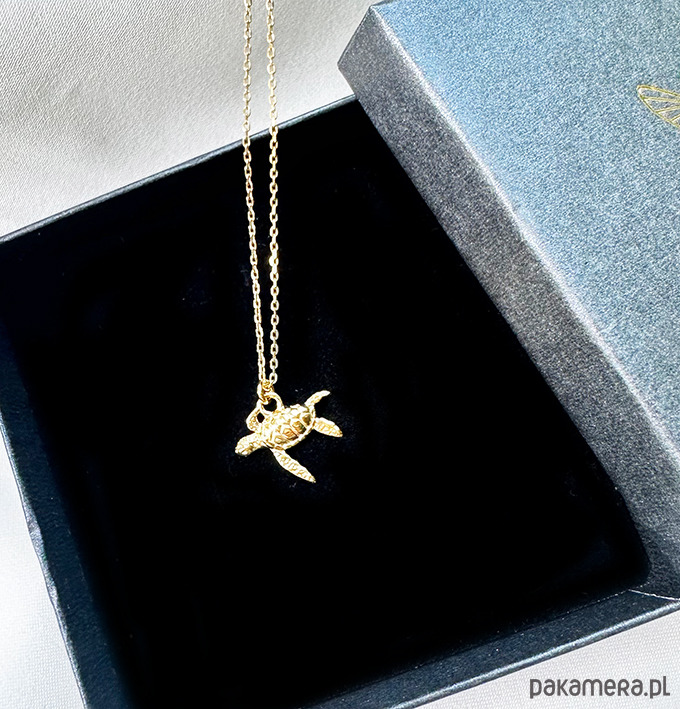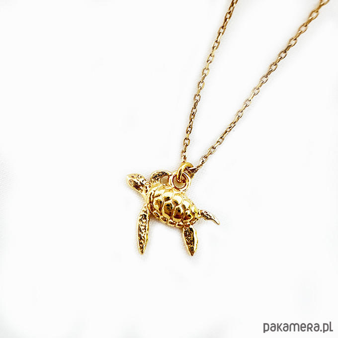 Naszyjnik z pięknym elementem w kształcie małego pływającego żółwia. Wykonany ze srebra próby 925 złocona 24 k złotem.