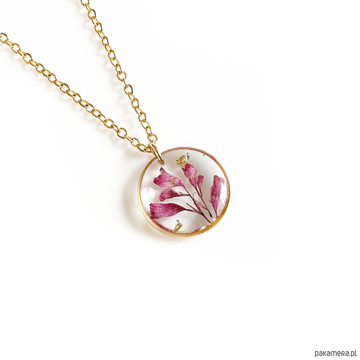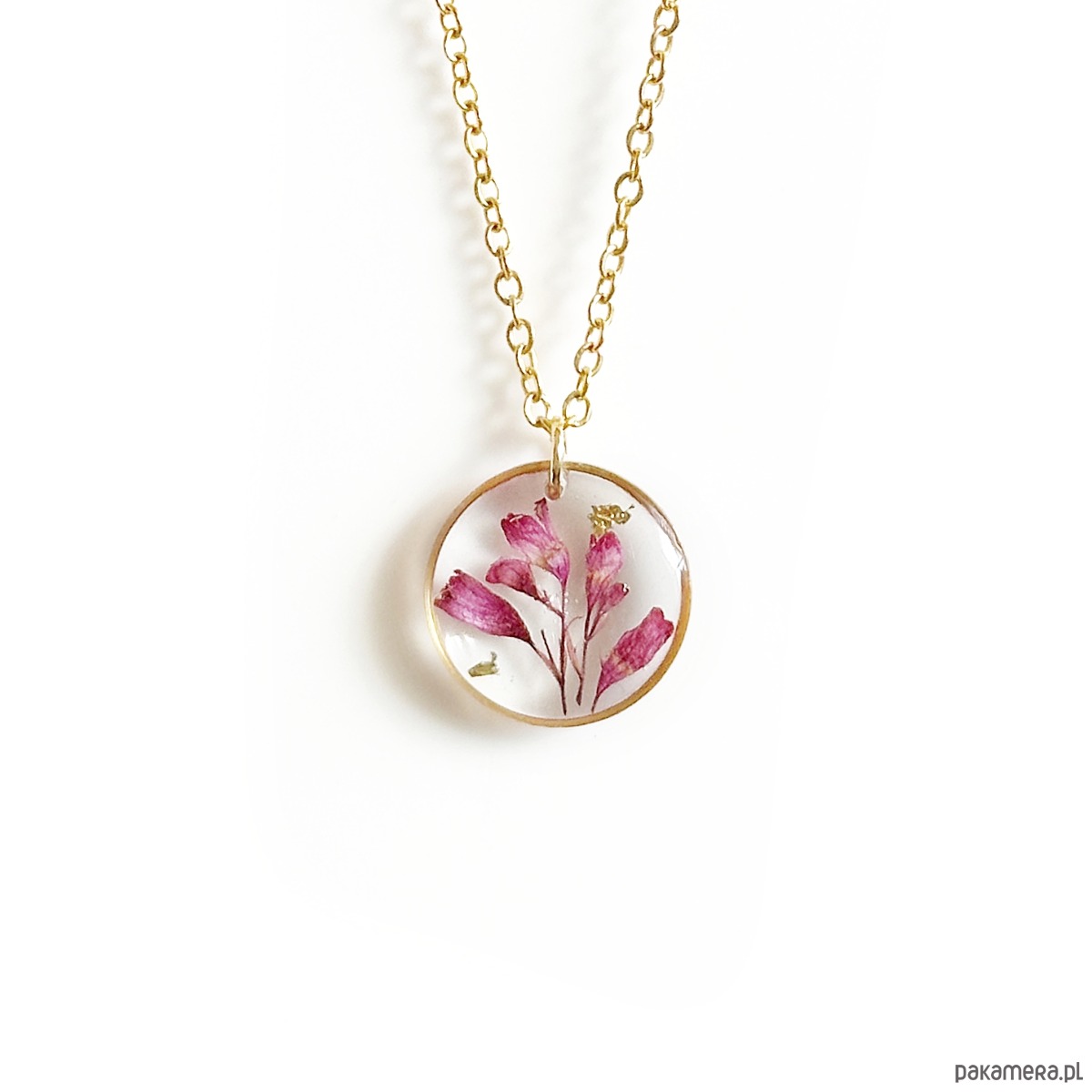 Naszyjnik o wymiarach 1,6cm. Zostały w nim zatopione kwiaty żurawki.