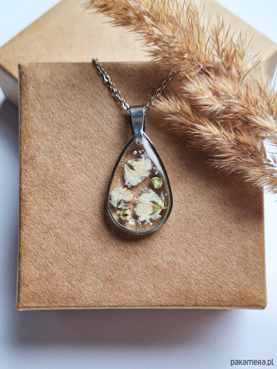 Uroczy wisiorek w kształcie łezki z zatopionymi kwiatami białej gipsówki i płatkami srebra. Wykonany z wysokiej klasy żywicy, która nie zmienia koloru pod wpływem promieniowania uv oraz wysokiej jakości stali chirurgicznej.
