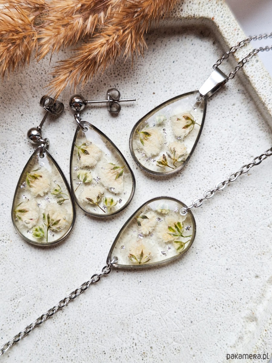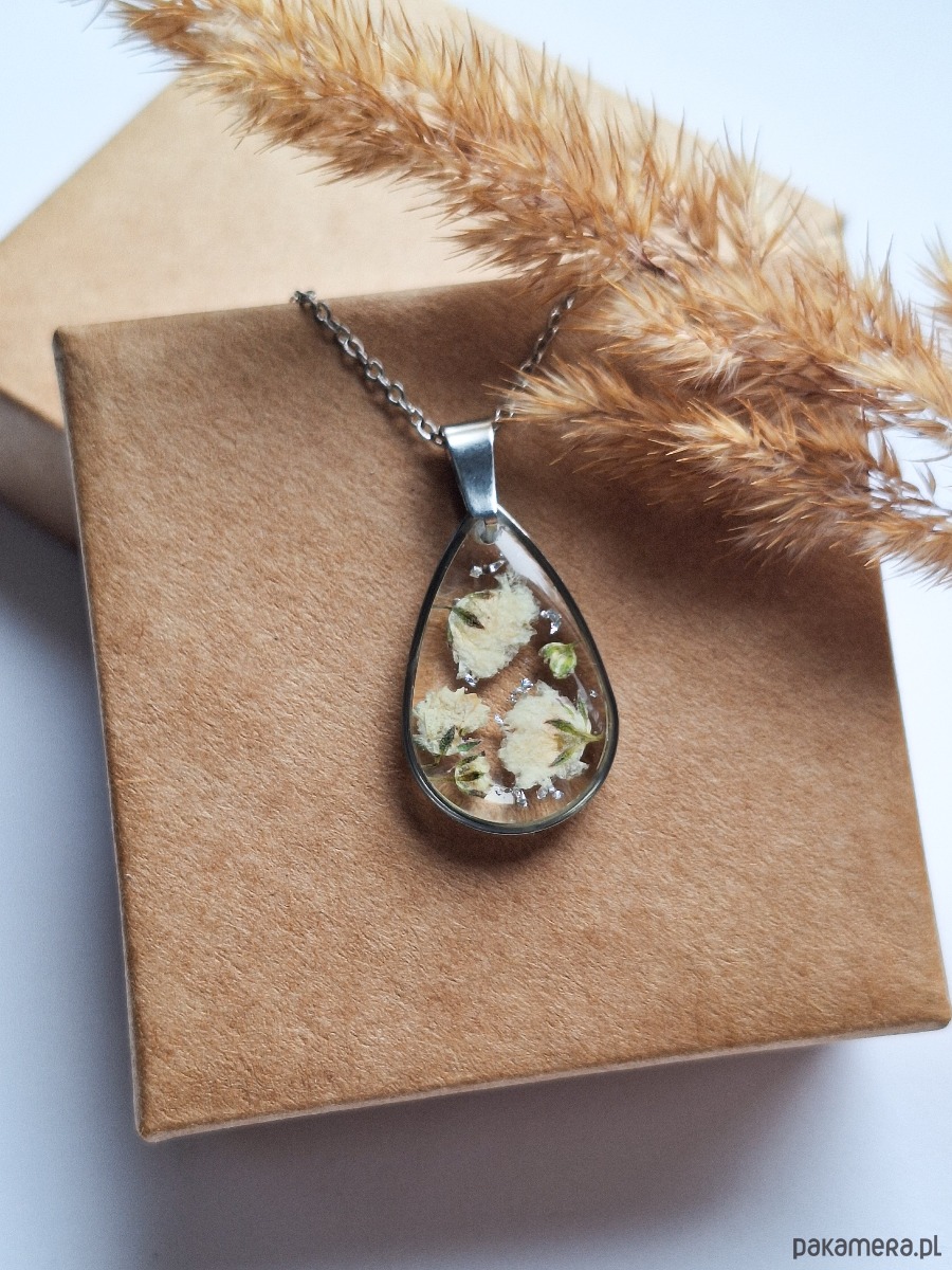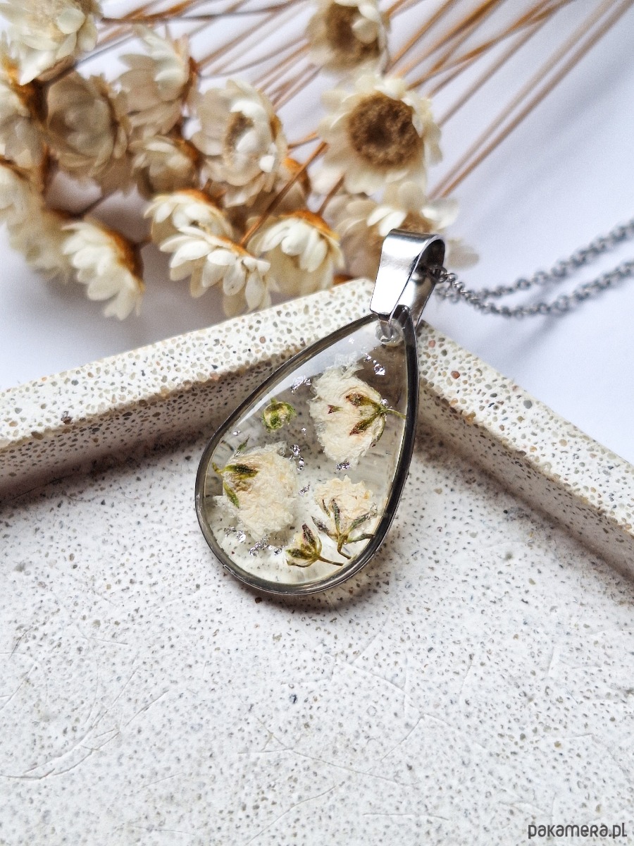 Naszyjnik z żywicy łezka srebrny kwiaty białej gipsówki