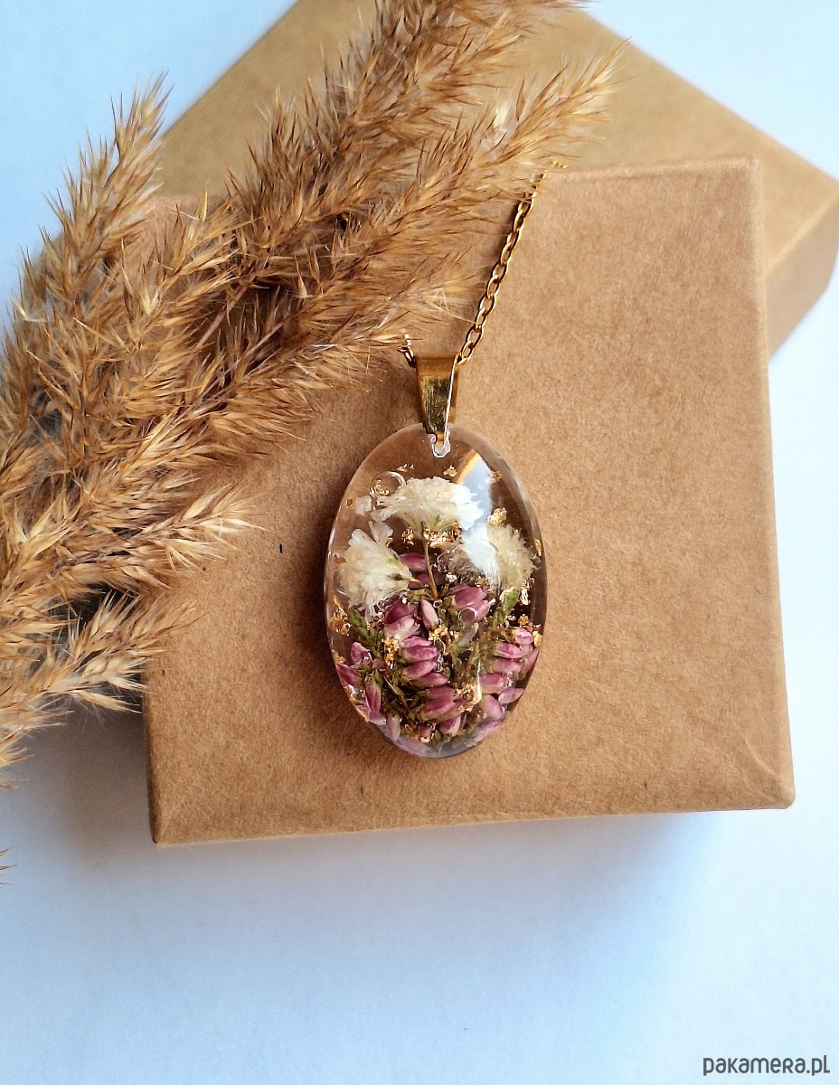 Uroczy wisiorek z zatopionymi kwiatami białej gipsówki, wrzosu i płatkami złota. Wykonany z wysokiej klasy żywicy, która nie zmienia koloru pod wpływem promieniowania uv oraz wysokiej jakości stali chirurgicznej.