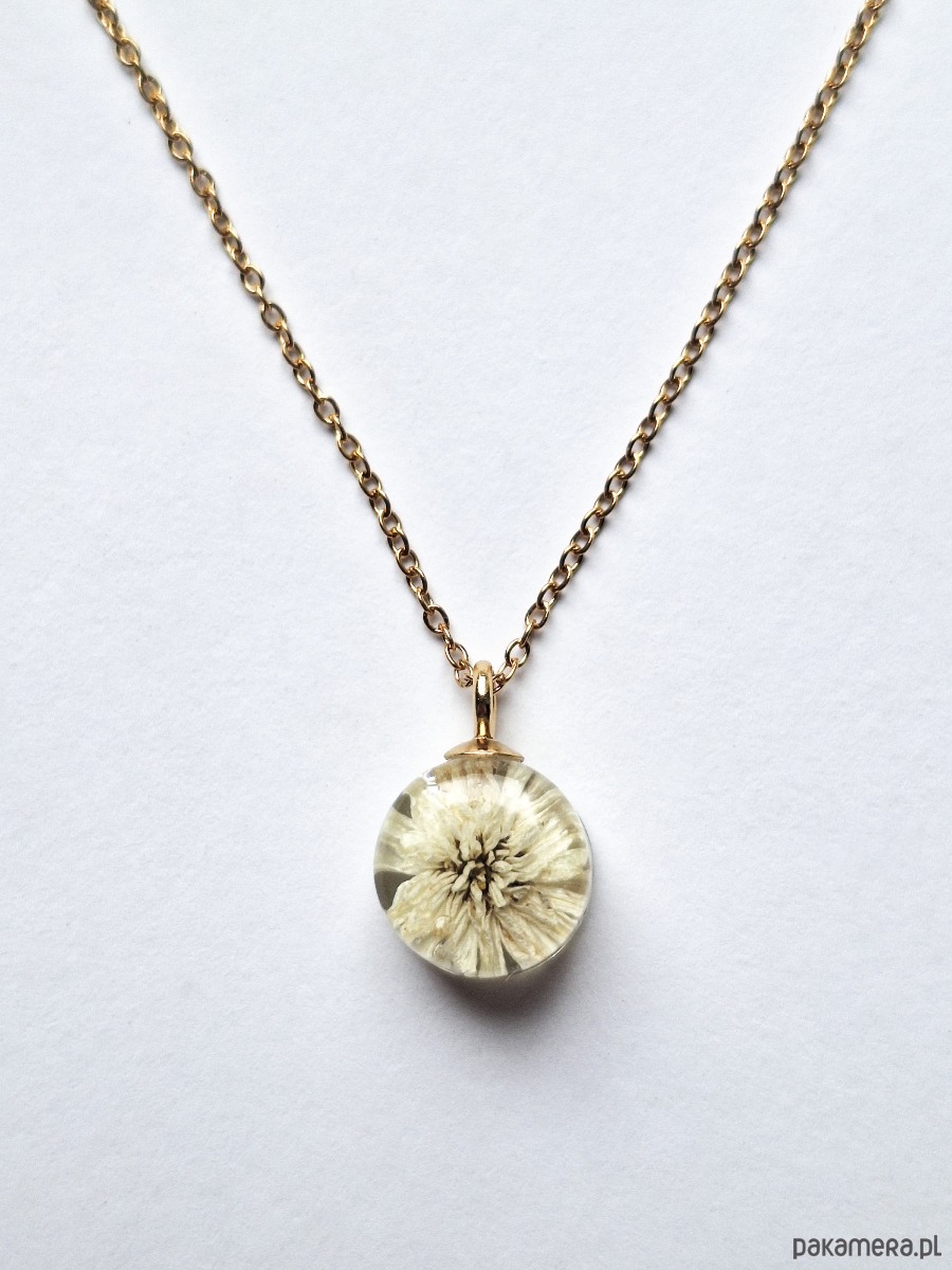 Uroczy wisiorek z zatopionym kwiatem krwawnika. Wykonany z wysokiej klasy żywicy, która nie zmienia koloru pod wpływem promieniowania UV oraz wysokiej jakości stali chirurgicznej.
