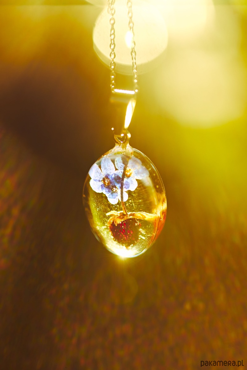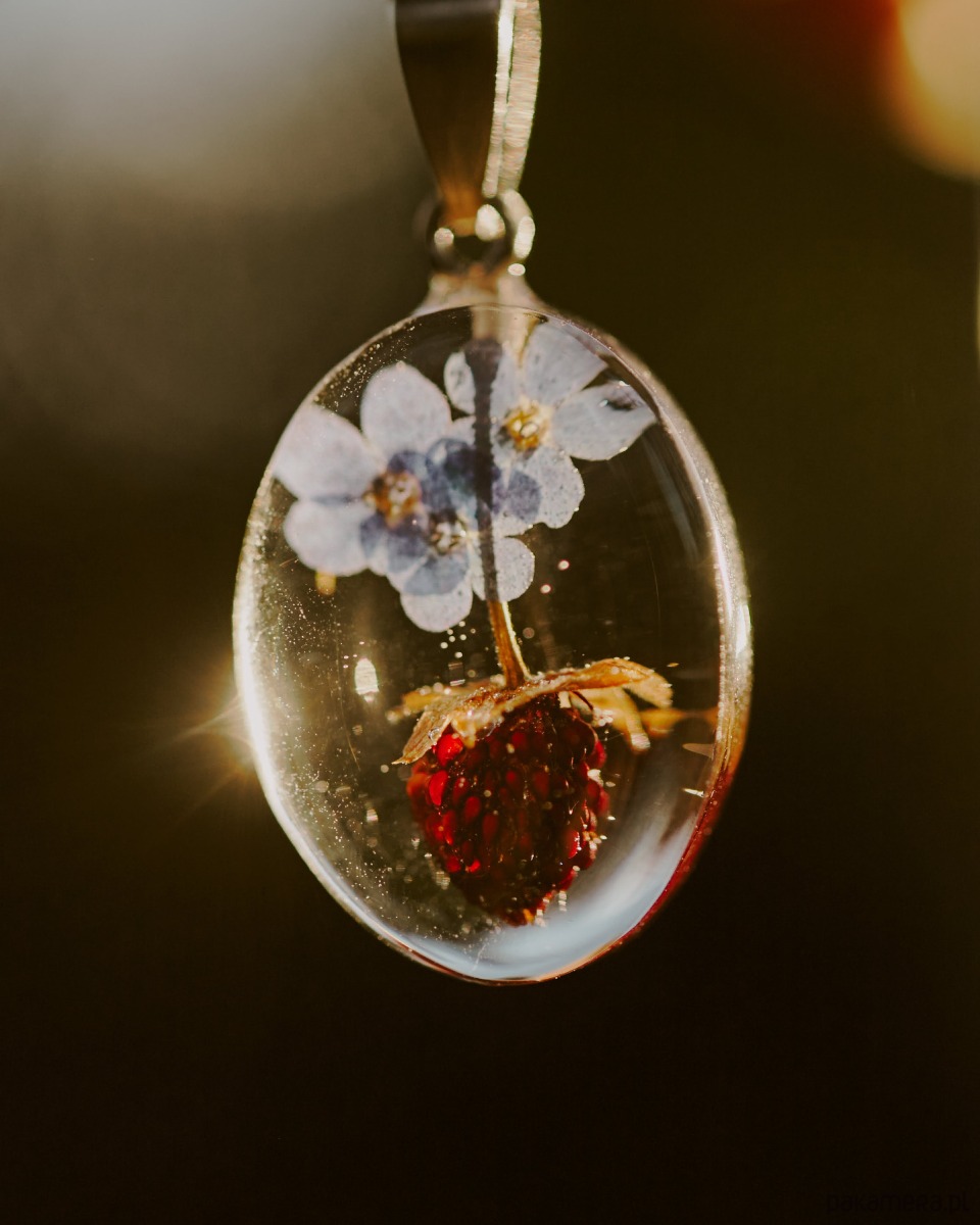 Naszyjnik z żywicy z niezapominajkami i poziomką