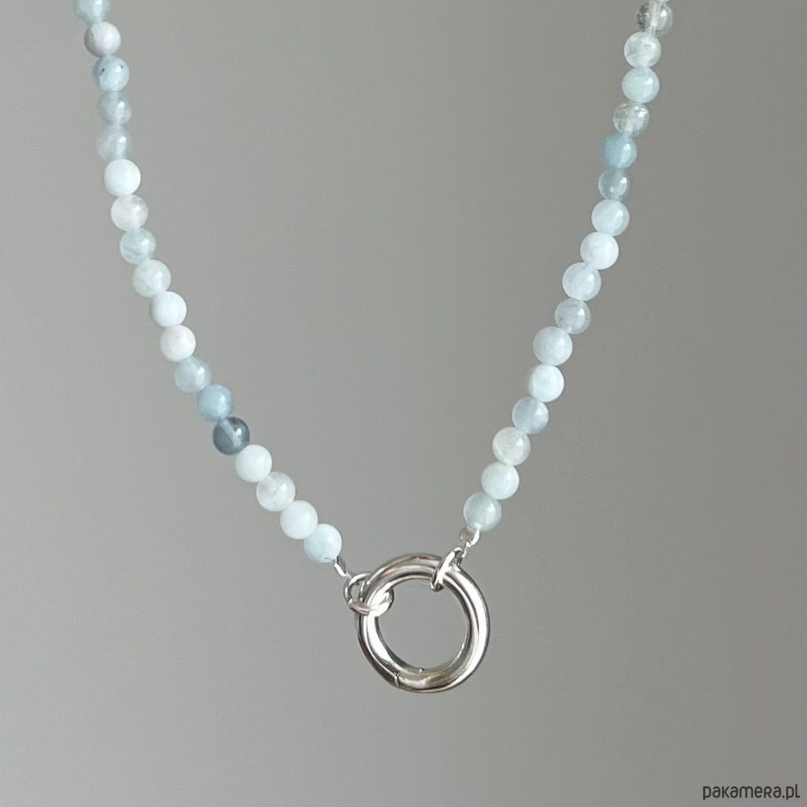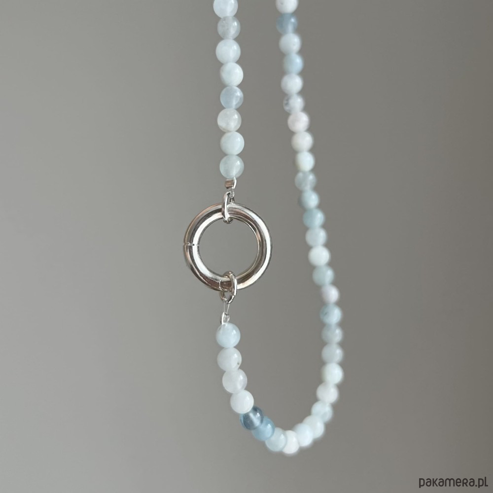 Naszyjnik z naturalnego akwamarynu w odcieniu spokojnego błękitu. Zakończony charakterystycznym zapięciem w formie koła dostępny w wersji srebrnej lub srebrne pozłacanej 24 karatowym złotem
