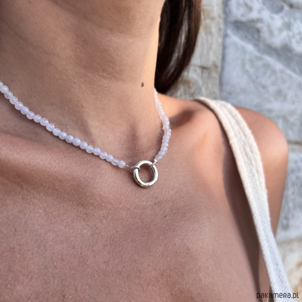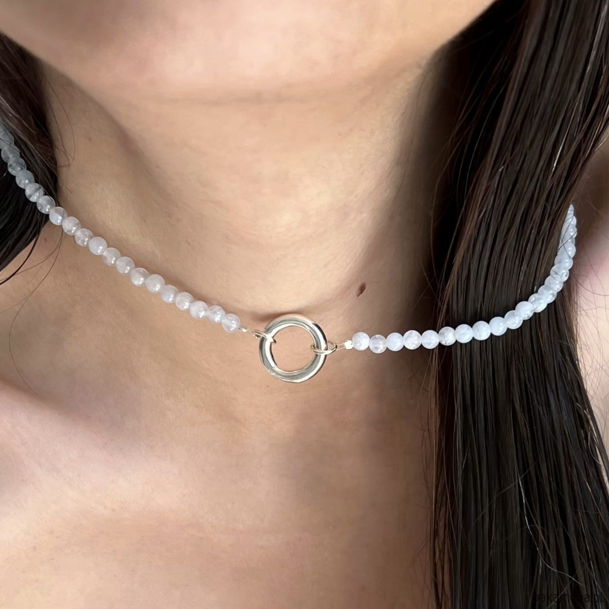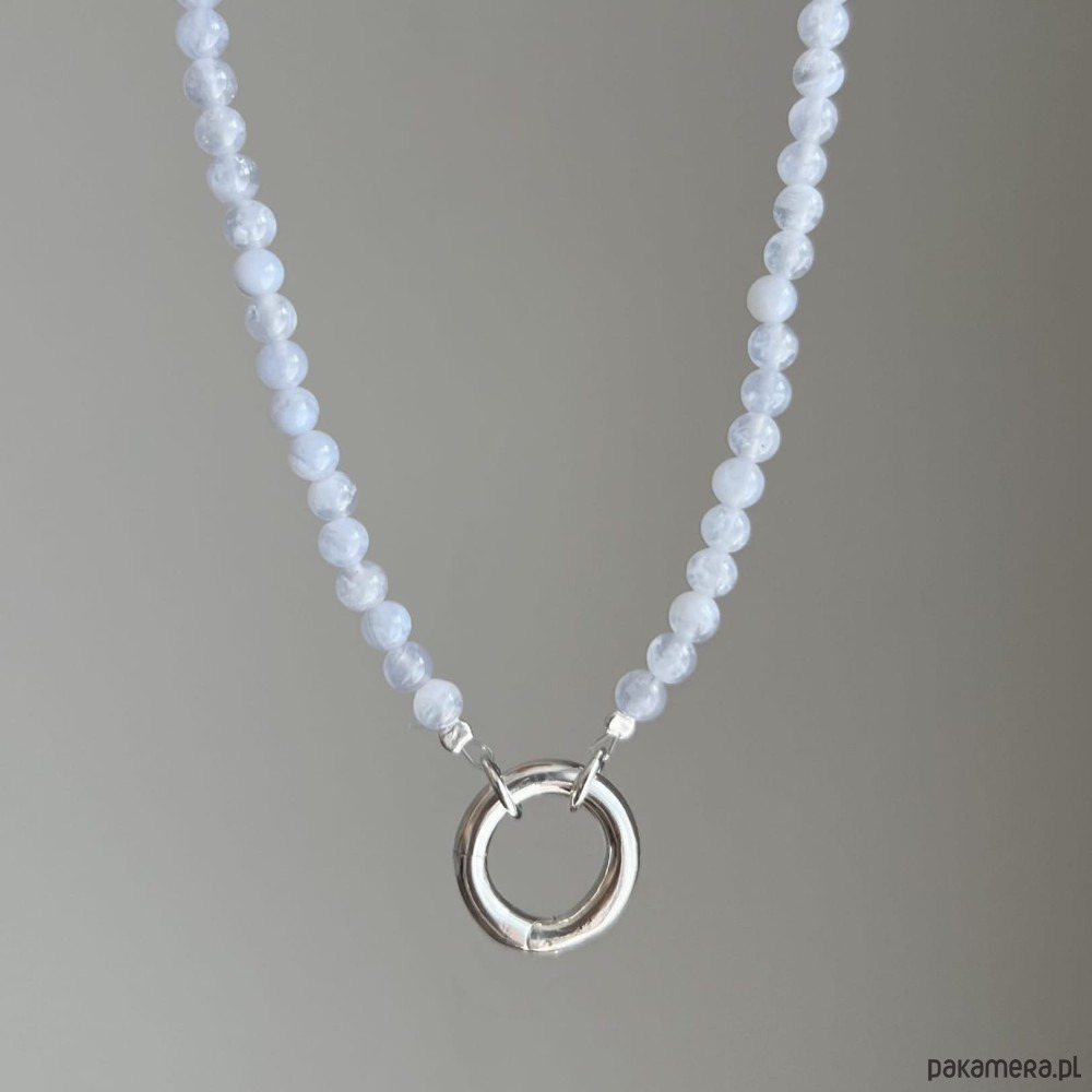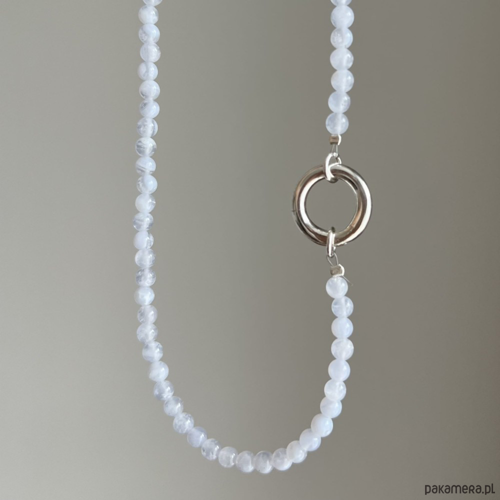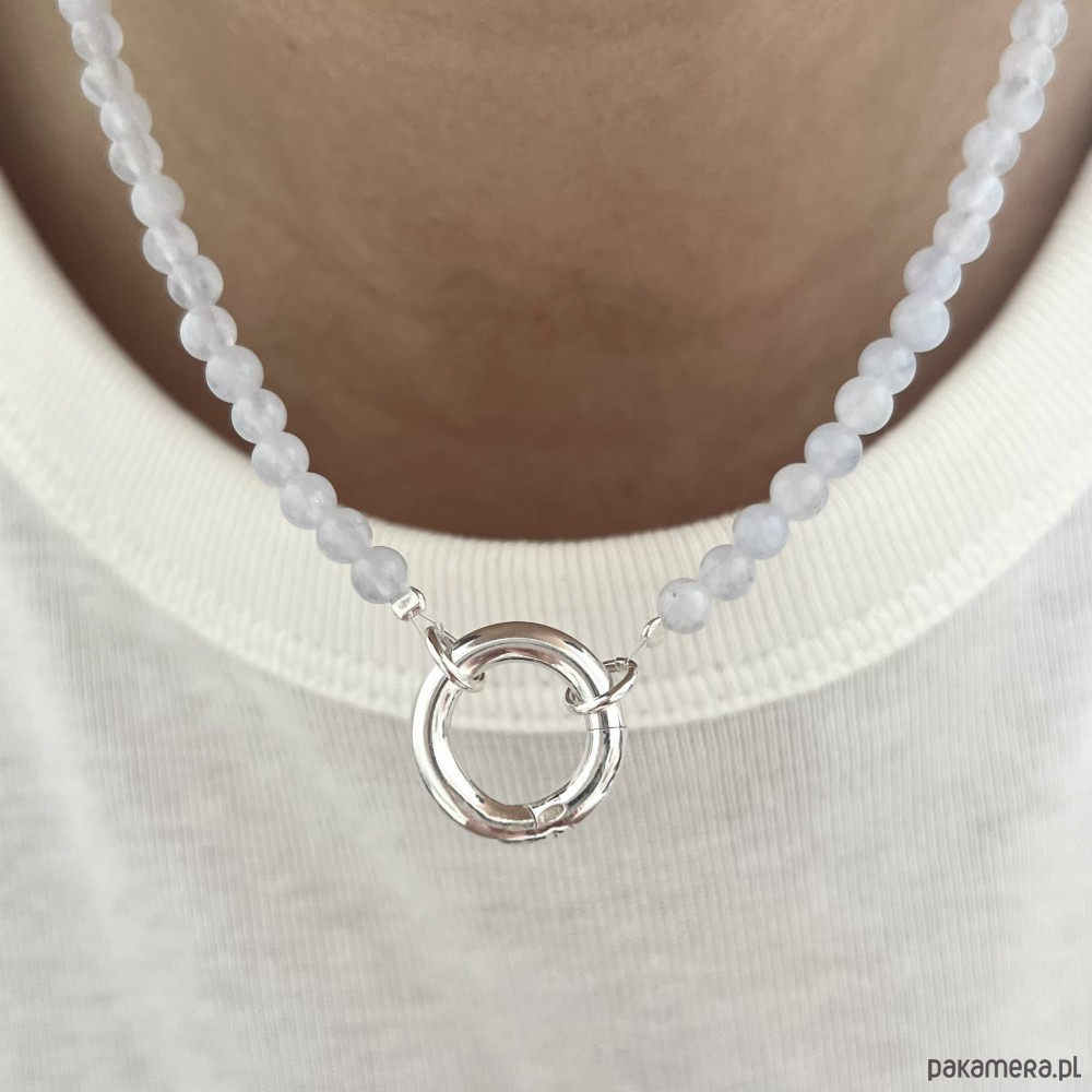 Naszyjnik z naturalnych kamieni chalcedonu w odcieniu jeansowego błękitu, wykończony charakterystycznym srebrnym zapięciem w formie koła dostępny w wersji srebrnej lub srebrne pozłacanej 24 karatowym złotem