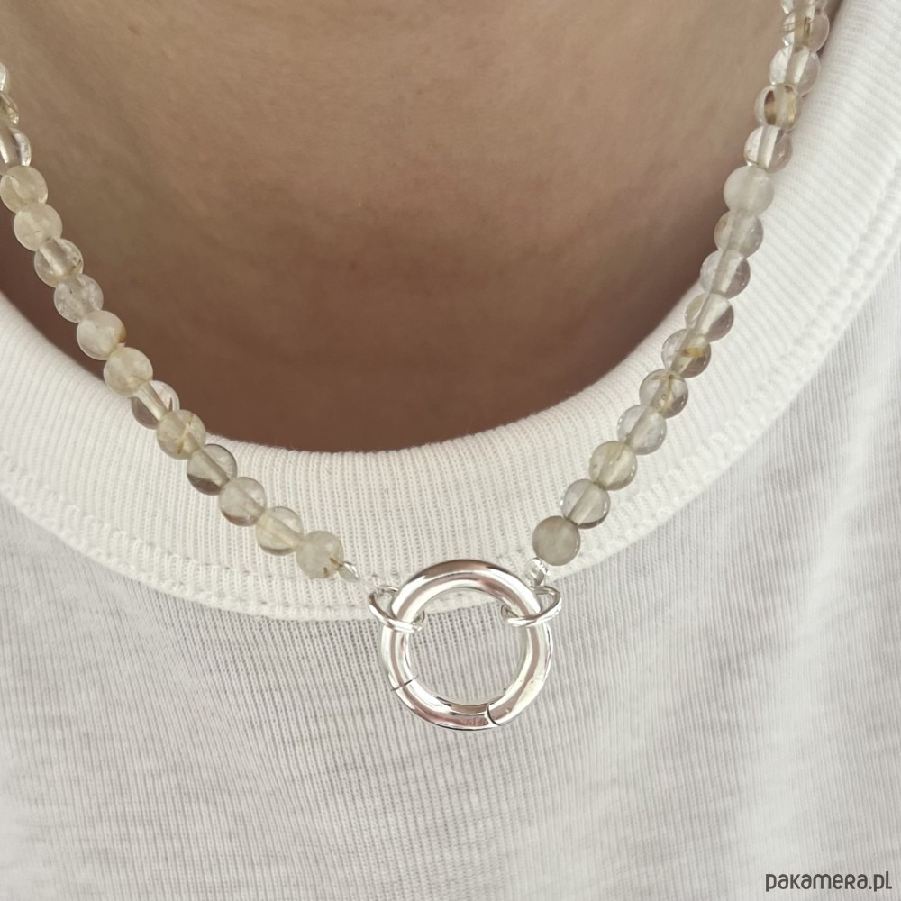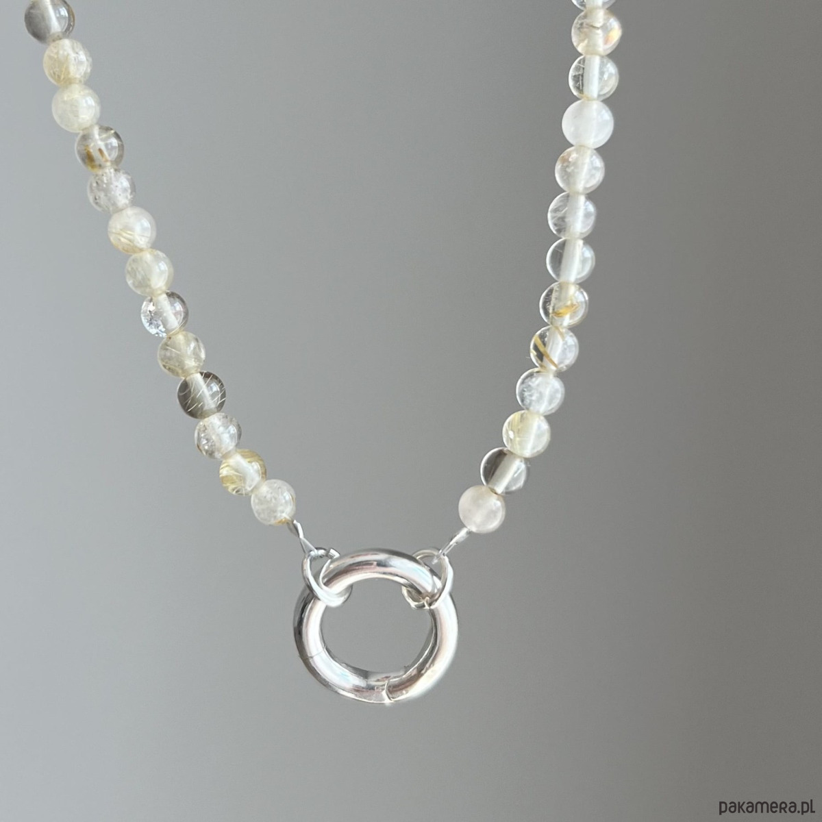 Naszyjnik z kul kwarcu rutylowego ze złotą nitką. Wykończony zapięciem w formie koła ze srebra pozłacanego dostępny w wersji srebrnej lub srebrne pozłacanej 24 karatowym złotem